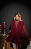 Fustan ne ngjyren vishnje. Fustan i shkurter me krahe te gjate, material dandelle e plote me llastik dhe fund frude.