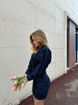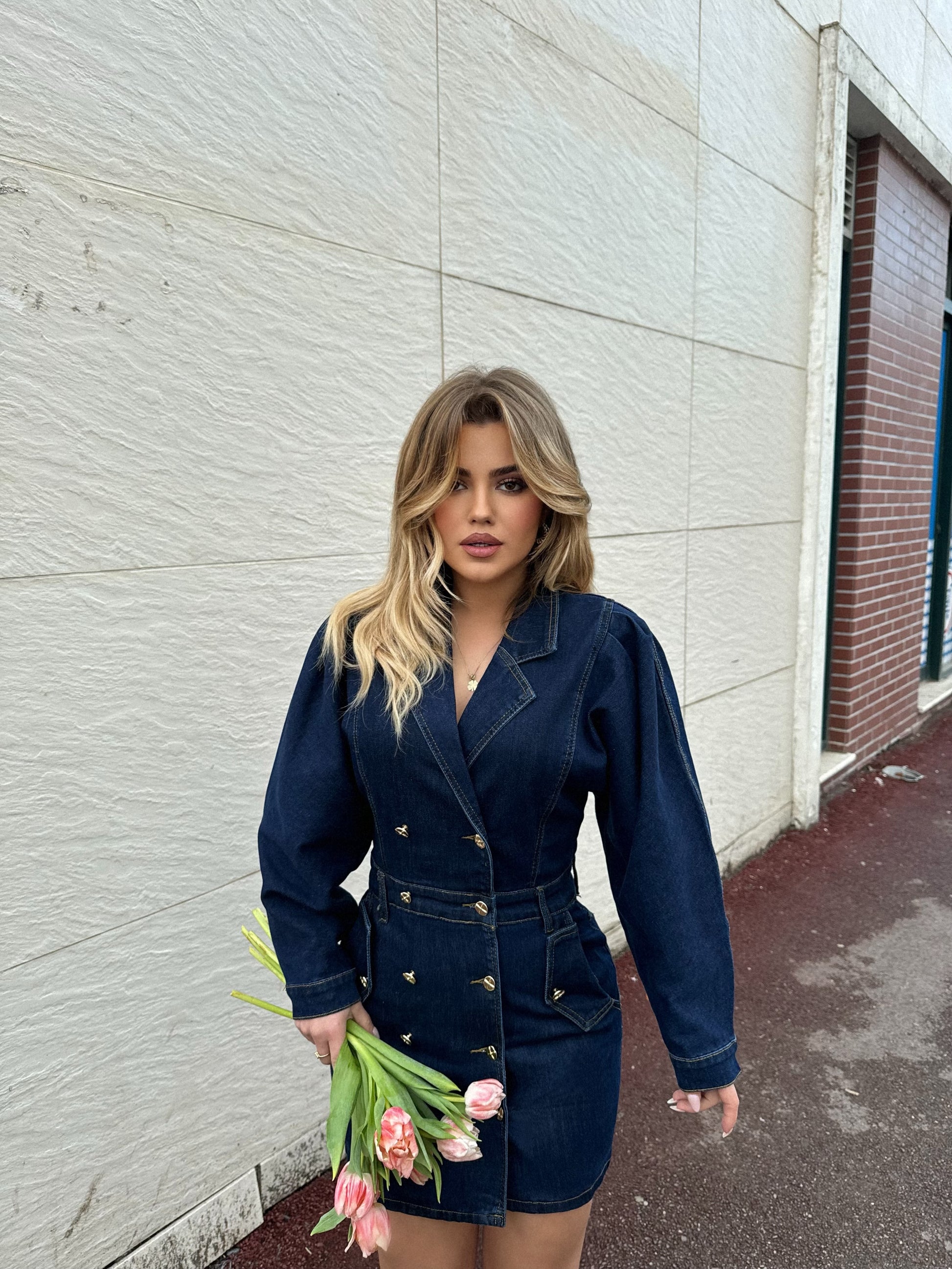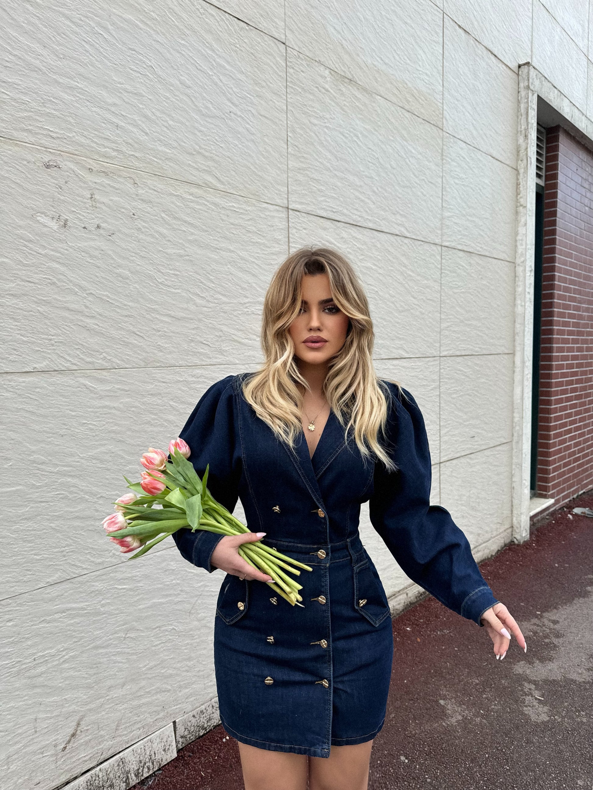 Fustan i shkurter xhins. Mbyllet me kopsa. Ka menge te fryra qe duken teper stil dhe figurante. Kopsat jane ne ngjyre gold. Ka xhepa te bollshem.