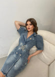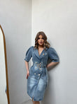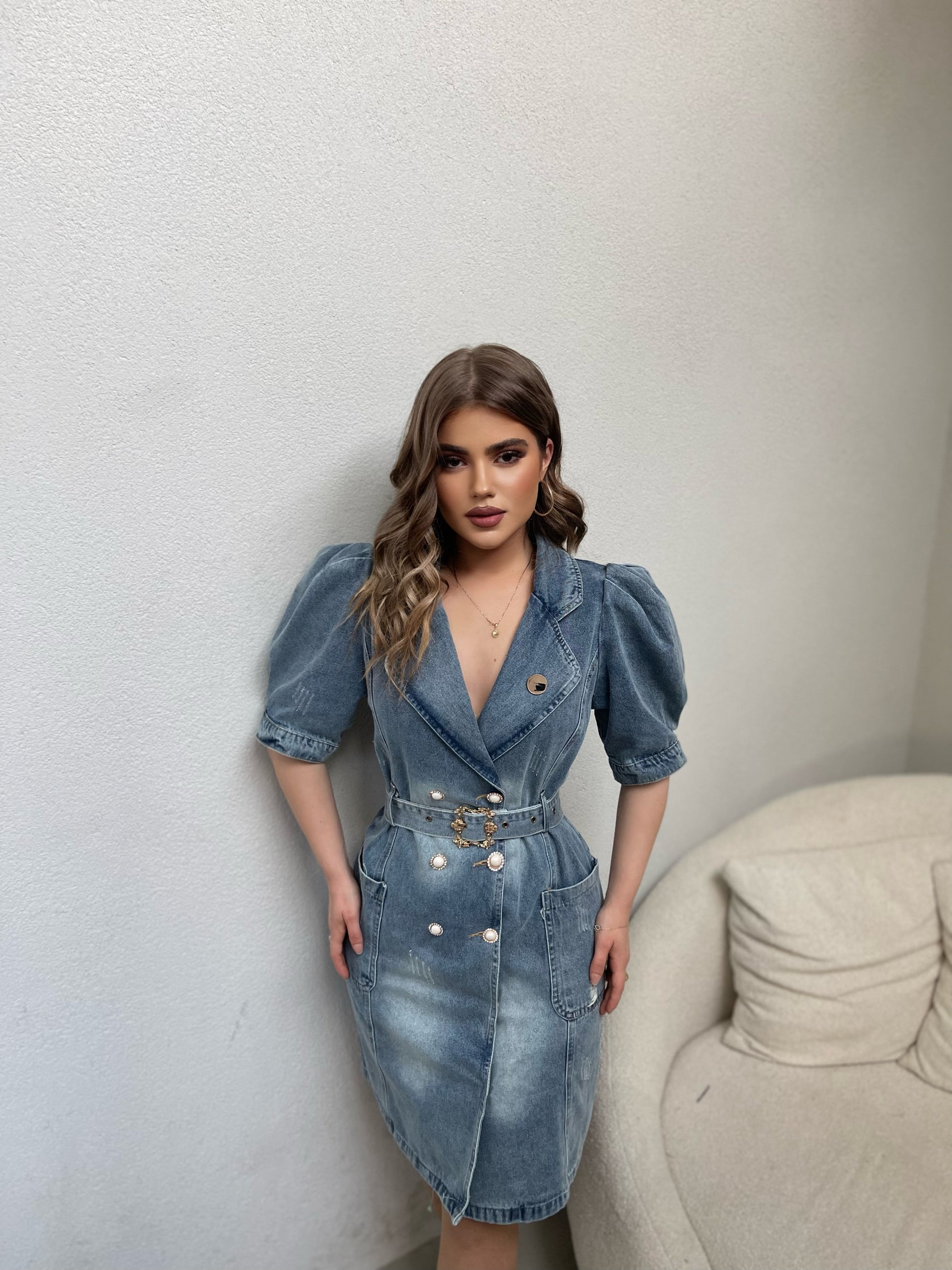 Fustan xhins i shkurter me rrip ne mes. Ka kopsa ne pjesen perpara dhe jake ne forme V-je. Ka xhepa ne pjesen perpara dhe material fantastik.