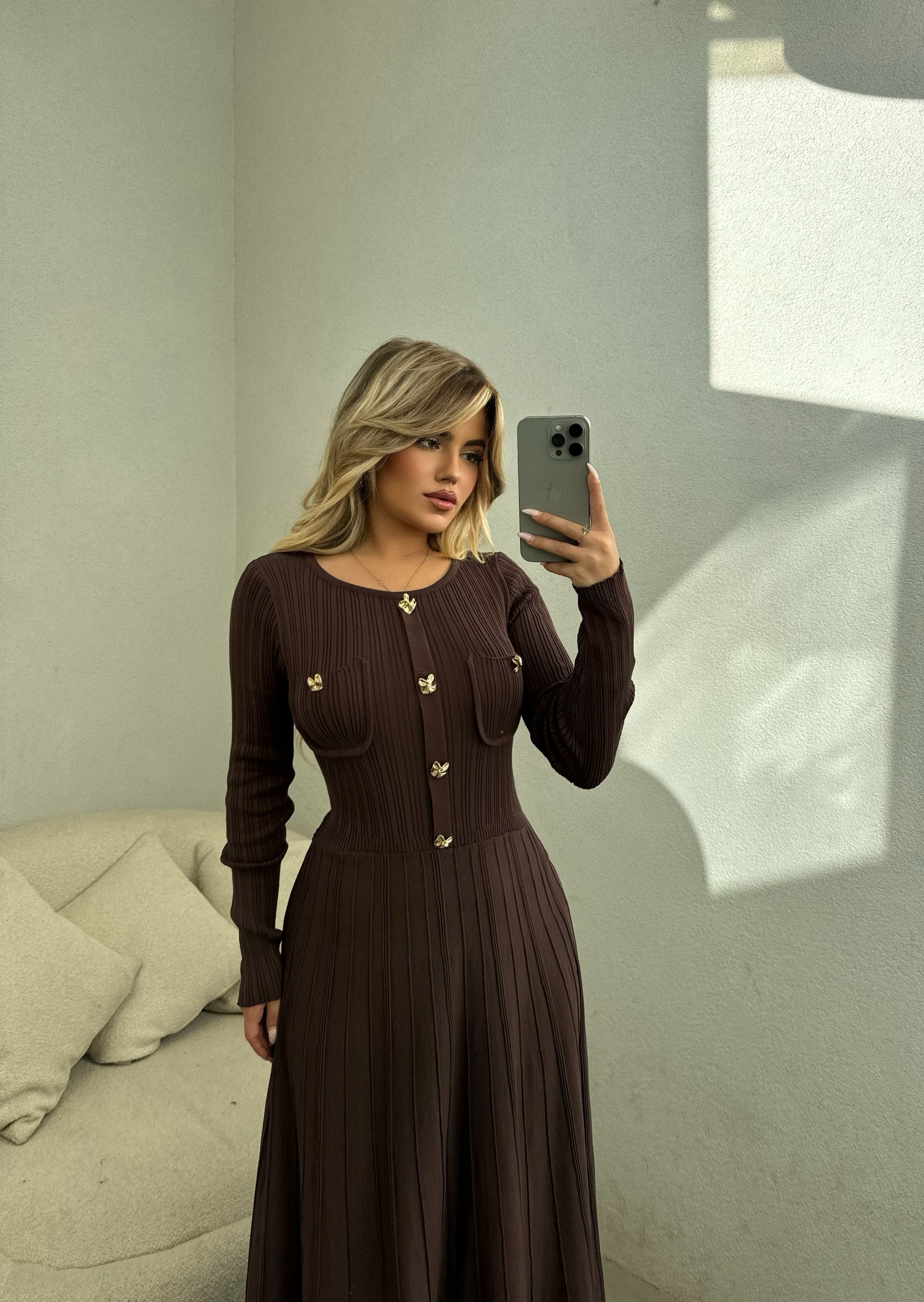 Fustan ngjyre kafe. Fustan i gjate me krahe te gjate, model trend me prerjen lazer te copes komode dhe te ngrohte me kombinimin e kopsave ngjyre gold dhe xhepave ne pjesen e lartme.