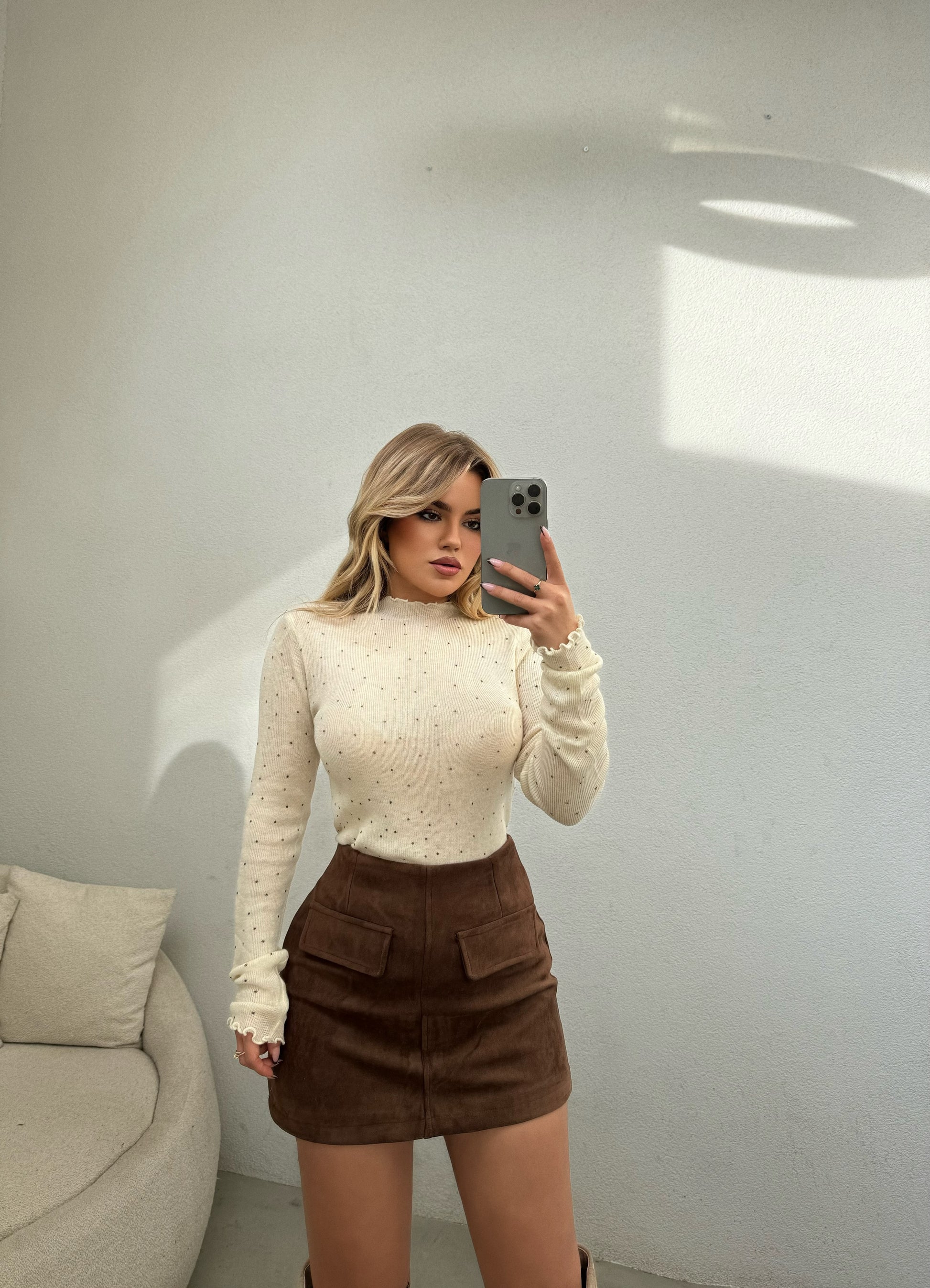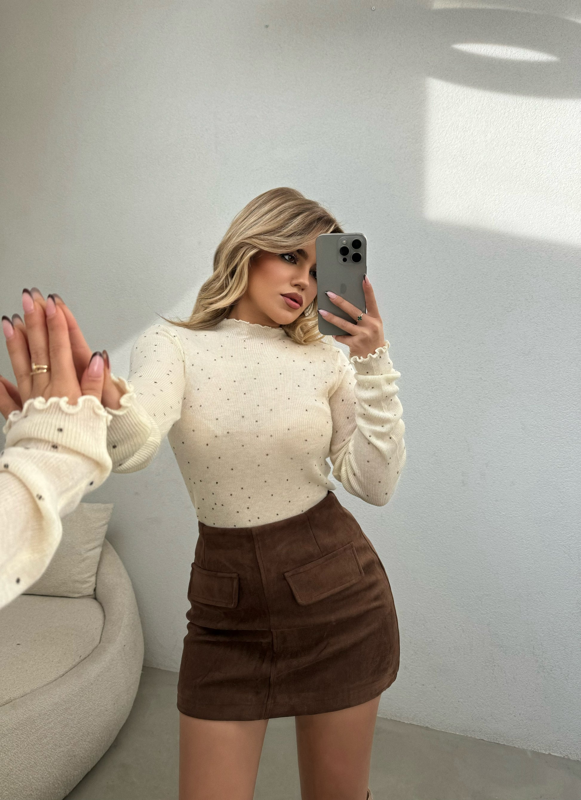 Gjysmëgolf me mëngë të gjata, në ngjyrë kafe dhe bezhe, i mbushur plotësisht me pika . Praktik, i rehatshëm dhe perfekt për kombinime të përditshme.