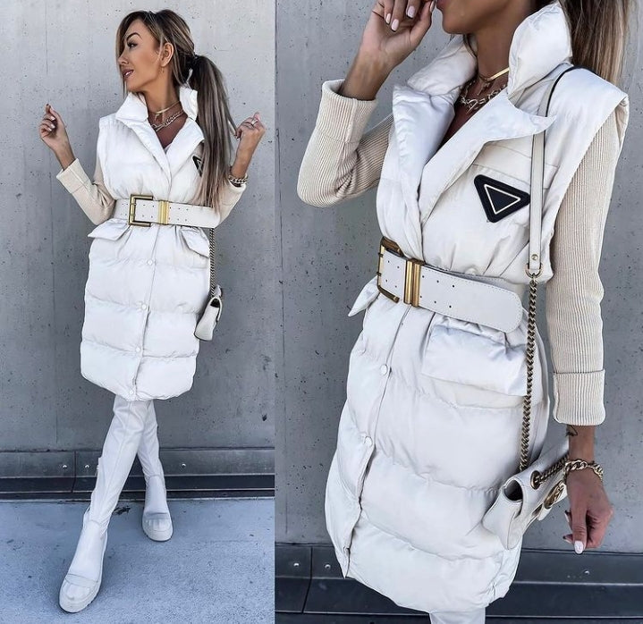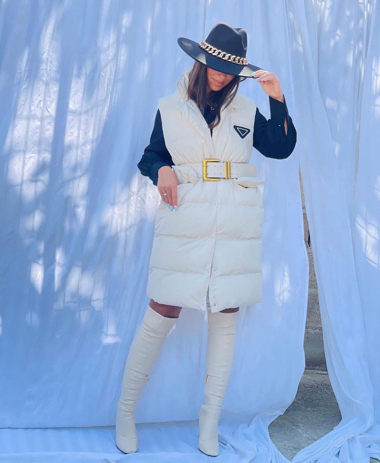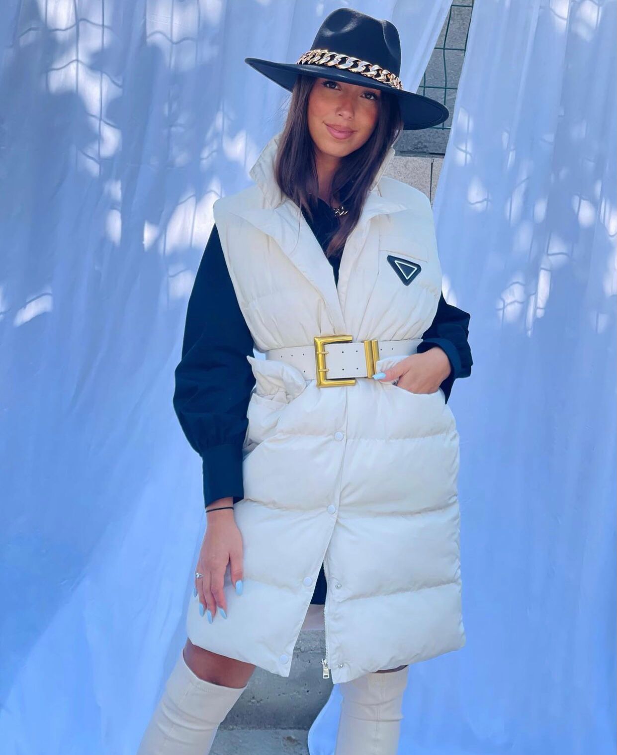 Jelek i mbushur. Jake ne form V-je. Me rrip ne mes. Ne pjesen e perparme ka dy xhepa te bollshem. Mbyllet me zinxhire dhe preçina te jashtme.