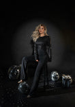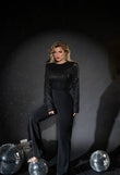 Jumpsuit i zi. Jumpsuit me ngjyre te zeze, ka krahe te gjate dhe xixa vezullese te zeza dhe pantallona te gjata klasike.