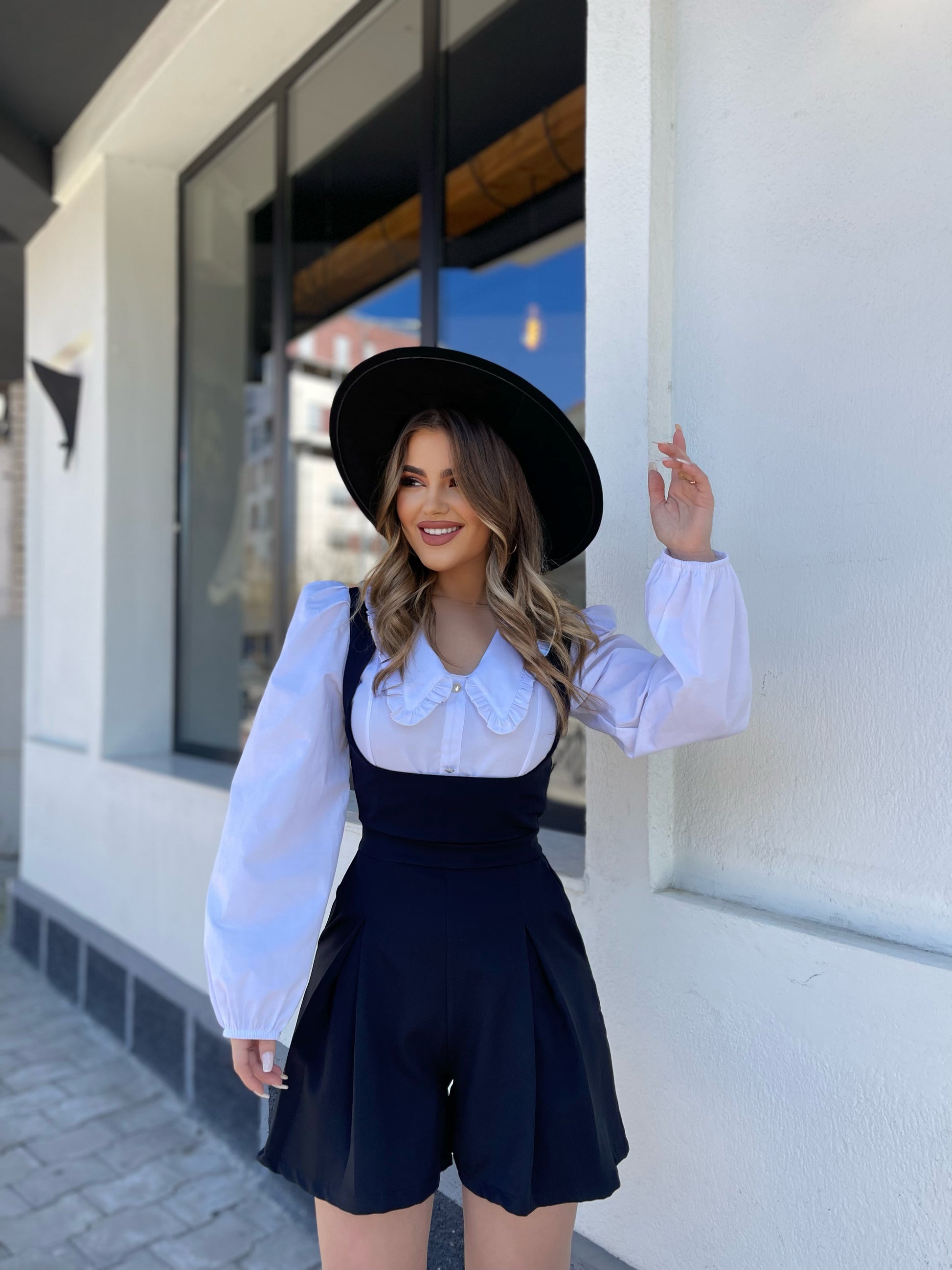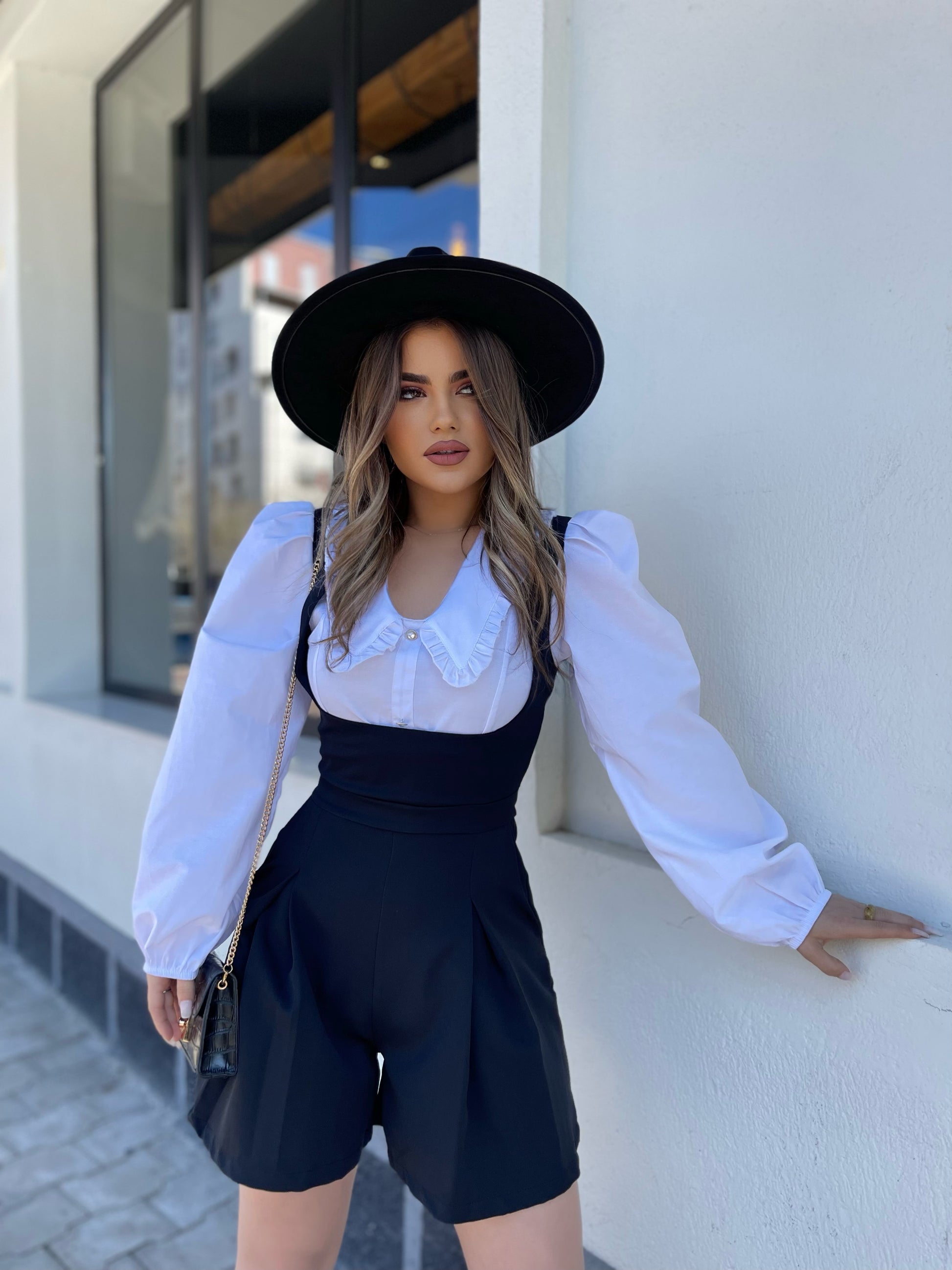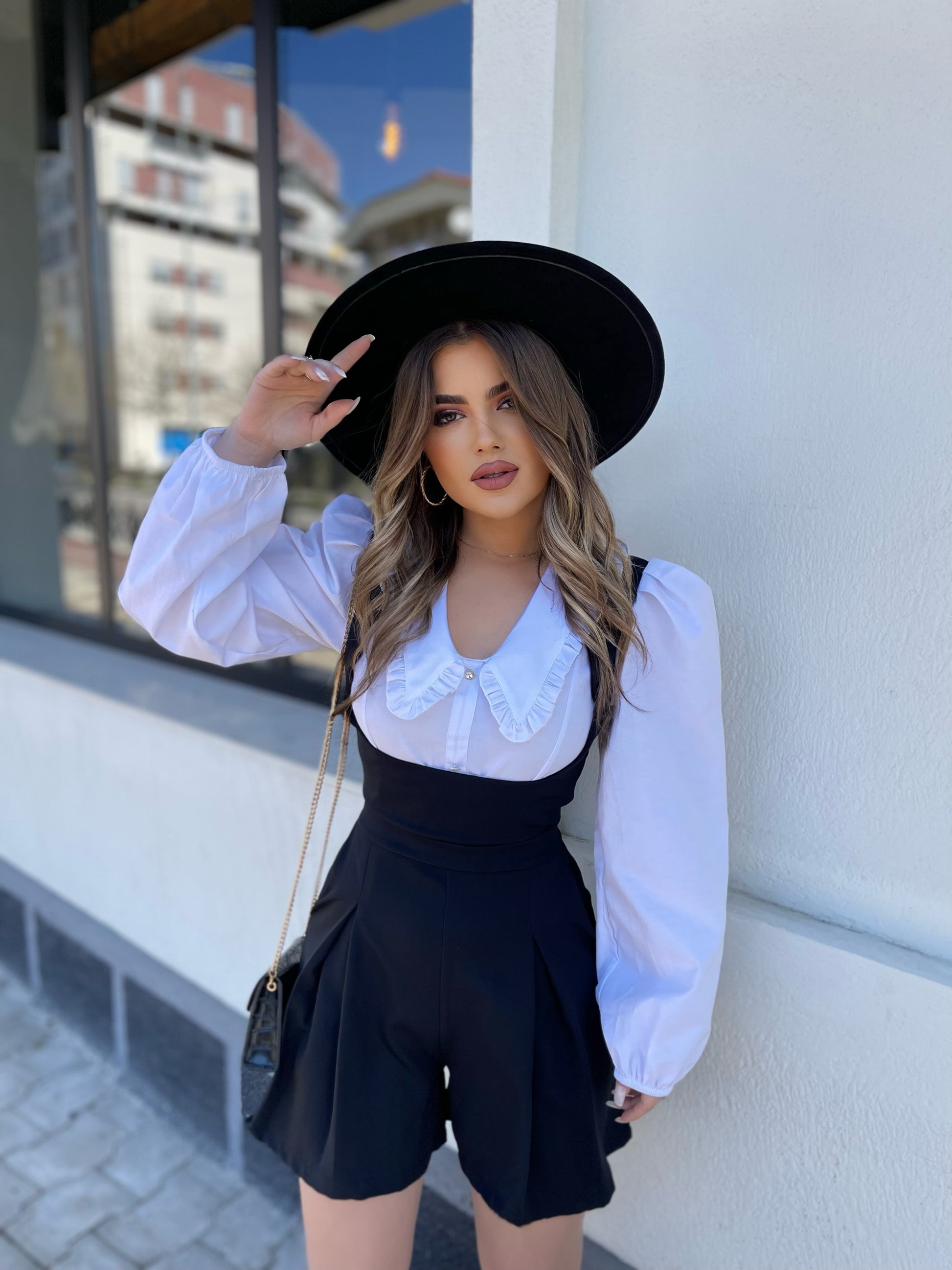 Jumpsuit i shkurter me dantelle perpara. Pjesa e siperme ka ngjyre te bardhe ndersa poshte vjen ne ngjyren e zeze. Jaka eshte ne forme V-je dhe mberthimi behet me ane te zinxhirit ne pjesen mbrapa. Ka prerje te rregullt dhe material fantastik.