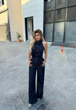 Jumpsuit xhins me kopsa tek busti dhe me rrip ne mes. Vjen me pantallona te gjata dhe te gjera. Me jake me kapak. Ka xhepa nga pas. Shume stil dhe figurant.