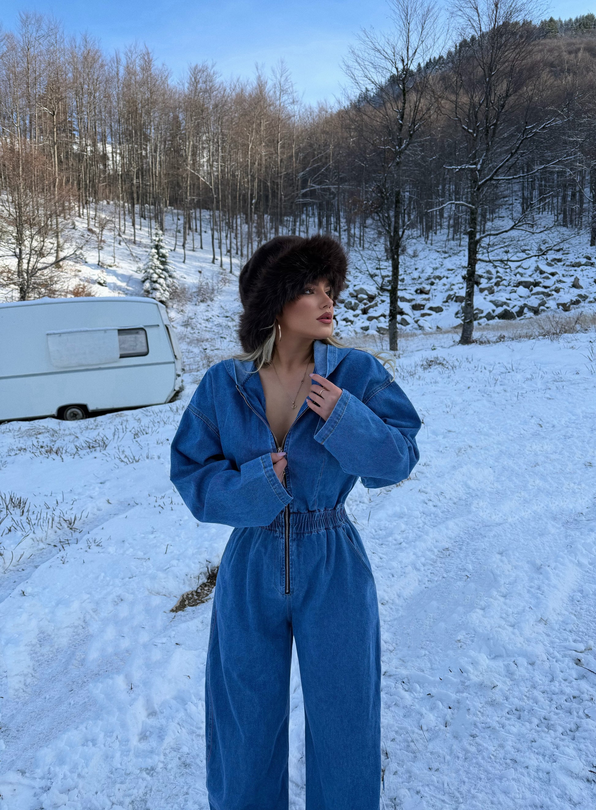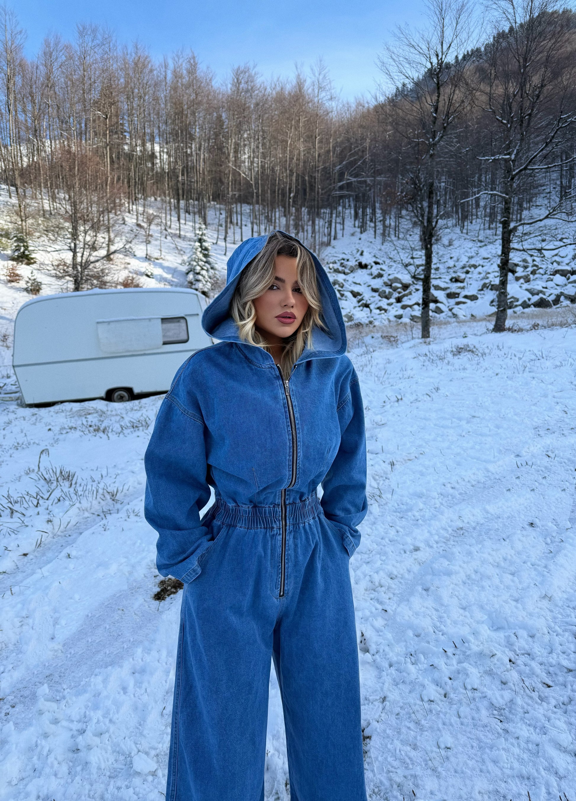 Jumpsuit ne ngjyren blu. Materiali xhins, eshte me zinxhir dhe kapuc. Perfekte per tu dukur e stil.