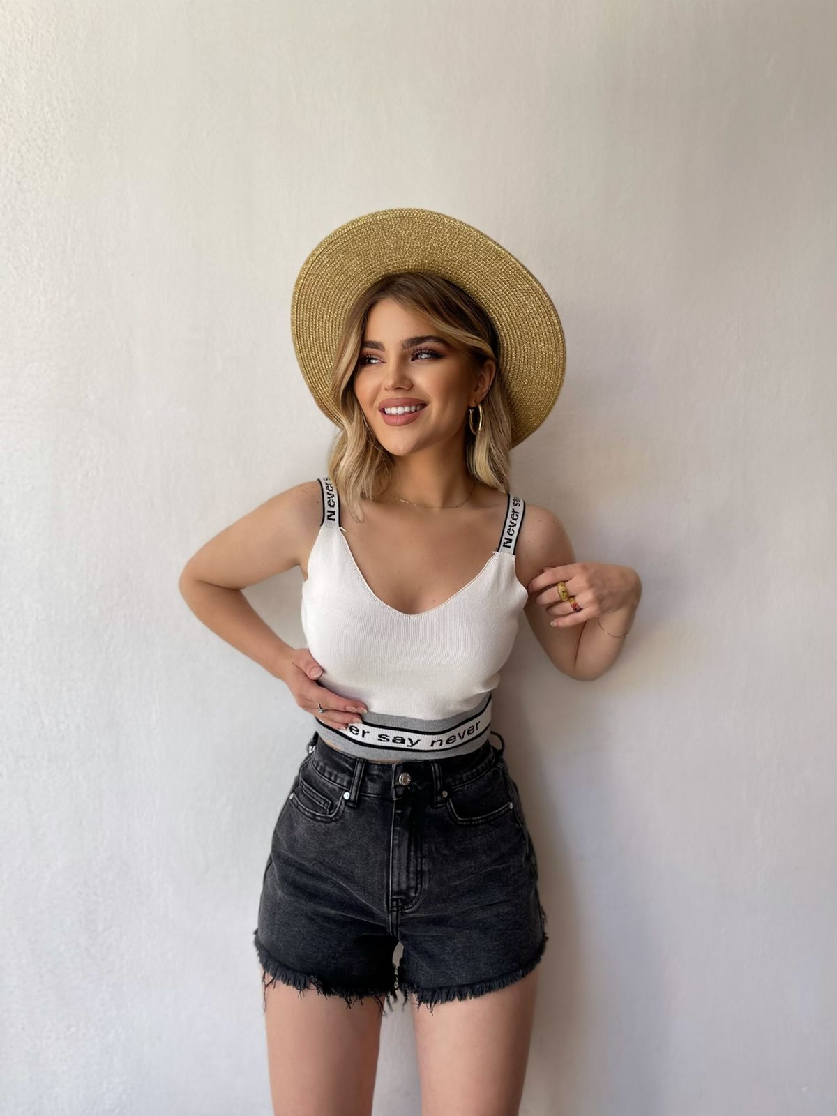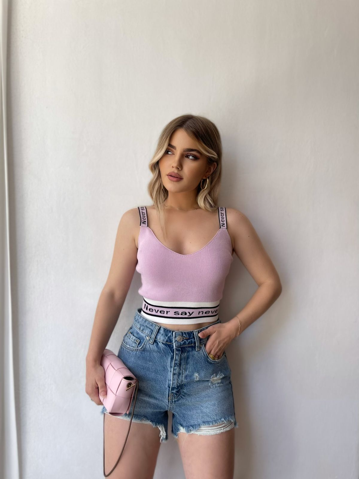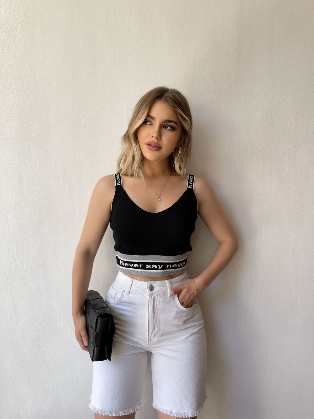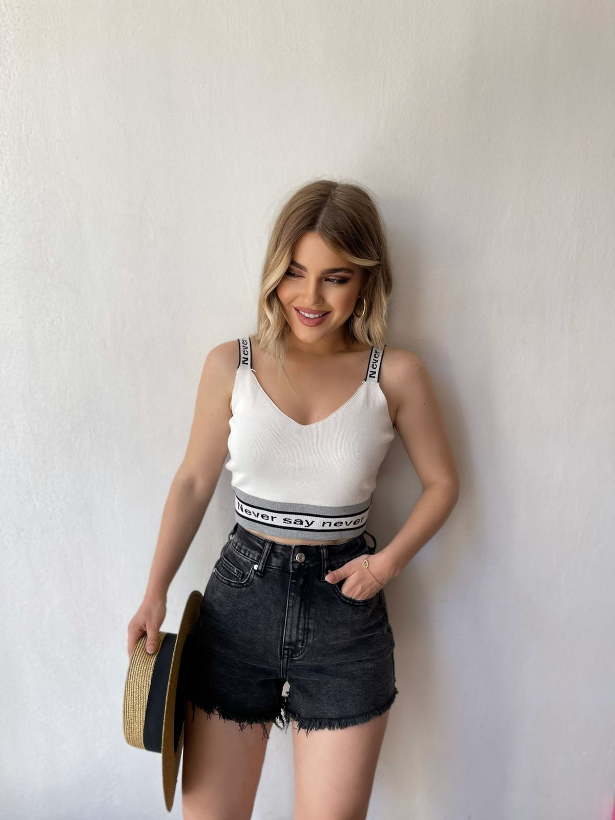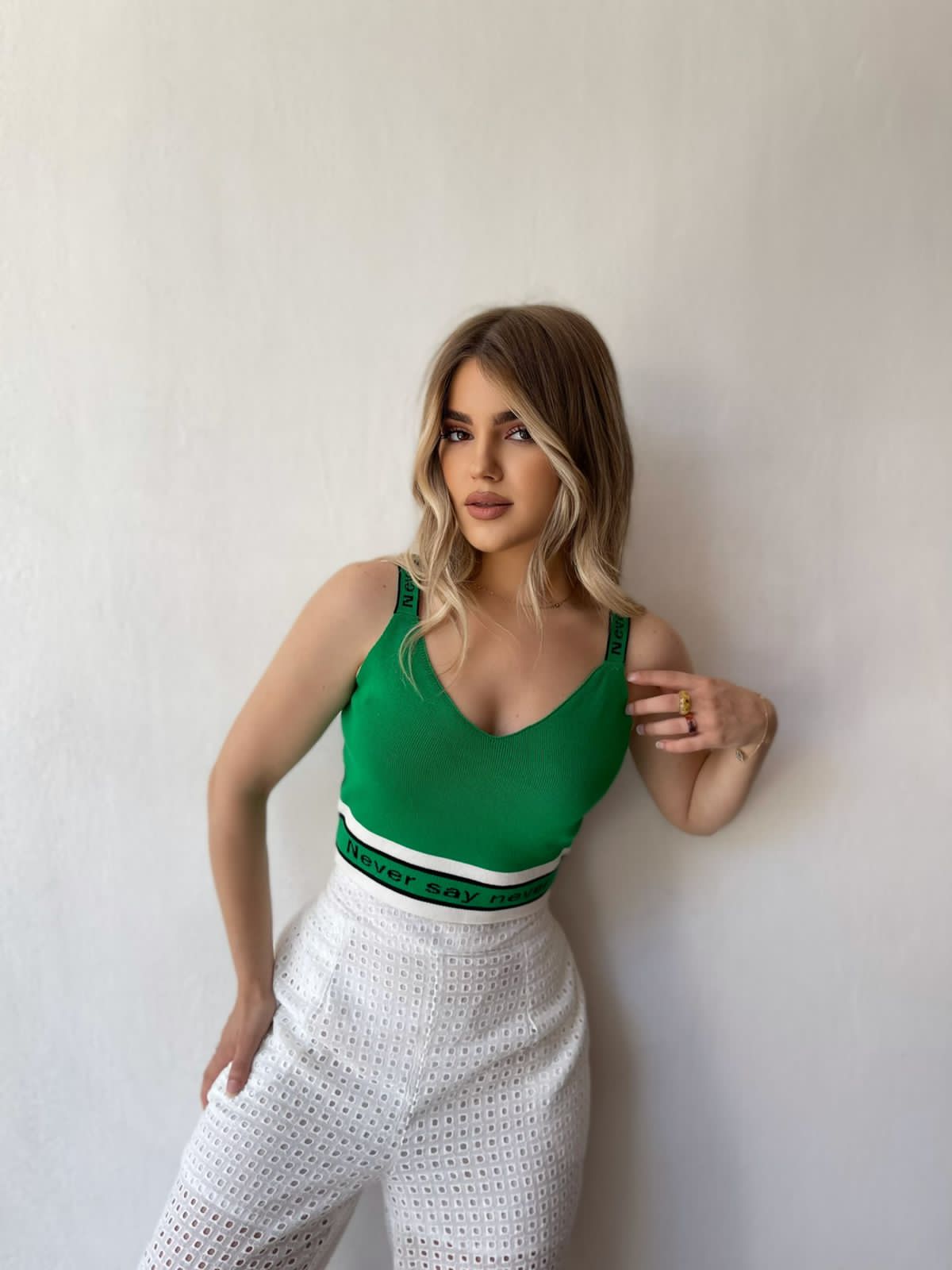 Kanatjere e shkurter material i plote shume i mire. Me rripa te trashe dhe mbishkrim mbi rripat. Vjene ne pese ngjyra: e bardhe, lejla, roze, e zeze dhe jeshile.