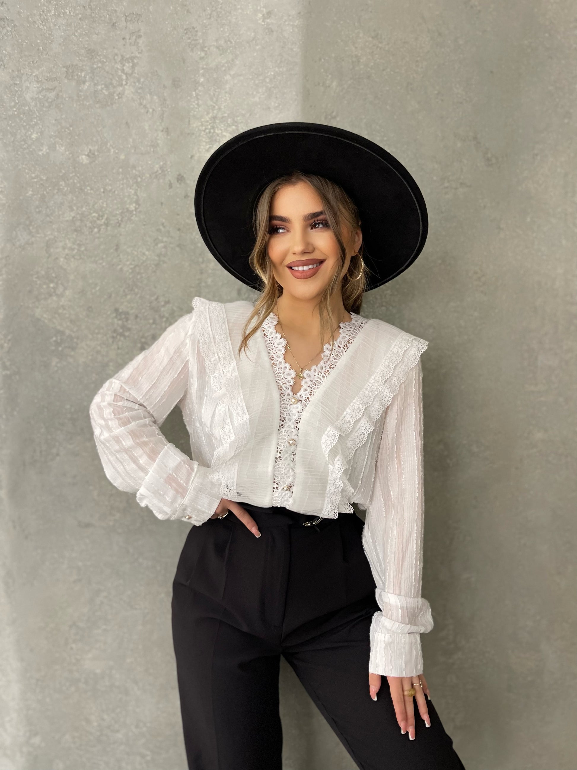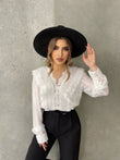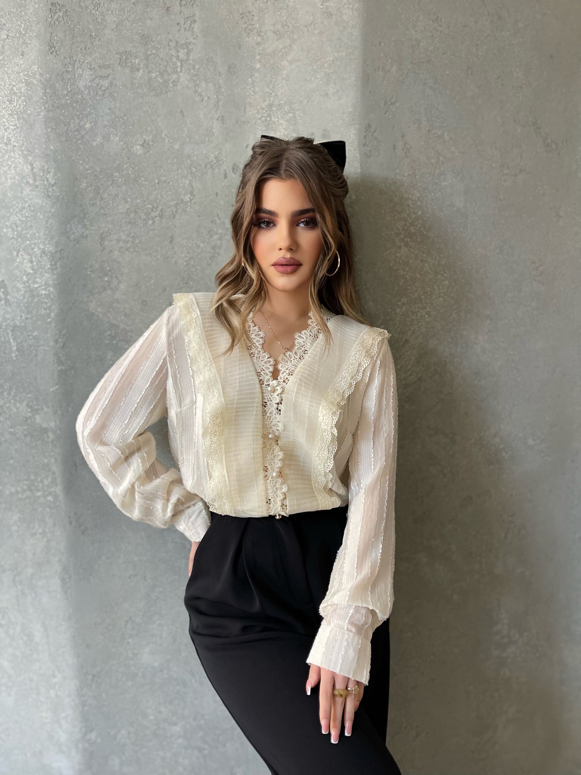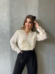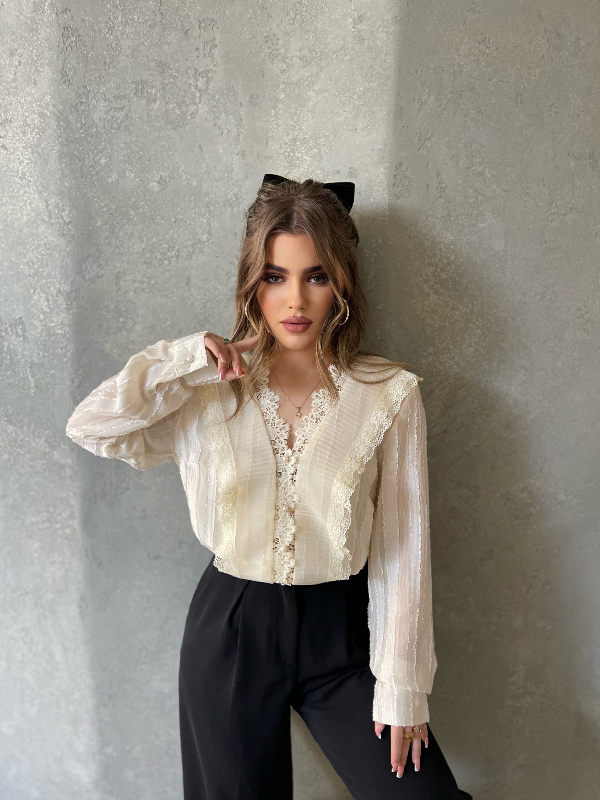 Kemishe me jake ne form V-je. Me dantelle ne pjesen e perparme. Kemisha eshte me menge te gjata. Kemisha ka gjatesi normale dhe eshte teper e kombinueshme.