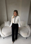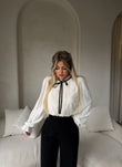 Kemishe e bardhe. Kemishe e bardhe me krahe te gjate, e fresket, permban detaje si frudat ne menge dhe lidhese te zeza ne jake.