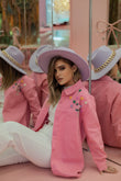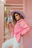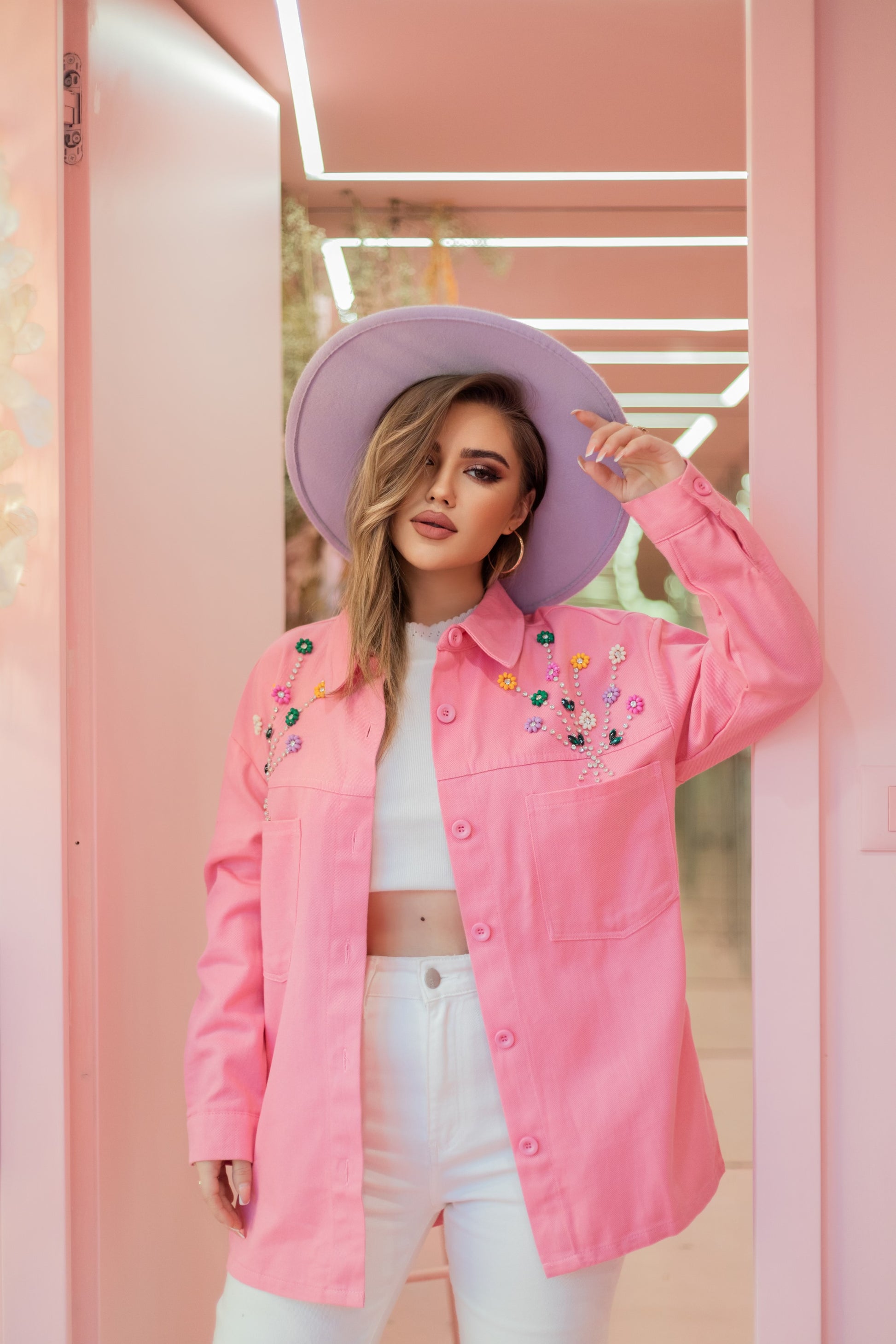 Kemish e pambukte roz me dizenjo me lule ne pjesen e perparme. Me jake me kapak me xhepa pllak. Me menge te gjata. Mberthimi behet me kopsa ne pjesen e perparme.