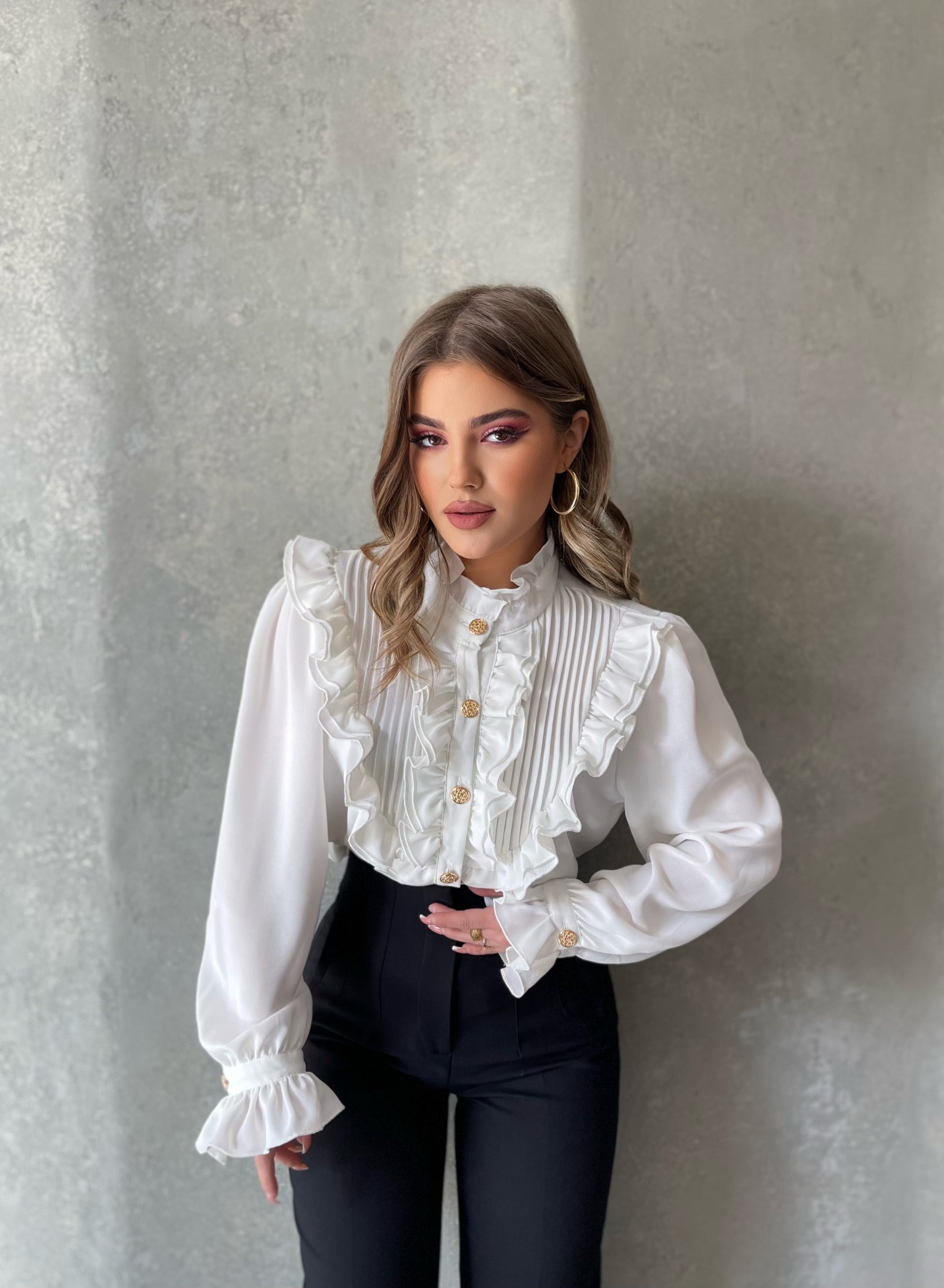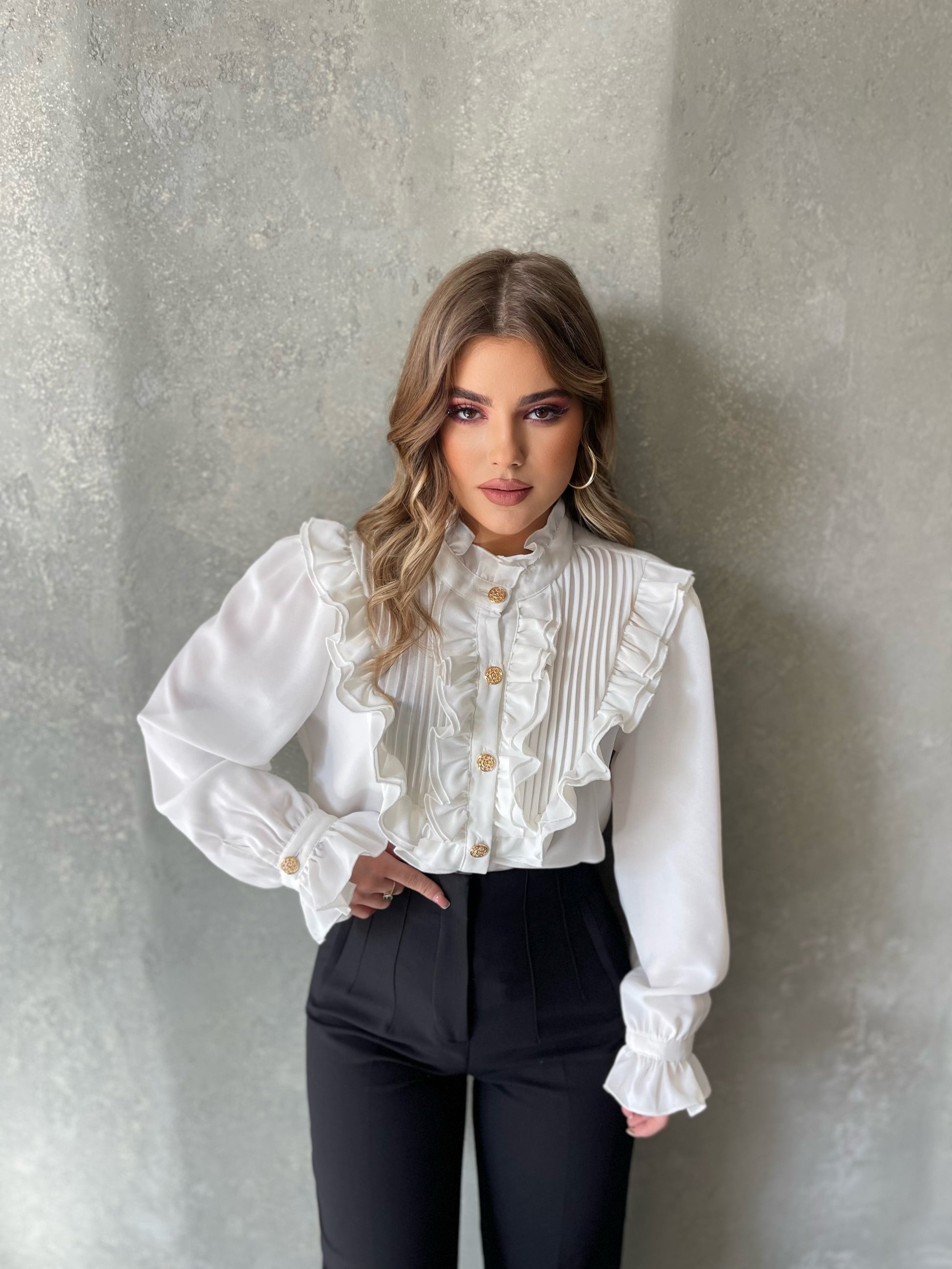 Kemish saten me pala ne pjesen e bustit me menge te gjata. Me jake rrethore, me kopsa gold. Mberthimi behet me kopsa ne pjesen e perparme.