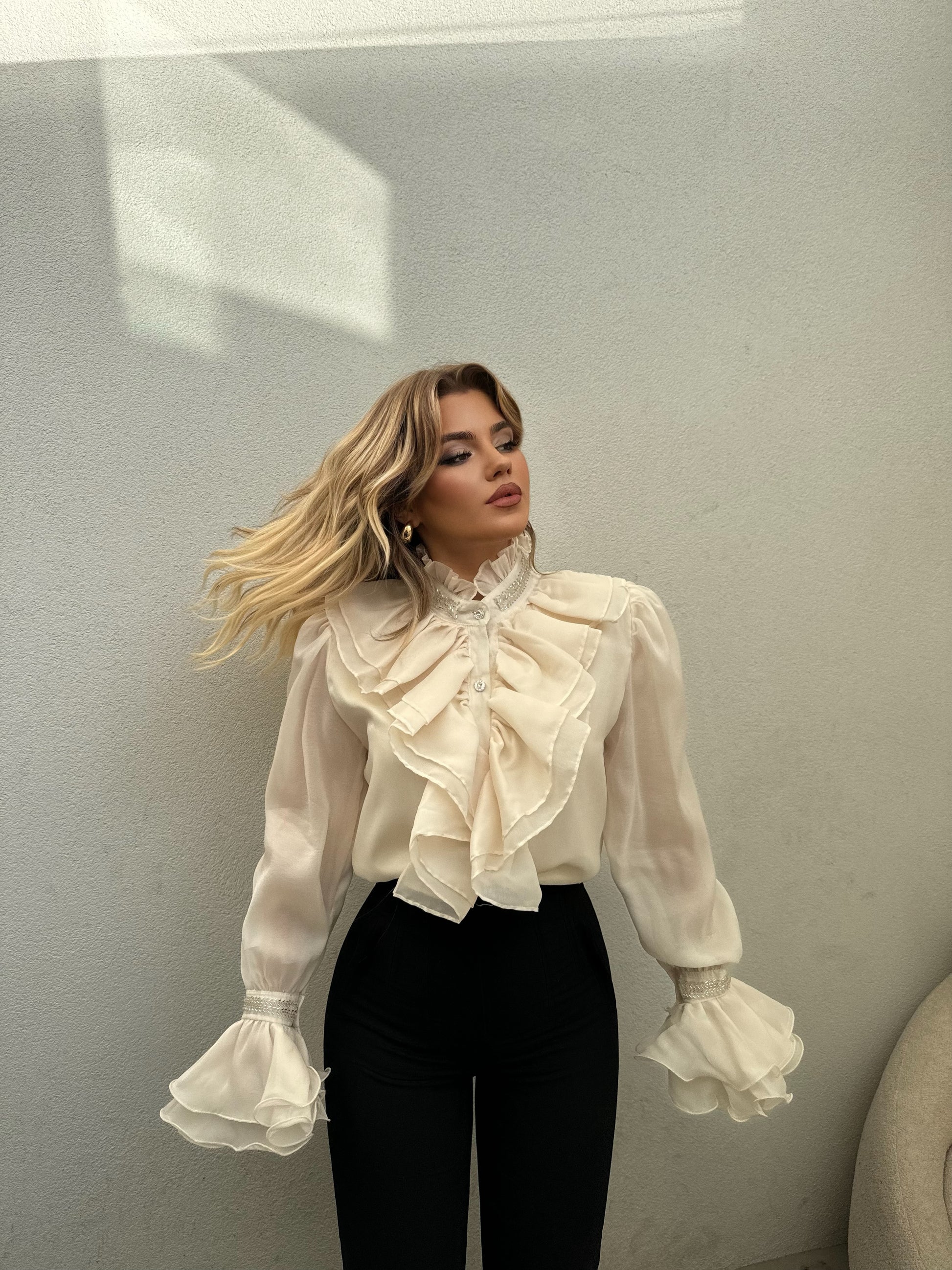 Kemishe elegante në ngjyre bezhe, me detaje të bukura pala ne pjesen e qafes qe i japin nje prekje fine dhe femerore. Pershtatet ne menyre perfekte si per veshje ditore, ashtu edhe për evente apo ambiente pune.
