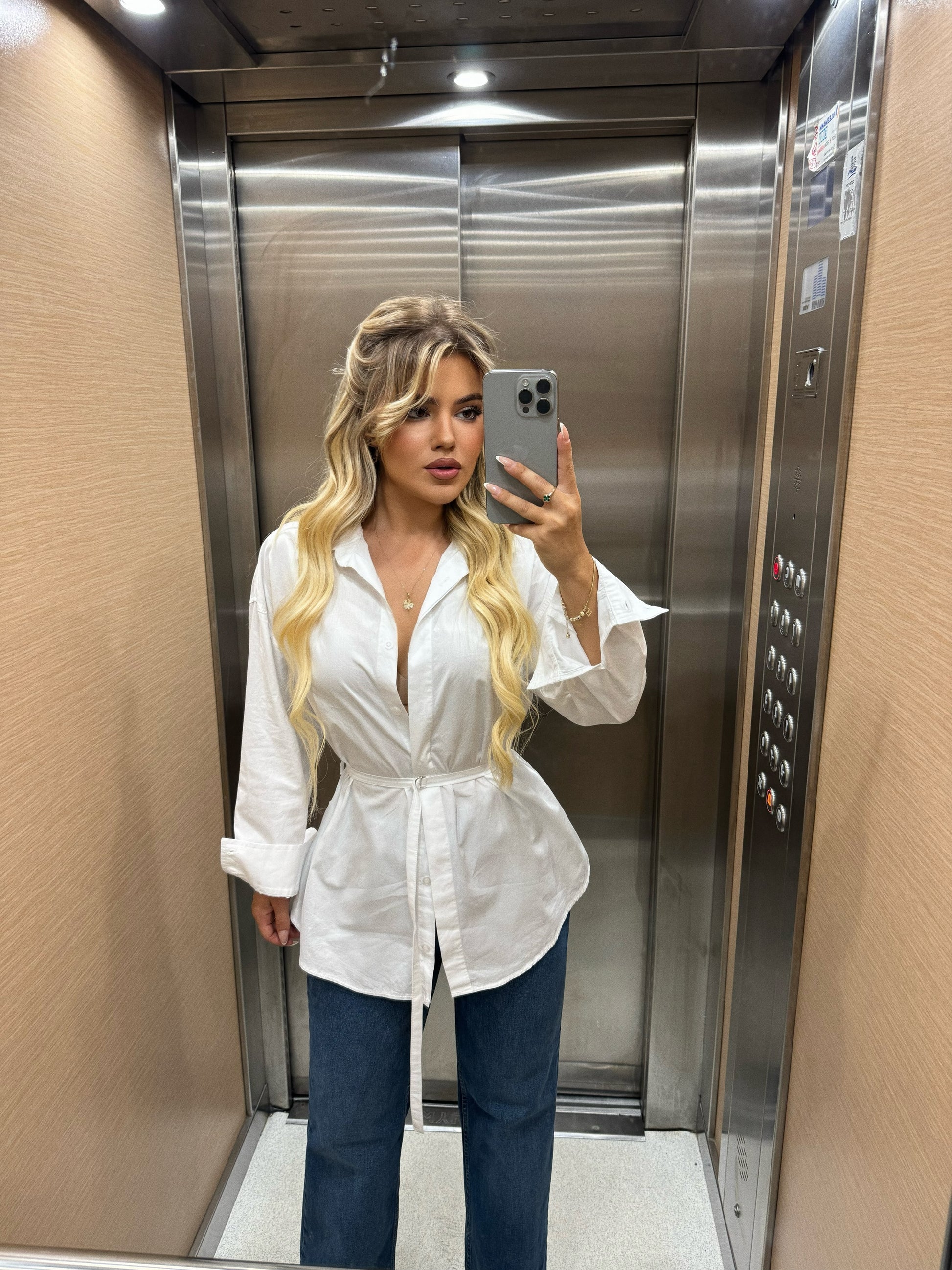 Kemishe e bardhe me lidhese ne bel. Material i plote shume i mire.