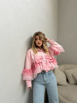 Kemishe me fjongo te pjesa para. Ka menge te gjata dhe ka dantelle.Ka kopsa te pjesa para.Materiali i plote dhe shume i mire.