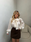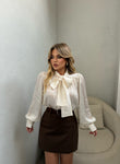 Këmishë elegante në ngjyrë bezhe, me fjongo në qafë dhe krahë të gjatë. Stil i rafinuar, femëror dhe i përshtatshëm për çdo rast.