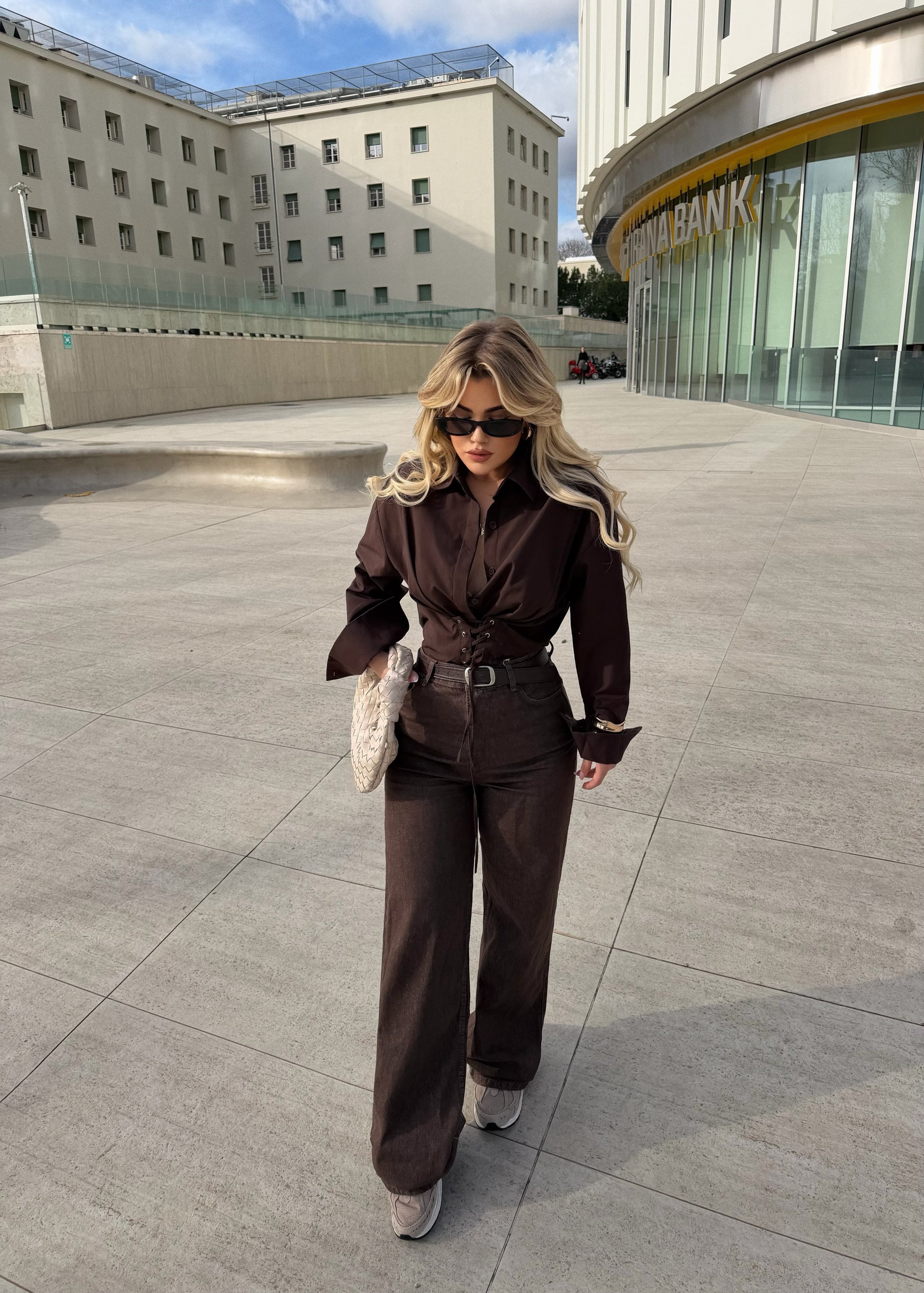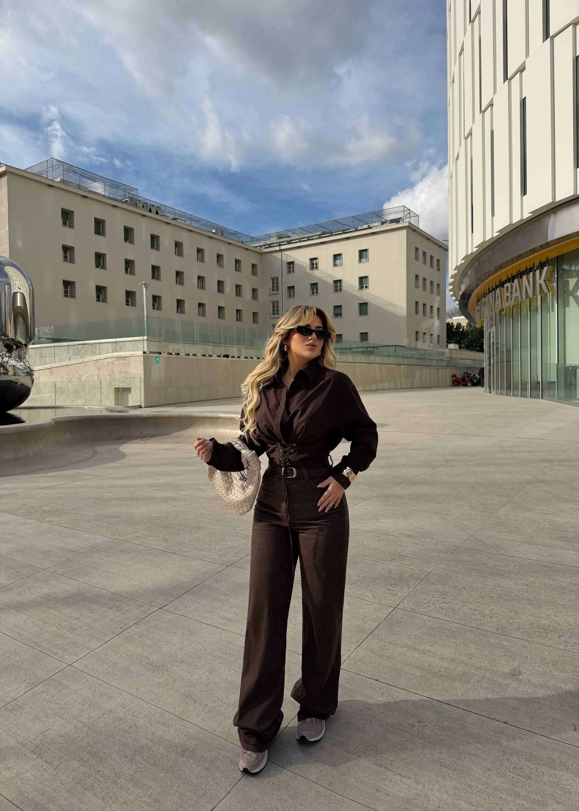 Kemishe me lidhje para vje ne dy ngjyra kafe dhe bardhe. Teper stil.Lehtesishte e kombinueshme.