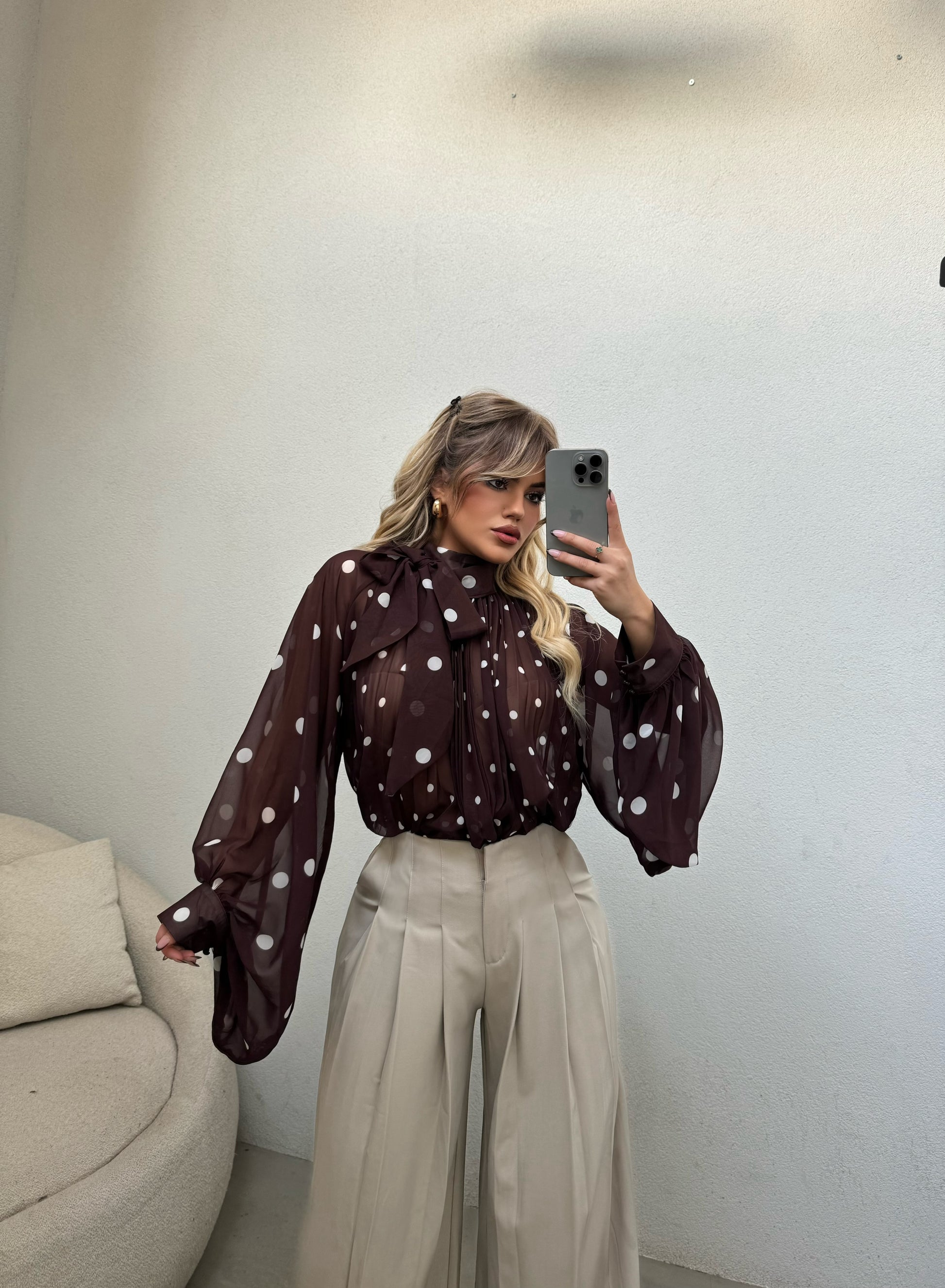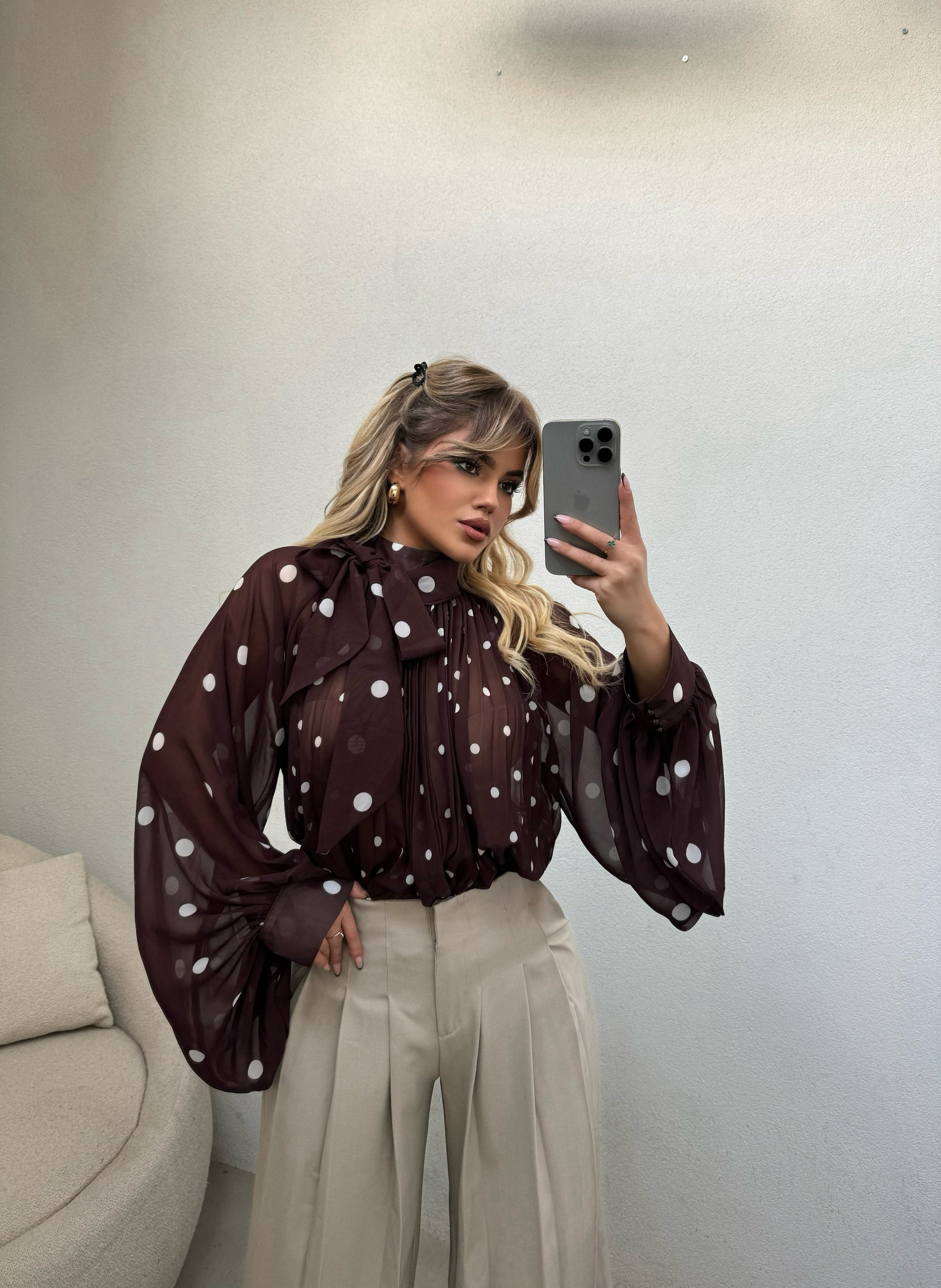 Kemishe ne ngjyren kafe me pika. Vjen me lidhje ne pjesen e qafes dhe pala ne pjesen e poshtme. Teper komode dhe praktike.