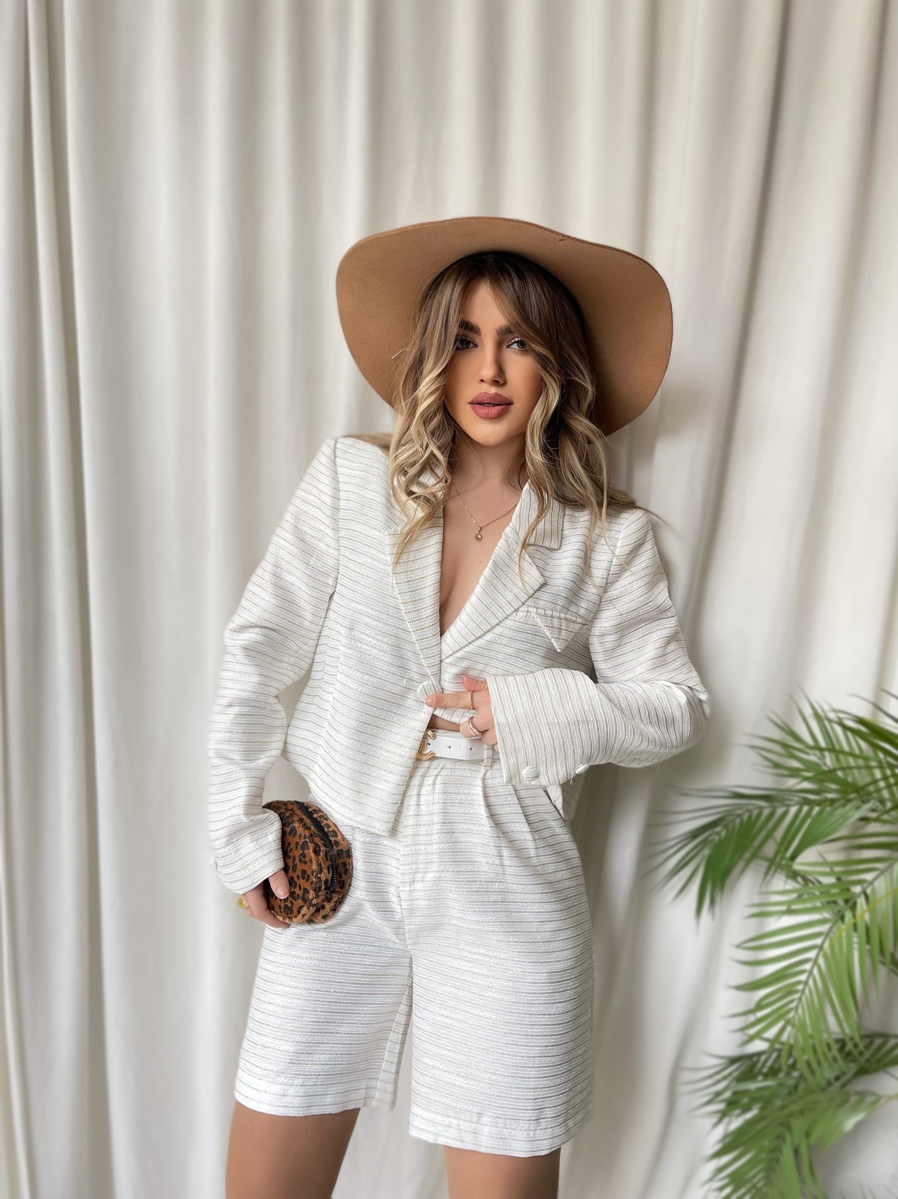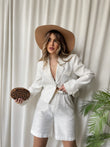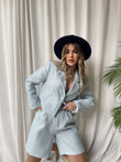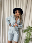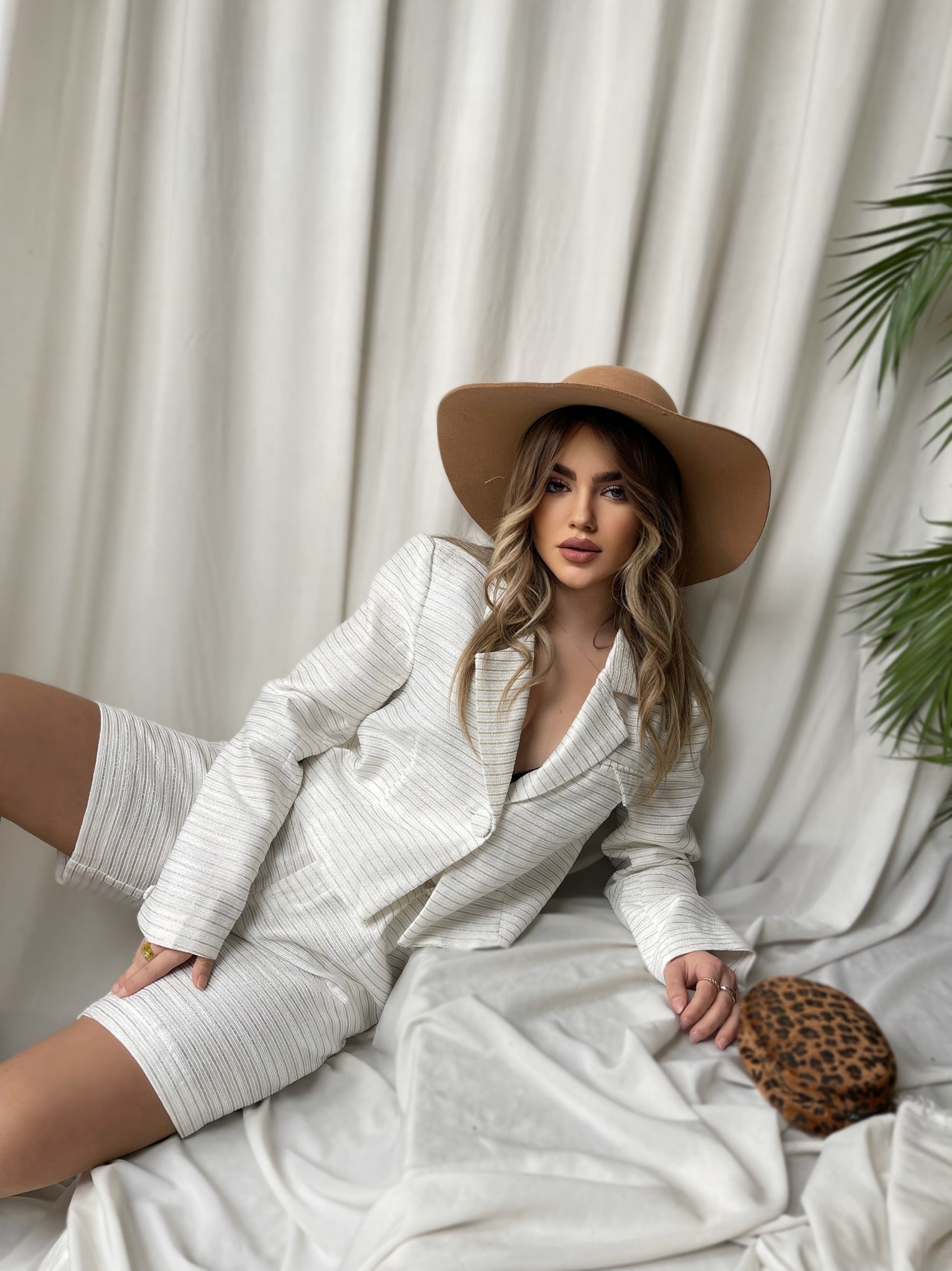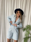 Kostumi vjen ne 2 ngjyra bojeqielli dhe i bardhe. Perbehet nga xhaketa dhe pantallonat me bel te larte. Pantallonat kane xhepa dhe rrip te perfshire. Ka material te plote, nuk krijon rrudhe, eshte shume stil.