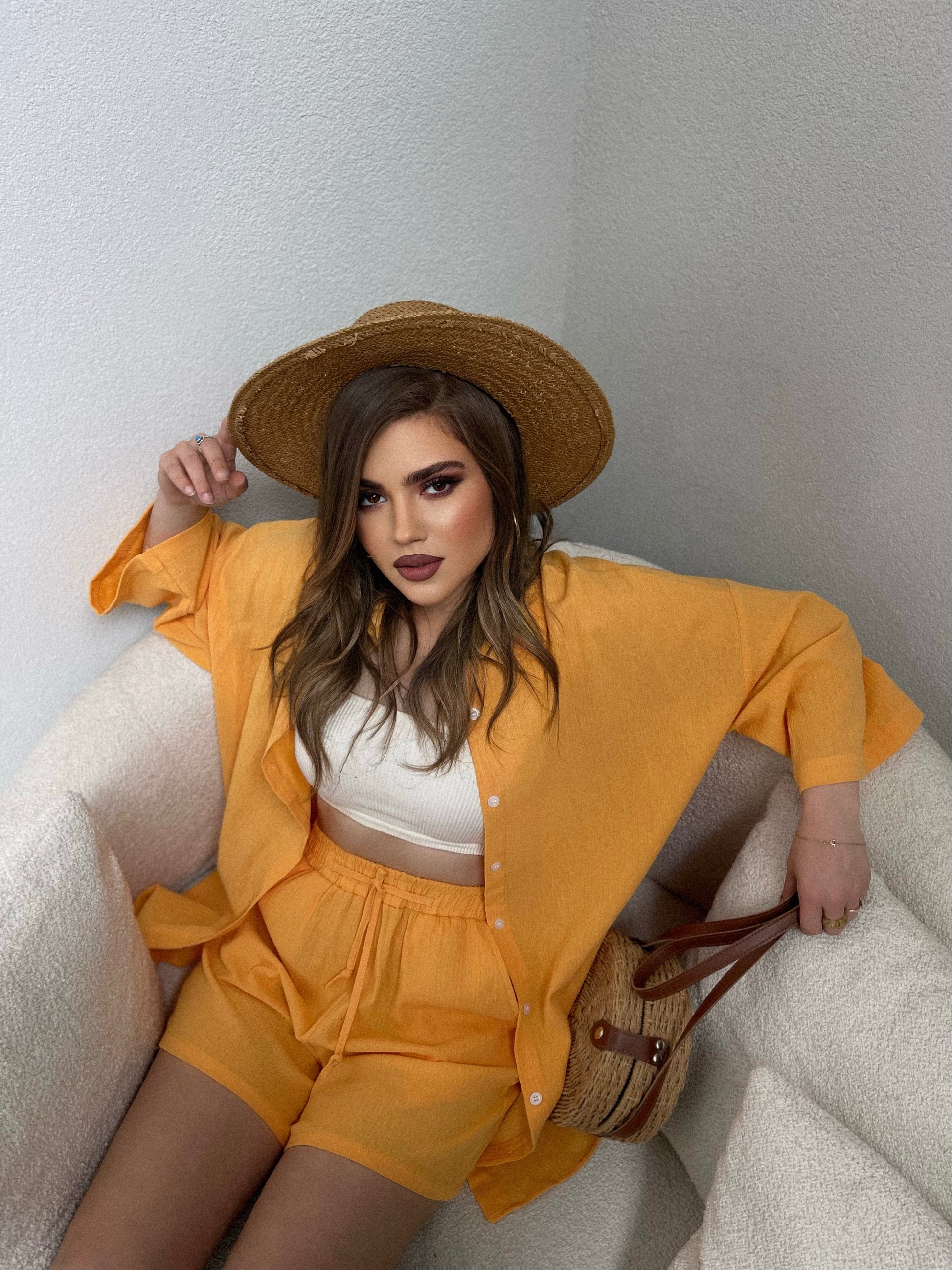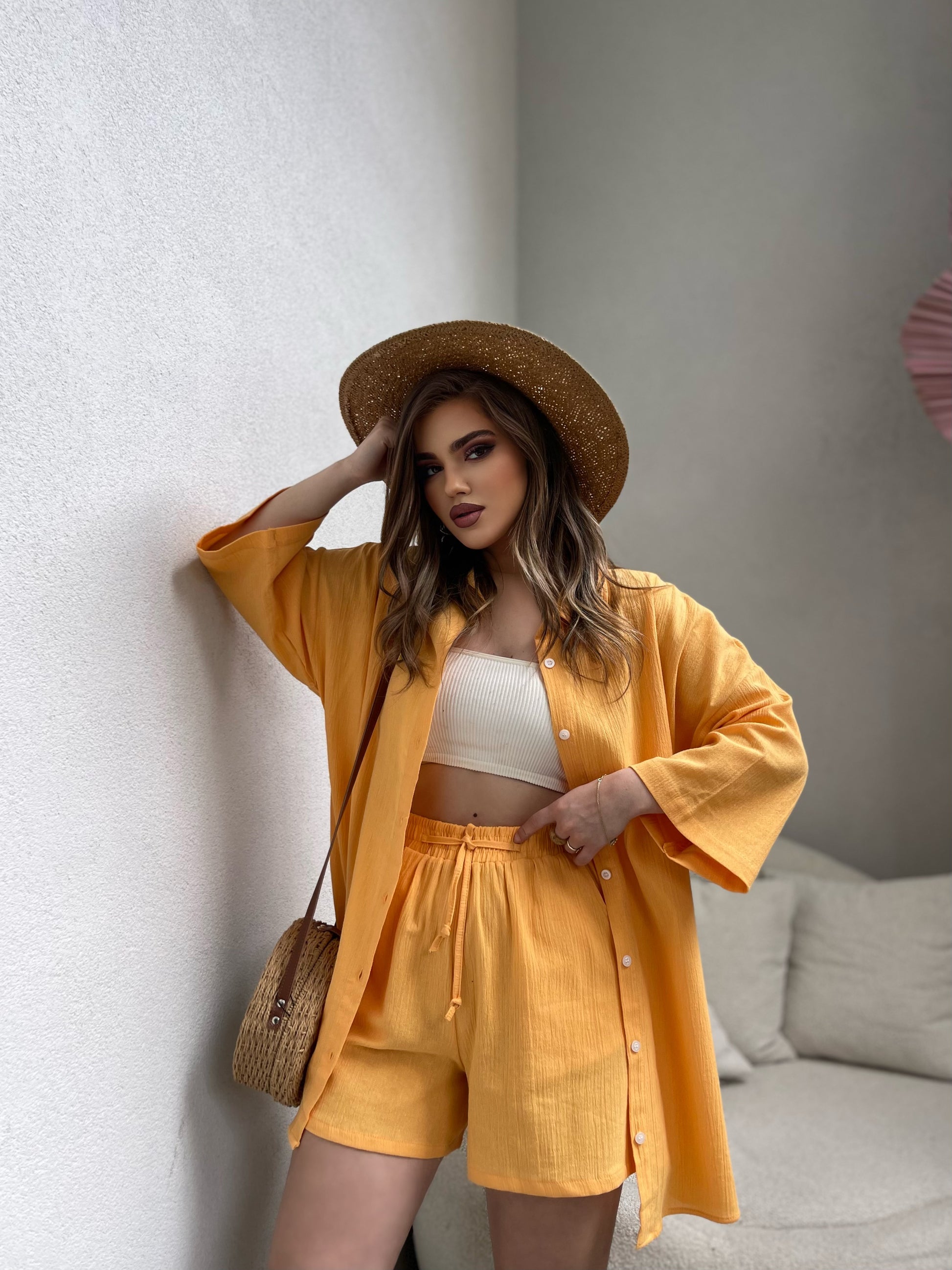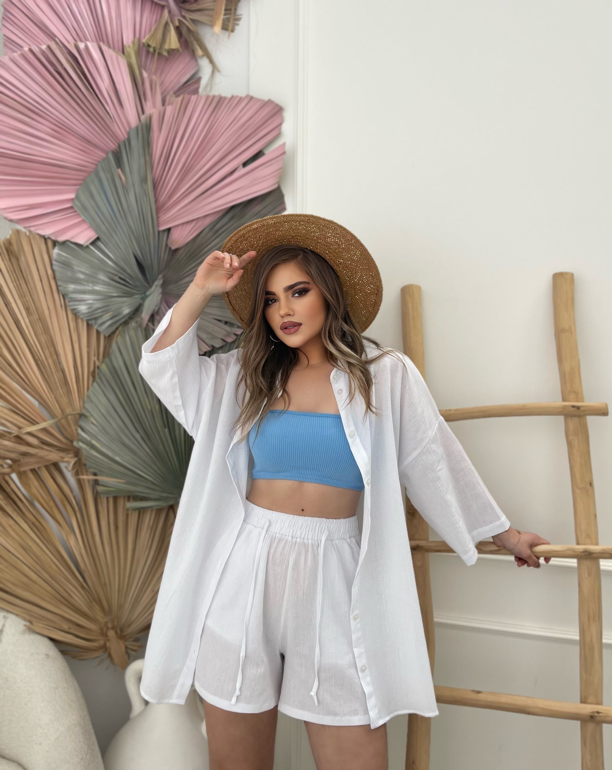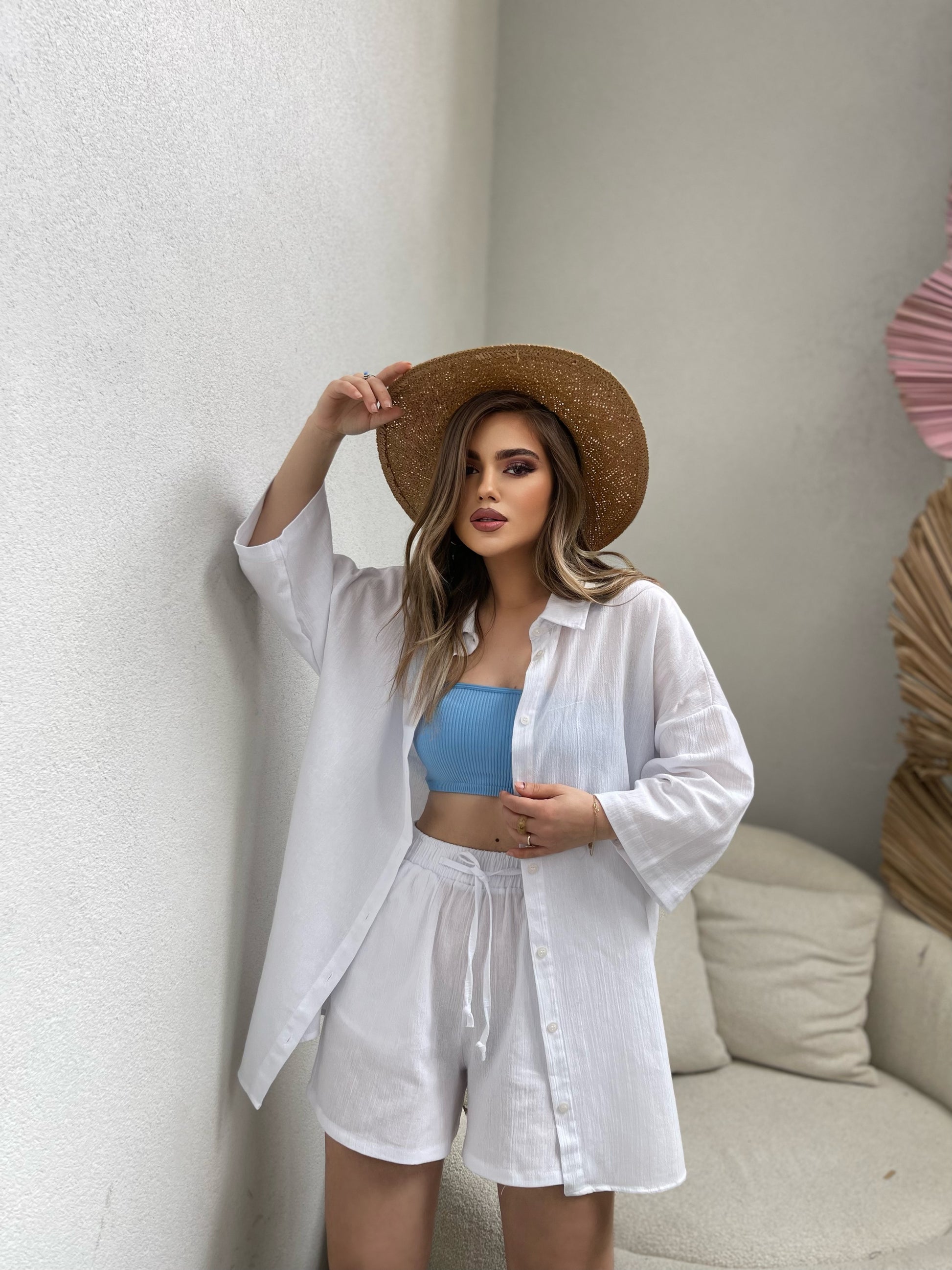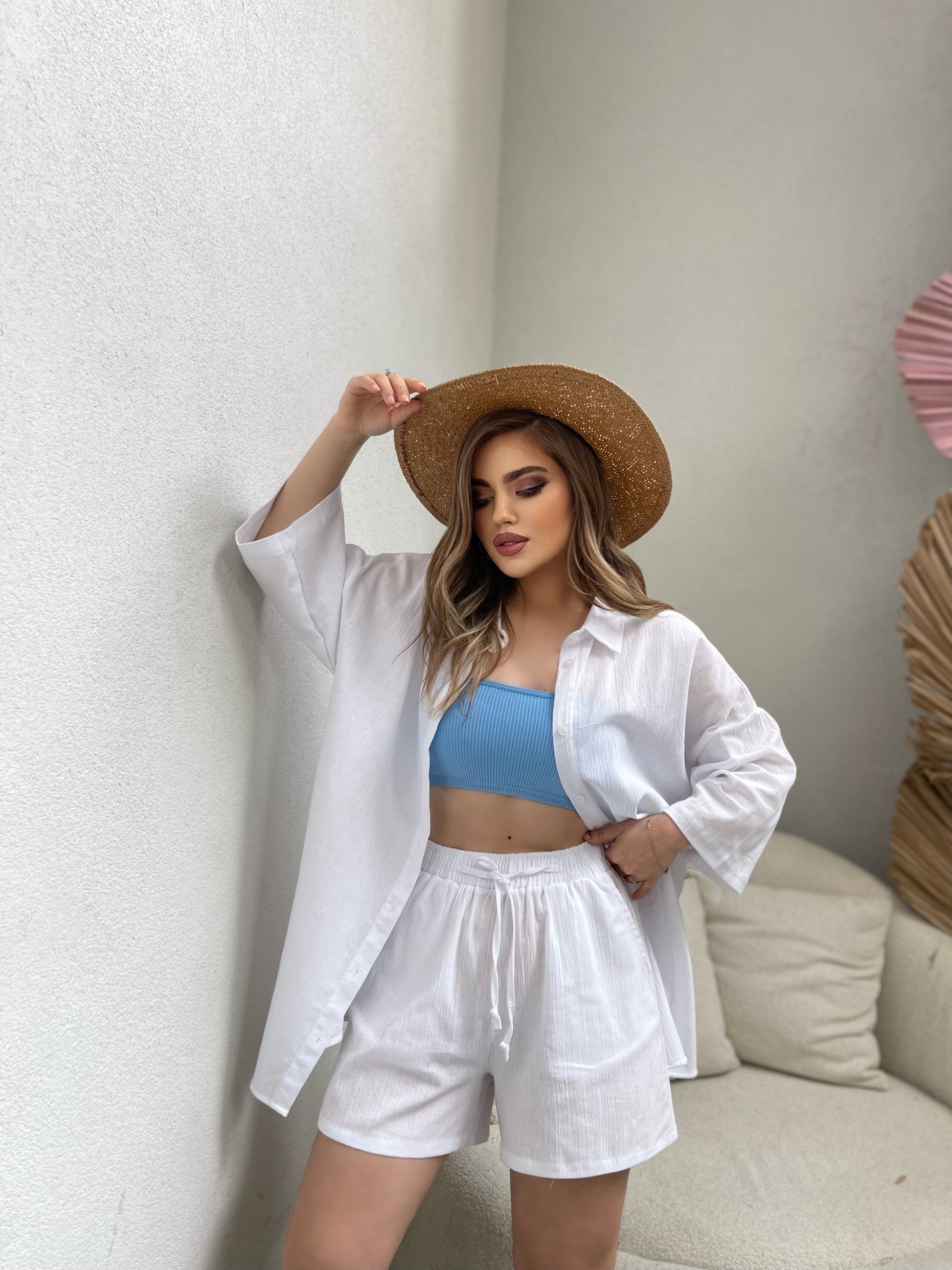 Kostum kemishe dhe pantallona te shkurter. Kemisha vjen me krahe te shkurter dhe kopsa para. Pantallonat kane lidhese ne bel.