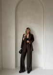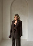 Kostum klasik në ngjyrë kafe, me pantallona me prerje të drejtë dhe xhaketë me kopsa përpara. Dizajni oversize i jep një pamje moderne dhe elegante, i përshtatshëm si për veshje formale ashtu edhe për stil të përditshëm.