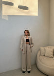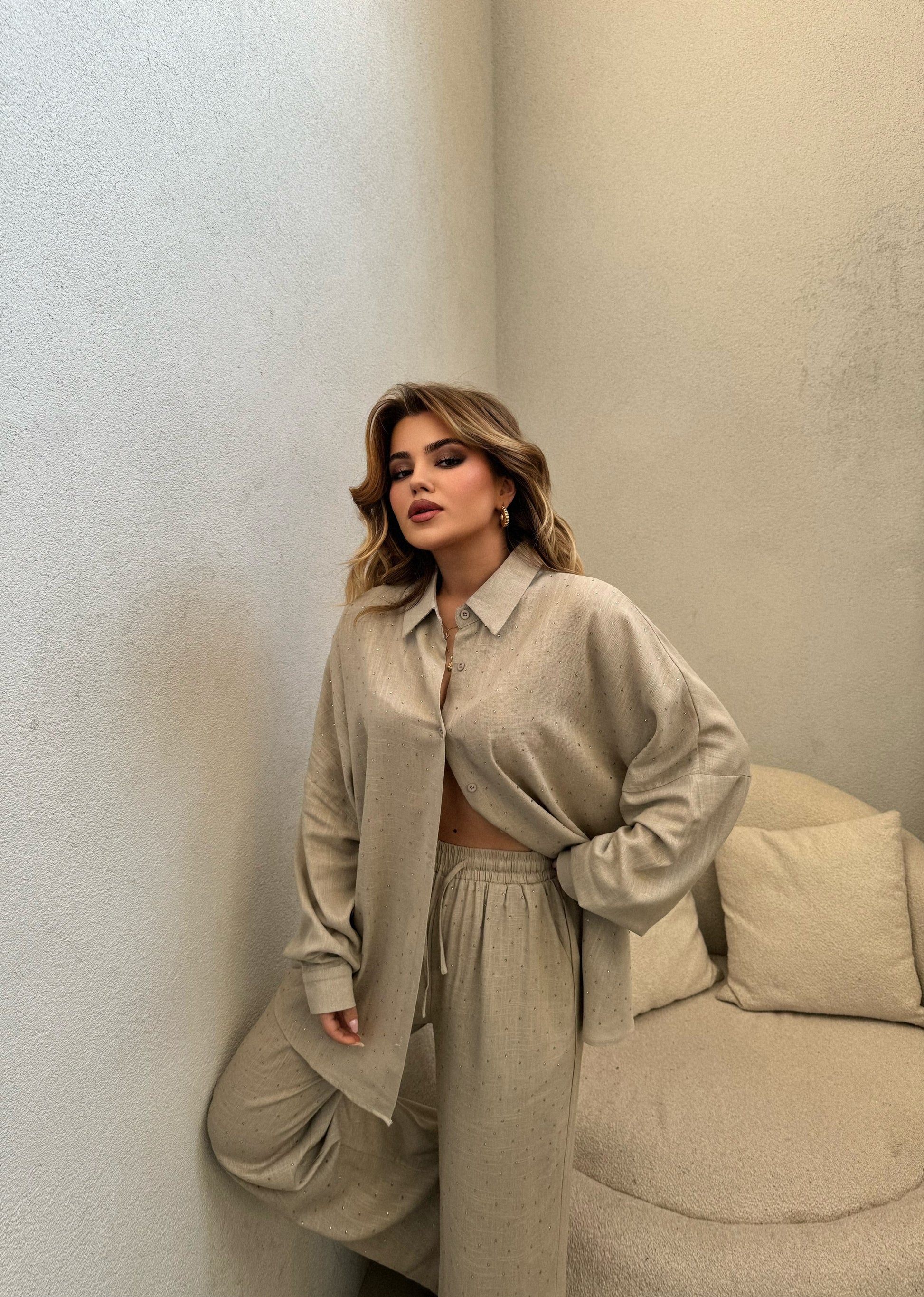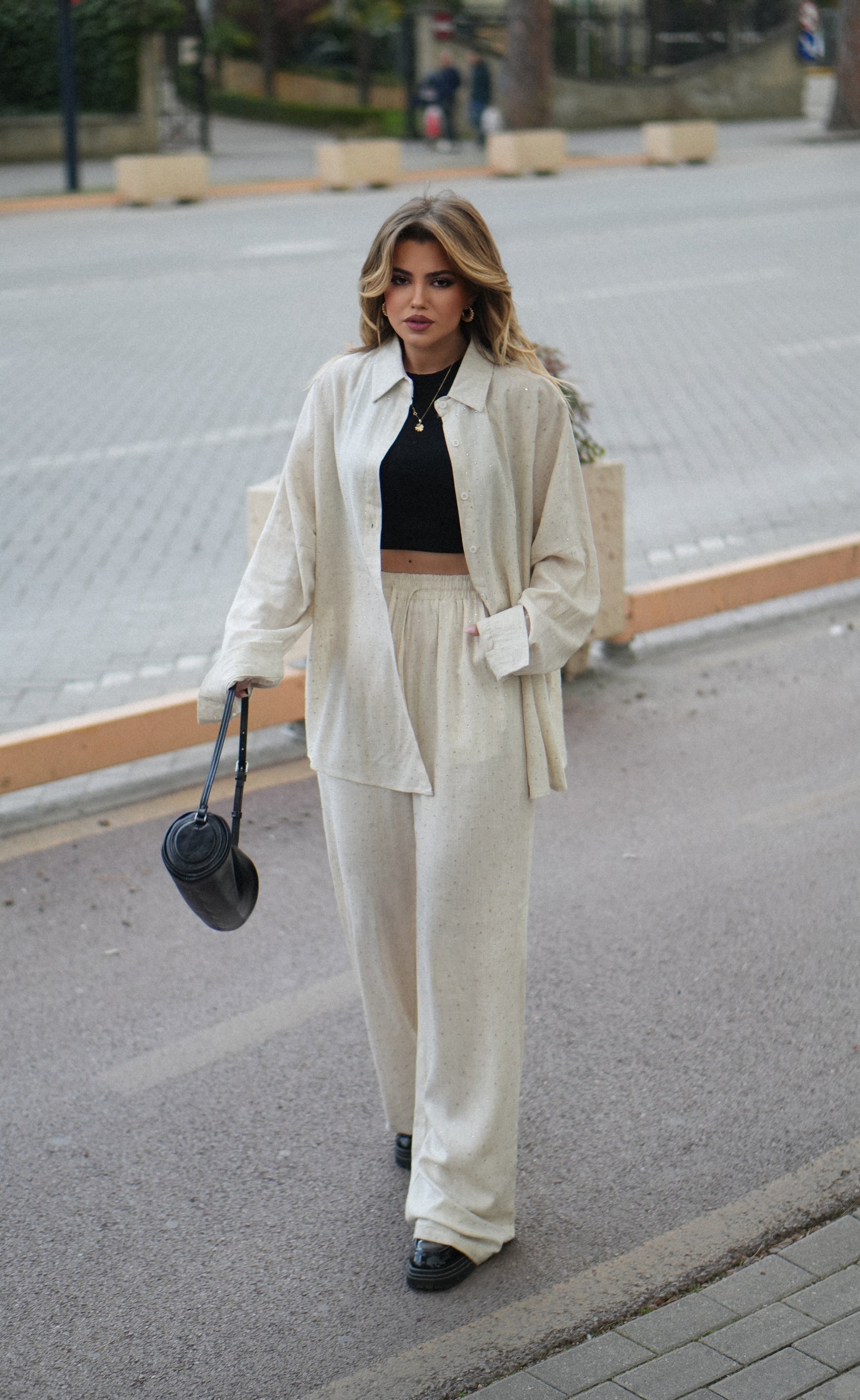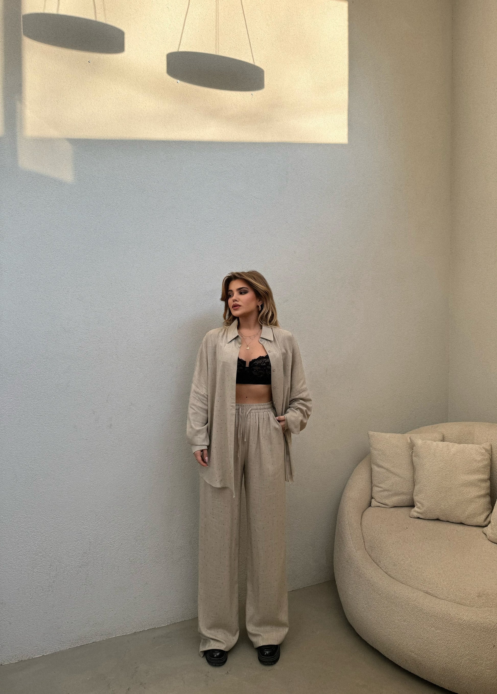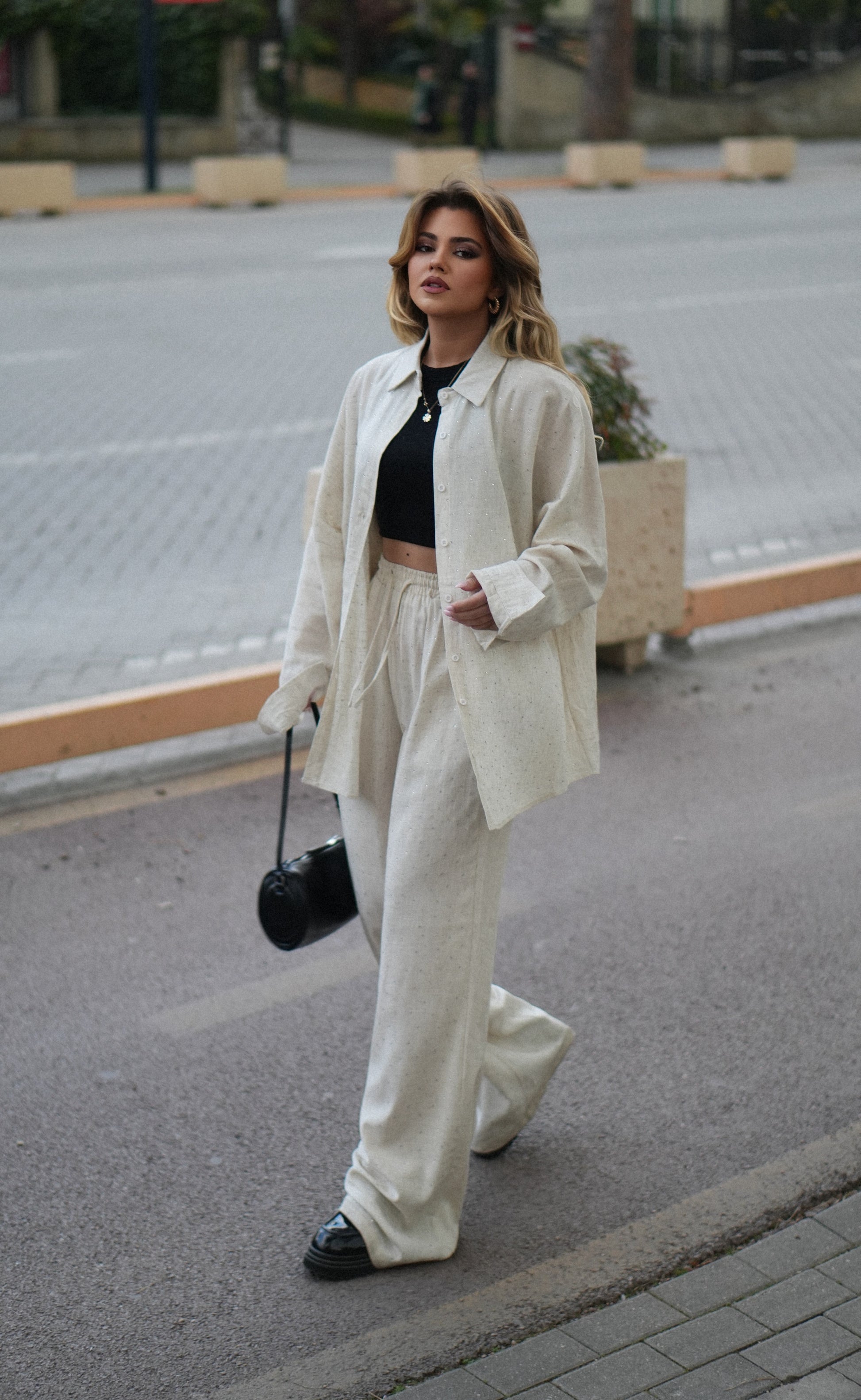 Kostum lino me gure i perbere nga kemisha e cila ka jake te mbyllur dhe detaje kopsash ne pjesen e mengeve dhe mbylljes.Pantallonat kane prerje te drejte,shtat te larte dhe detajin e lidhjes .