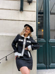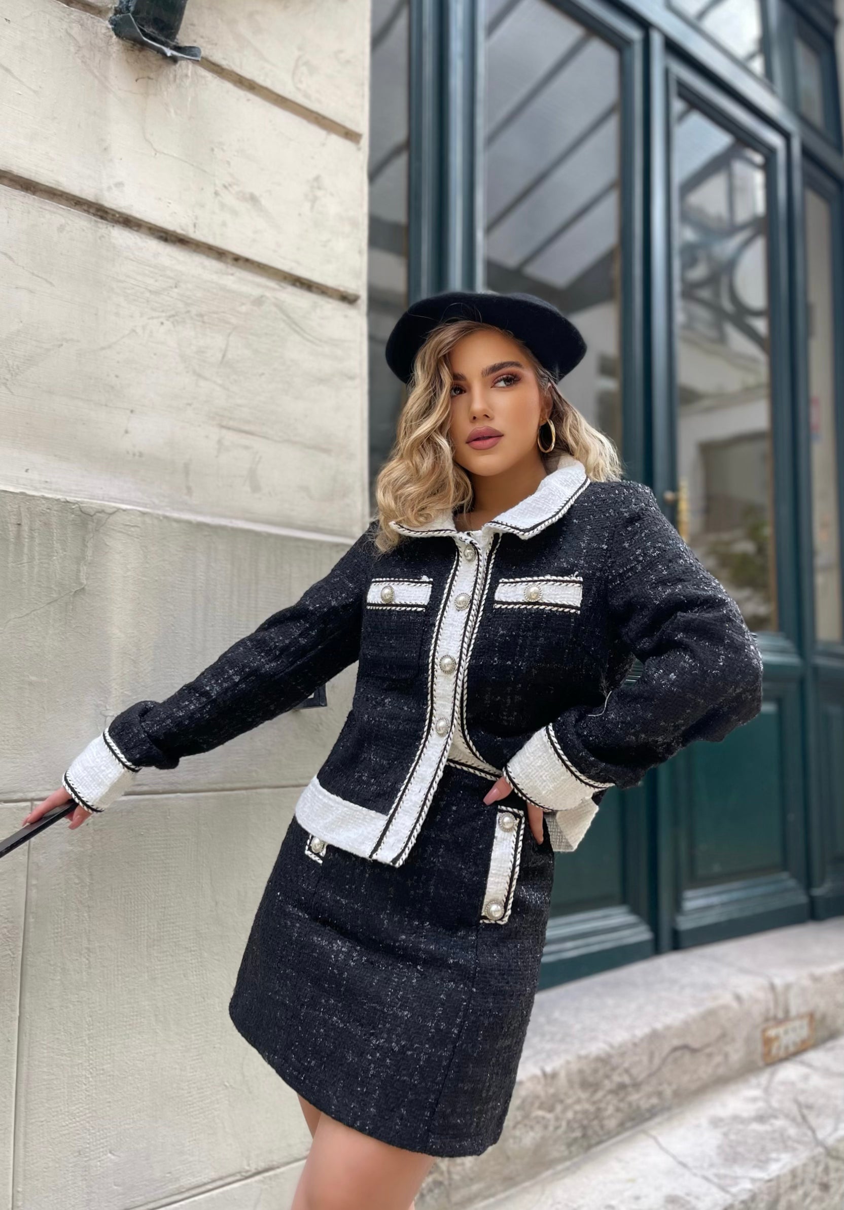 Set fund dhe xhaket. Me jake me kapak me menge te gjata. Xhaketa mberthehet me kopsa ne pjesen e perparme. Fundi eshte me qemer ne pjesen e perparme. Fundi eshte xhepa ne pjesen e perparme.