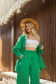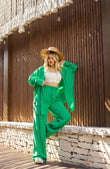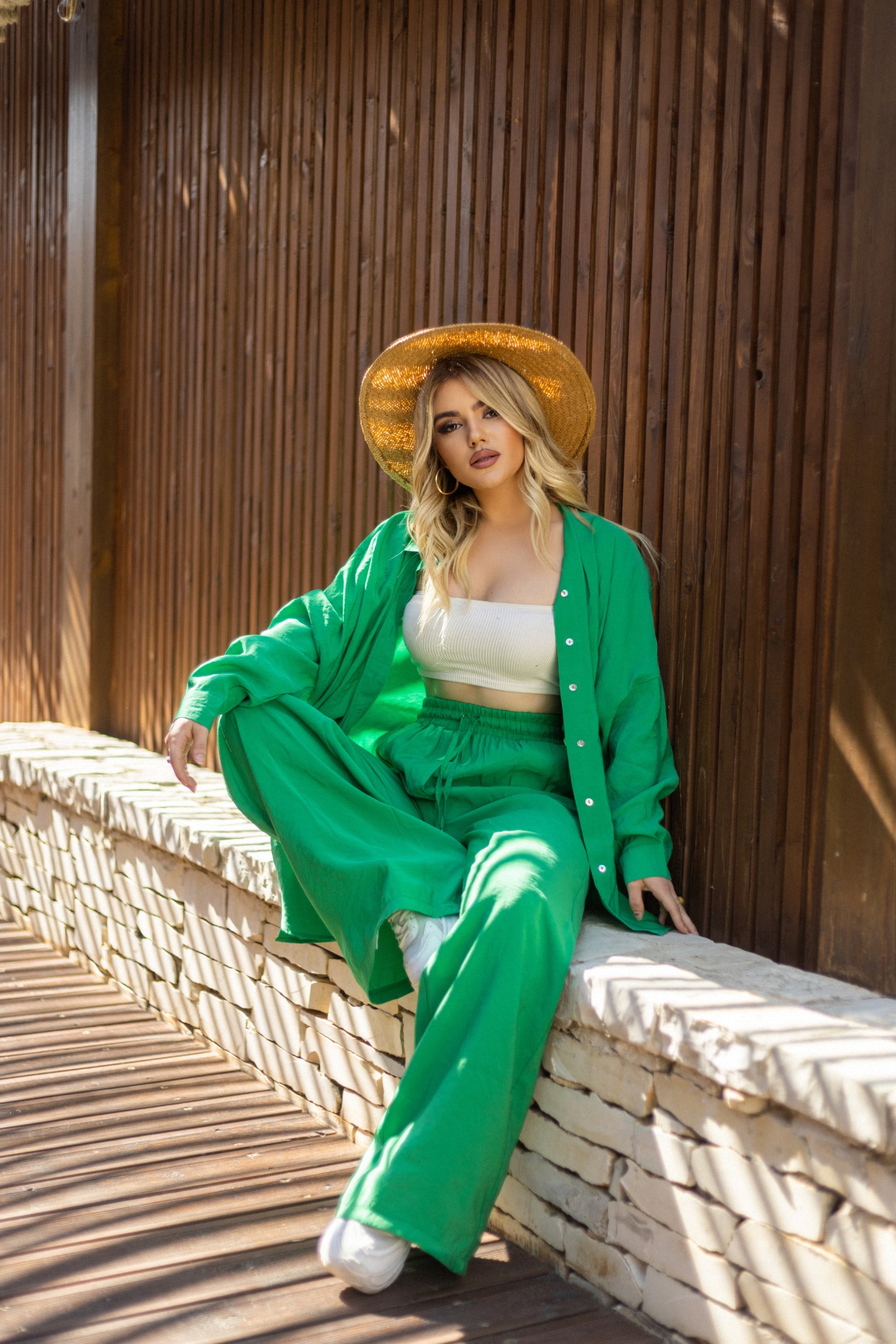 Kostum lino me kemishe dhe pantallona me krahe te gjate. Kemisha vjen me kopsa para dhe jake ne forme V-je. Pantallonat kane llastik dhe rrip ne mes. Ka material te plote dhe cilesi fantastike.