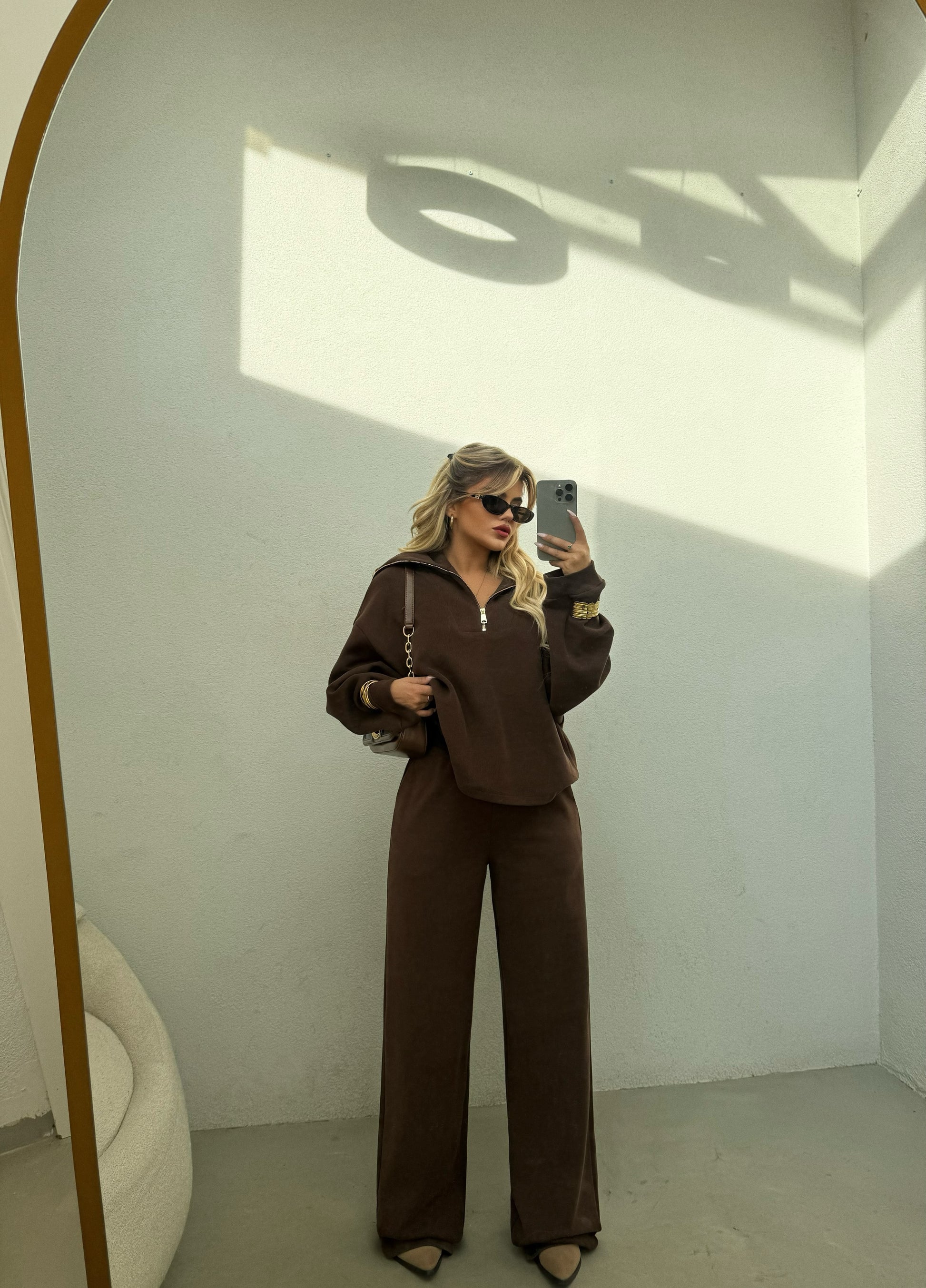 Set ngjyre kafe. Material pambuk i bute dhe i ngrohte per sezonin, model i thjeshte dhe shume komod. Permban bluzen golf me krahe te gjate dhe tuta te gjata.