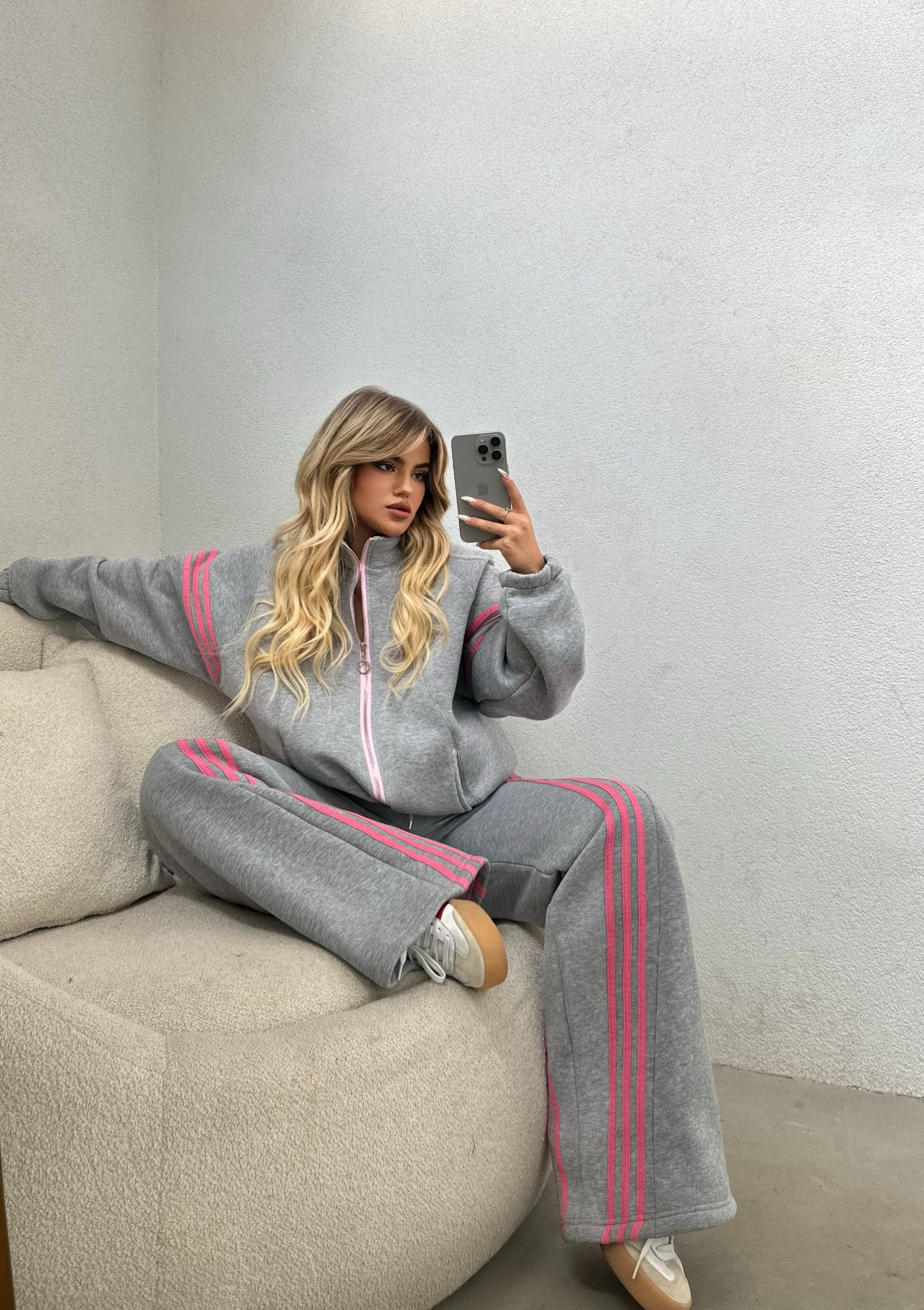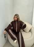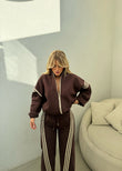 Set sportiv me dy pjese ne ngjyren kafe. Seti permban xhaketen me zinxhire ne stil oversize dhe tutat prerje e drejte. Material i plote dhe i ngrohte.
