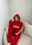Set ne ngjyren e kuqe. Seti perbehet me dy pjese hoodie me kapuc dhe tuta prerje e drejte. Material i bute dhe i ngrohte.