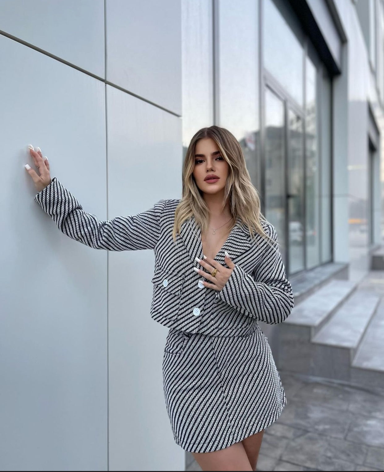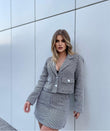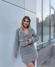 Kostum xhakete dhe fund i shkurter. Xhaketa ka kopsa para dhe xhepa te vegjel. Jaka ka forme V-je dhe material te plote. Super stil dhe cilesi fantastike.