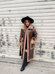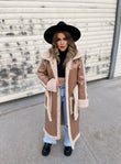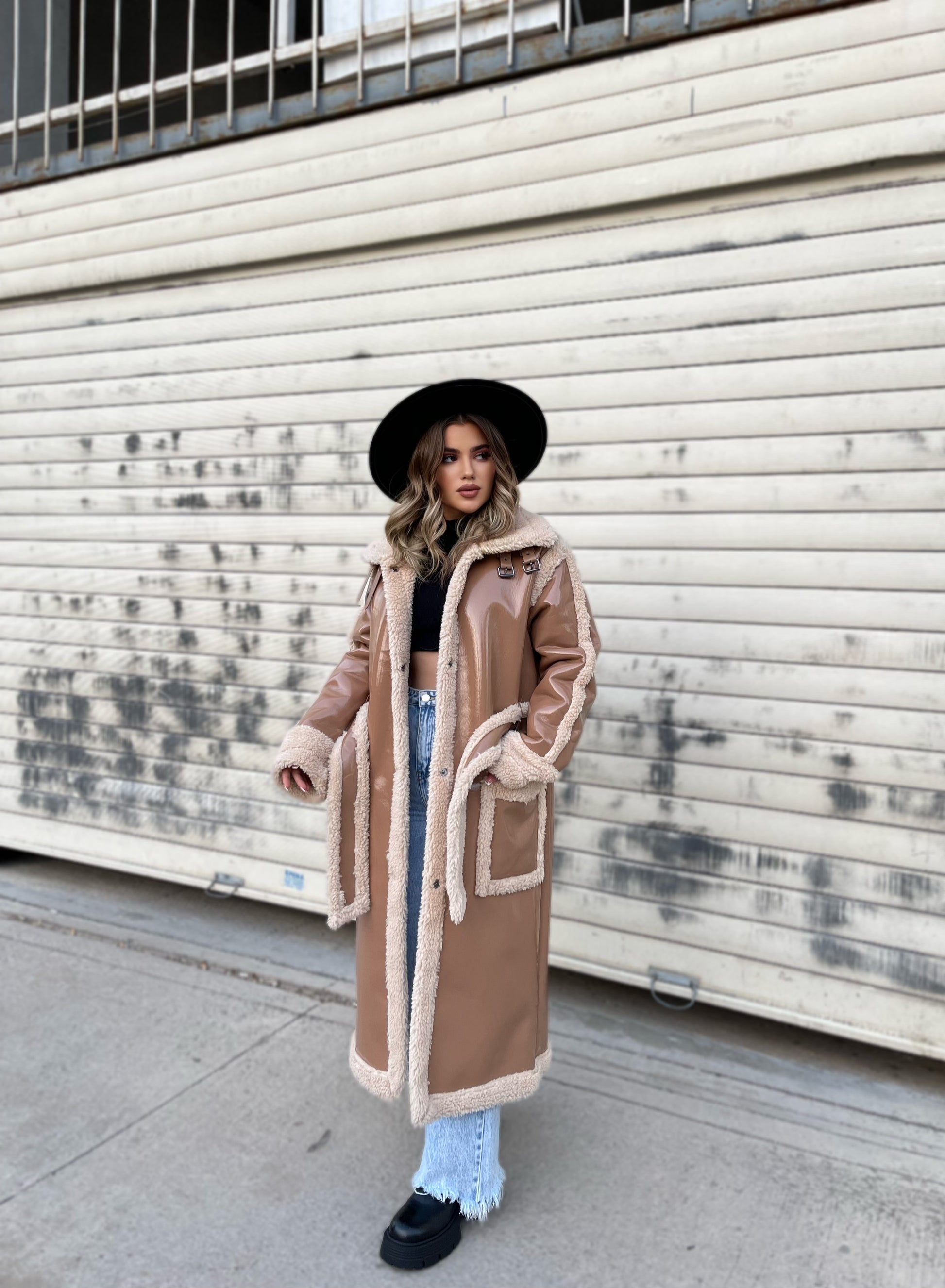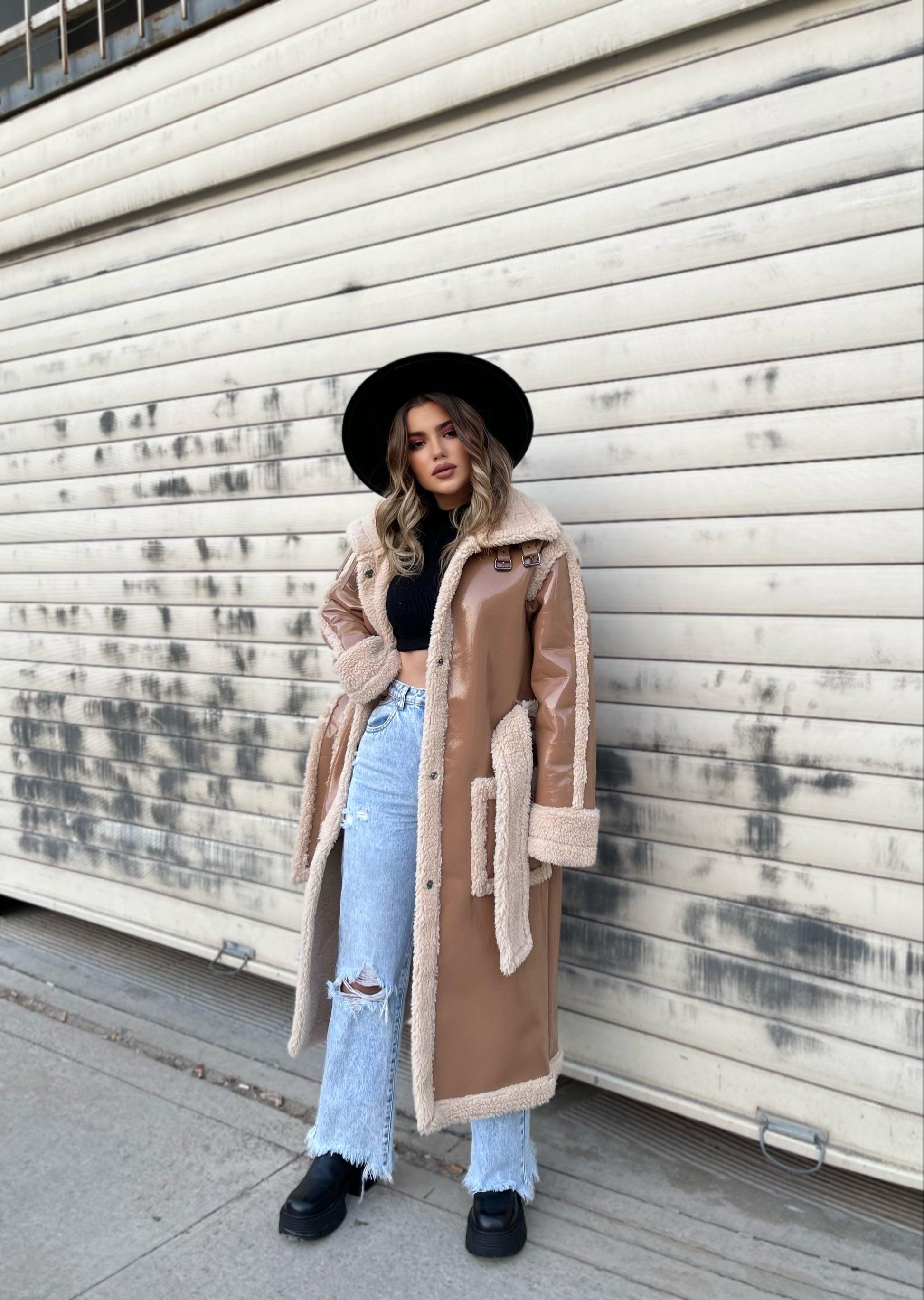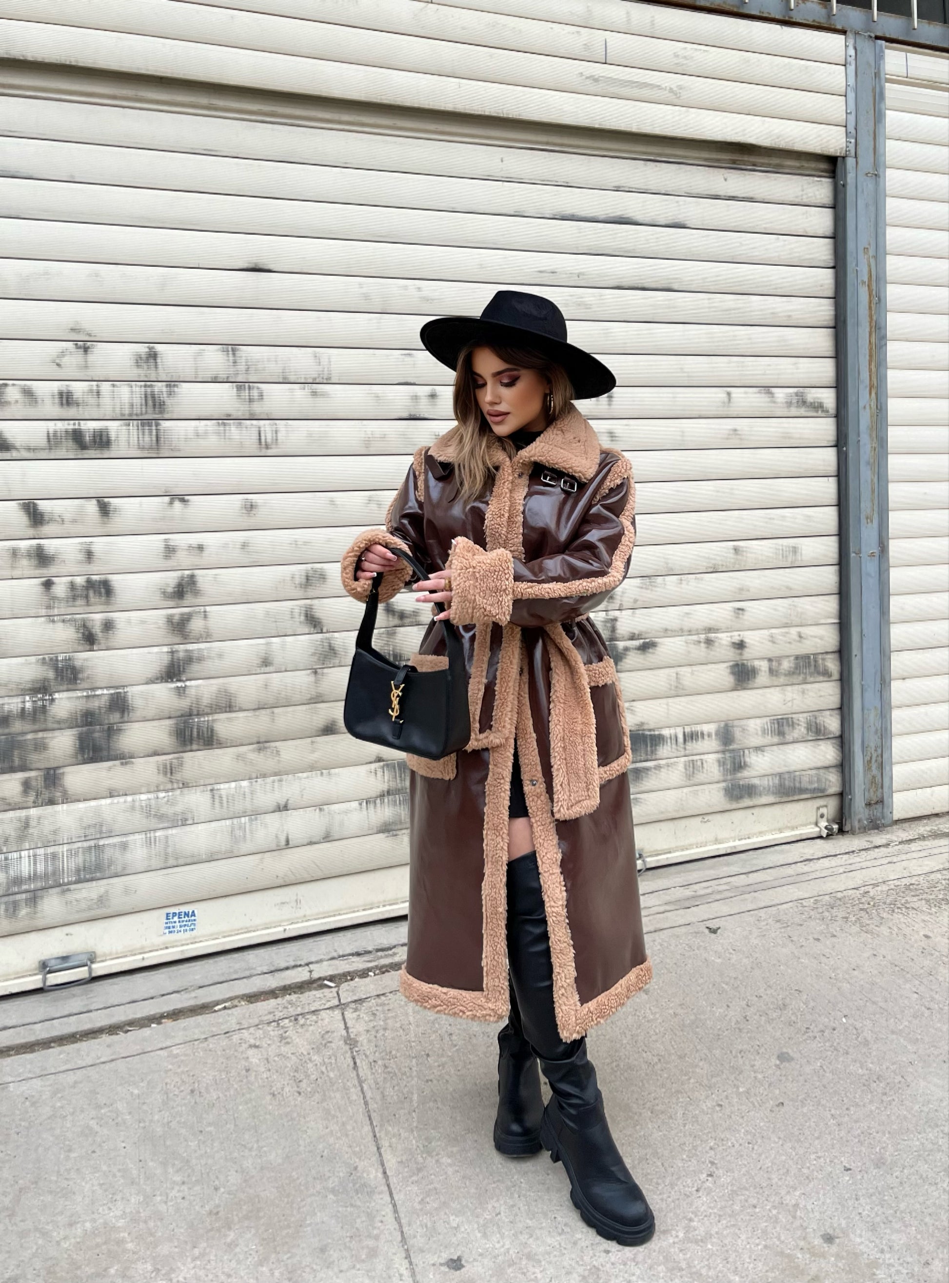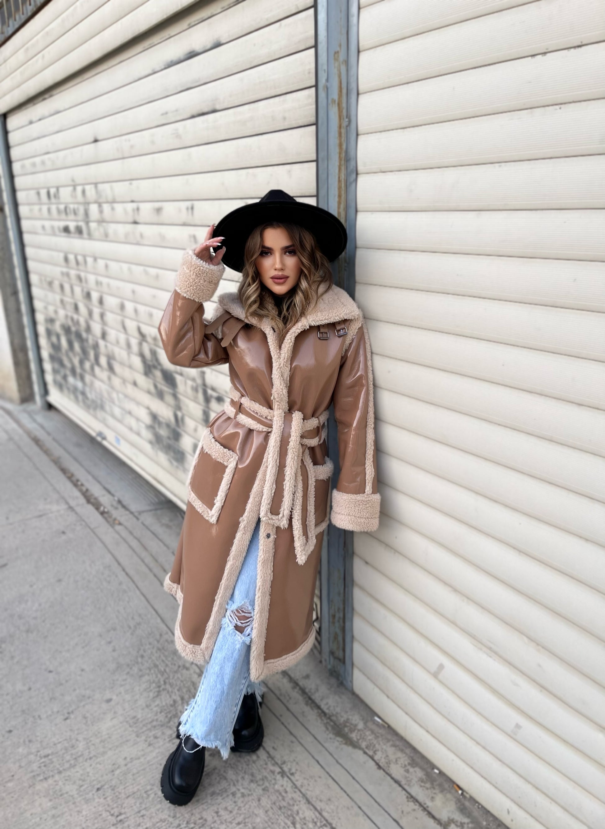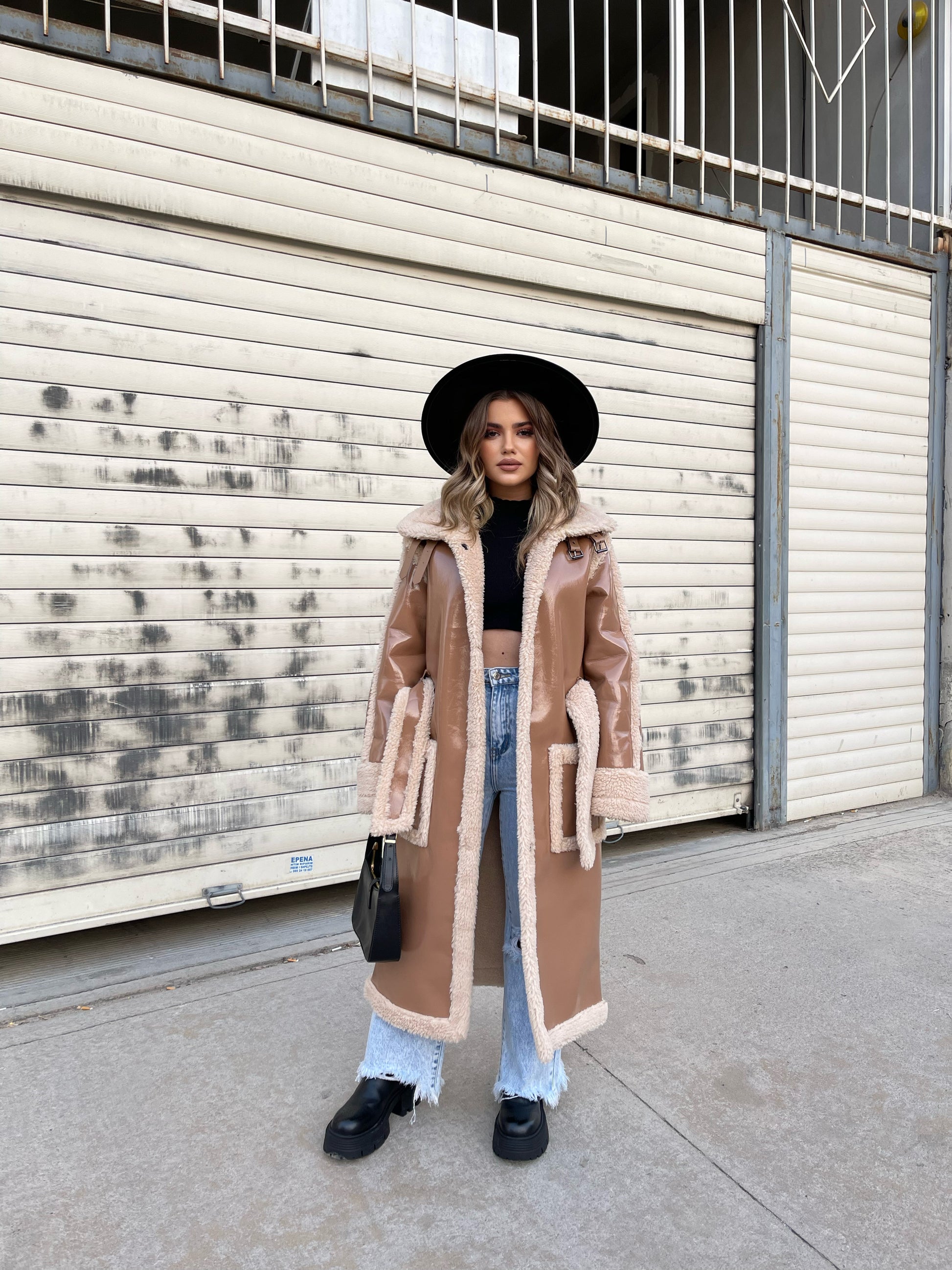 Lekure e gjate me pellush me menge te gjata. Me xhepa pllak dhe rrip ne pjesen e belit. Mberthimi behet me precina ne pjesen e perparme.