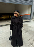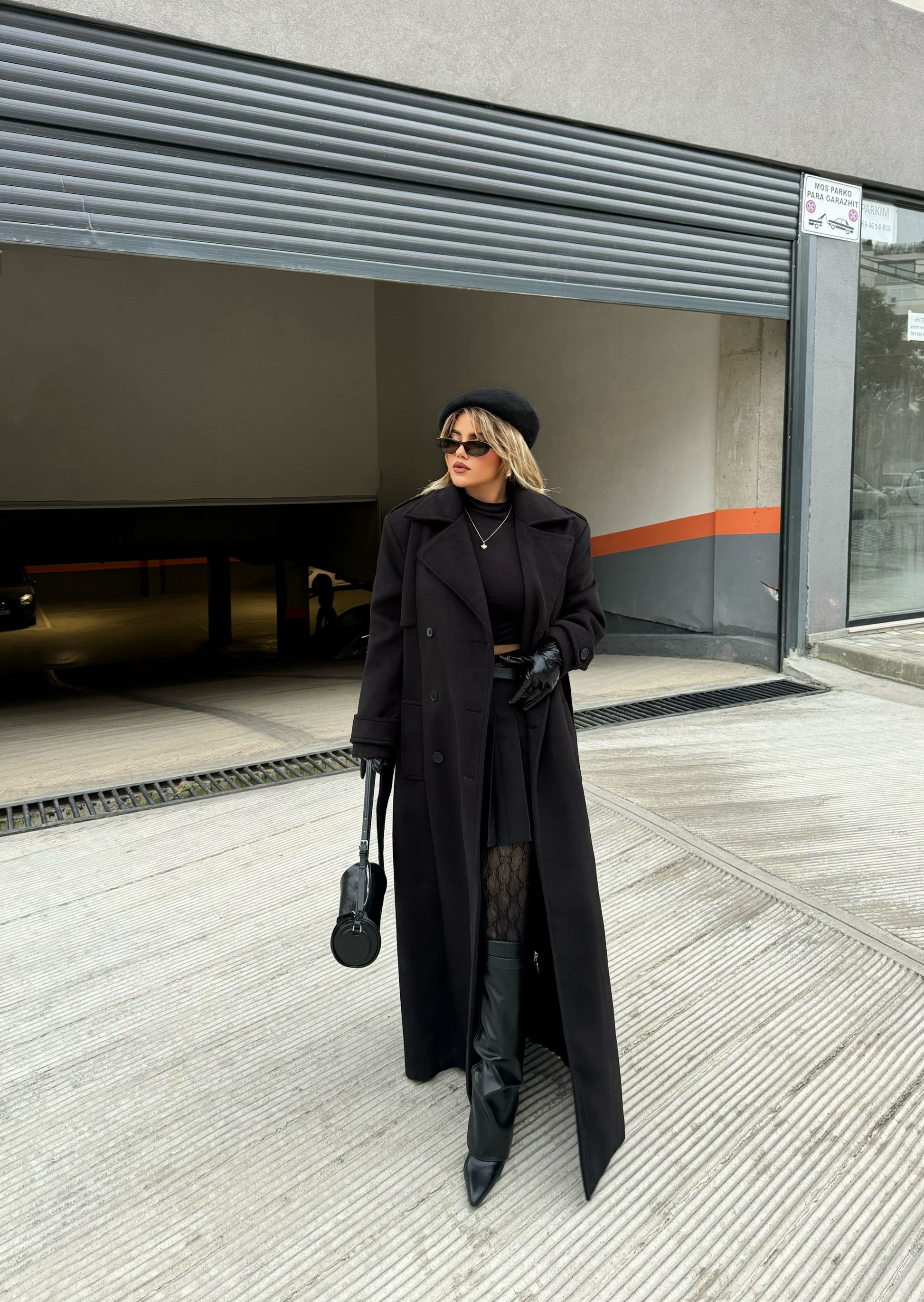 Pallto e gjatë e zezë me kopsa përpara, klasike dhe elegante, që ofron ngrohtësi dhe stil të rafinuar për çdo rast.