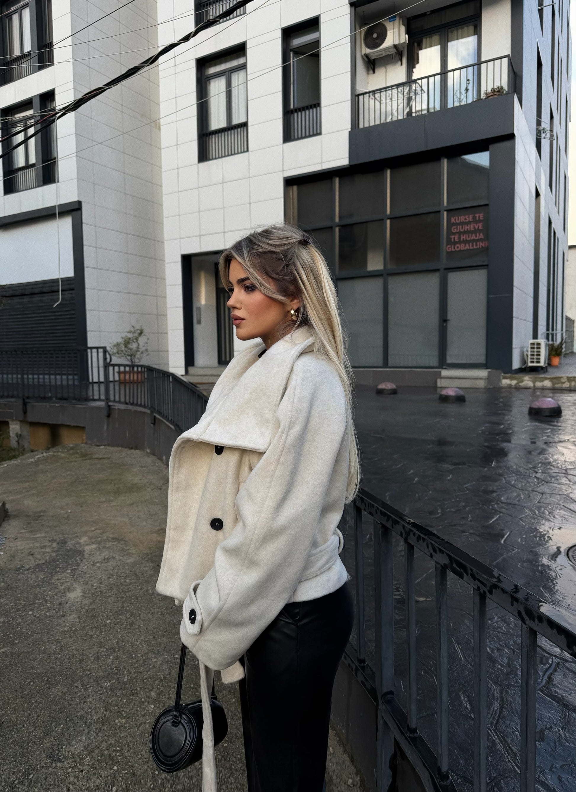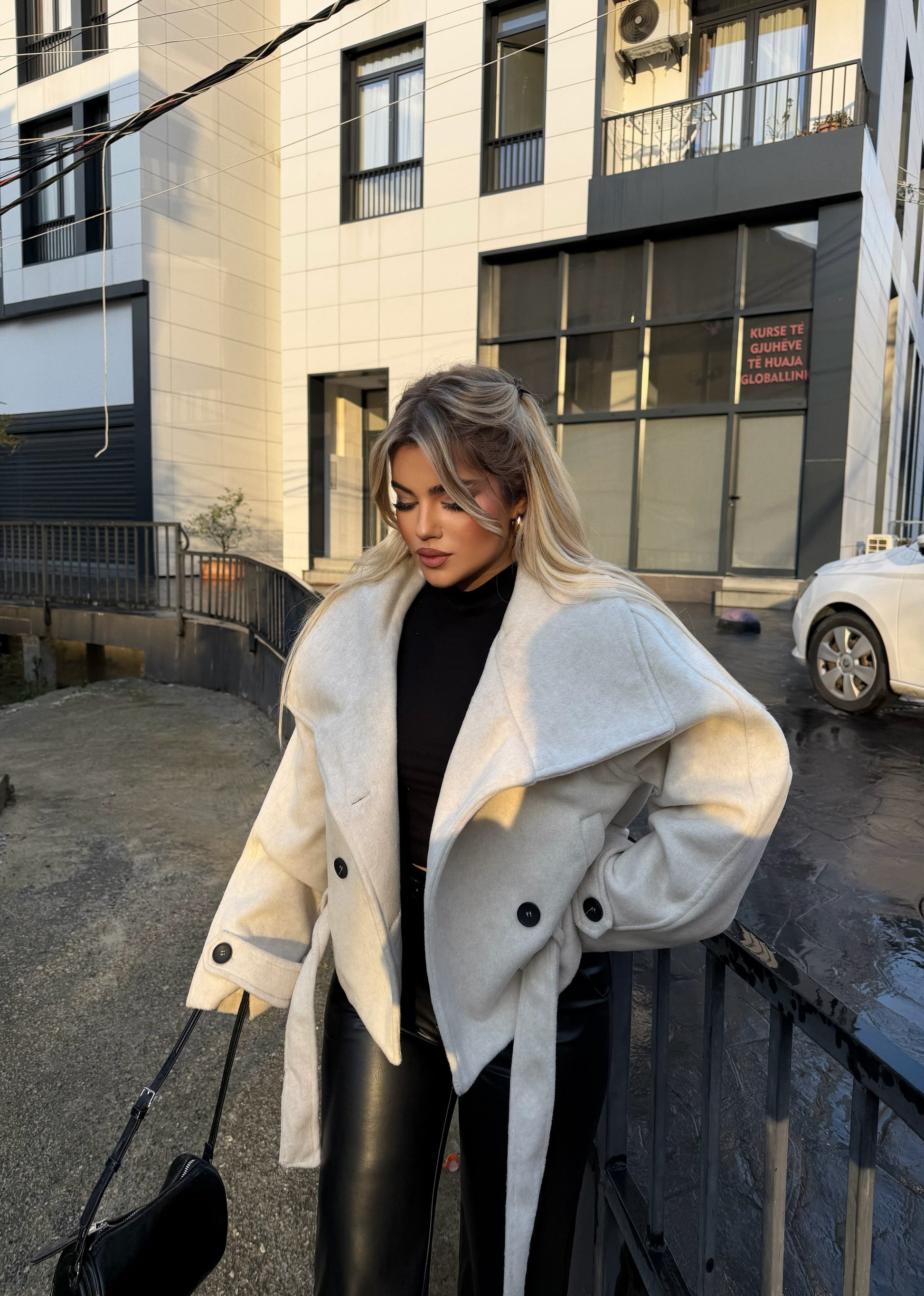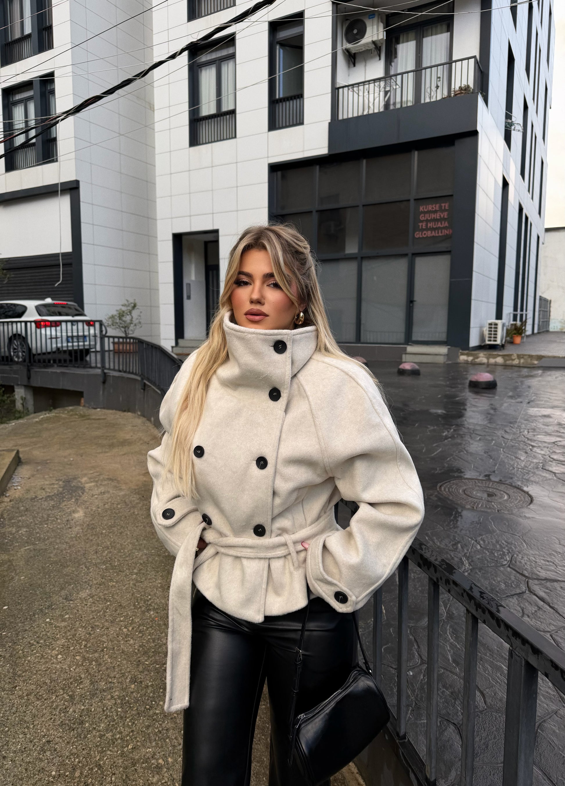 Pallto e shkurtër bezhë, me kopsa të zeza përpara dhe rrip në bel e thjeshtë, elegante dhe shumë e lehtë për t’u kombinuar çdo ditë.