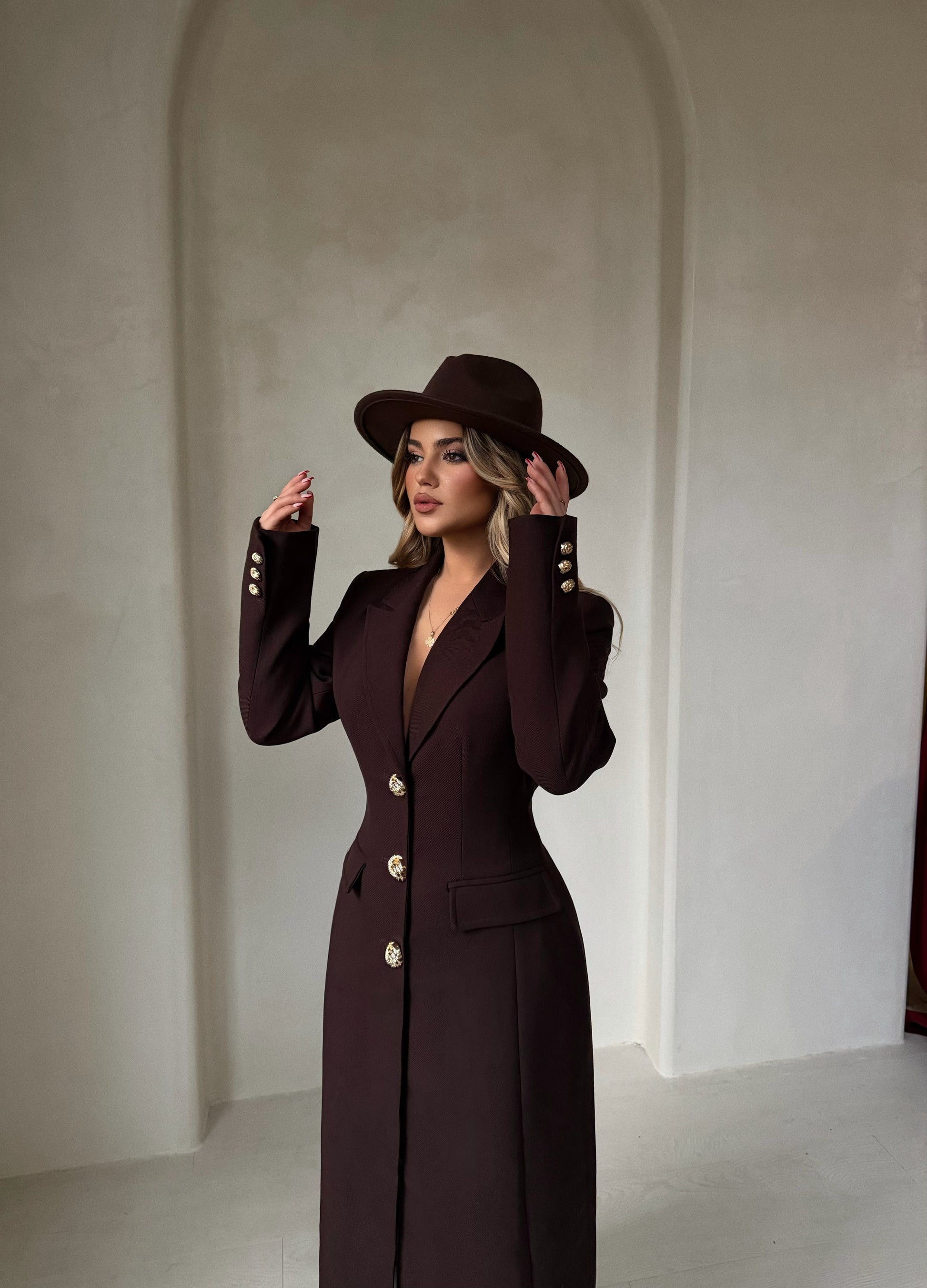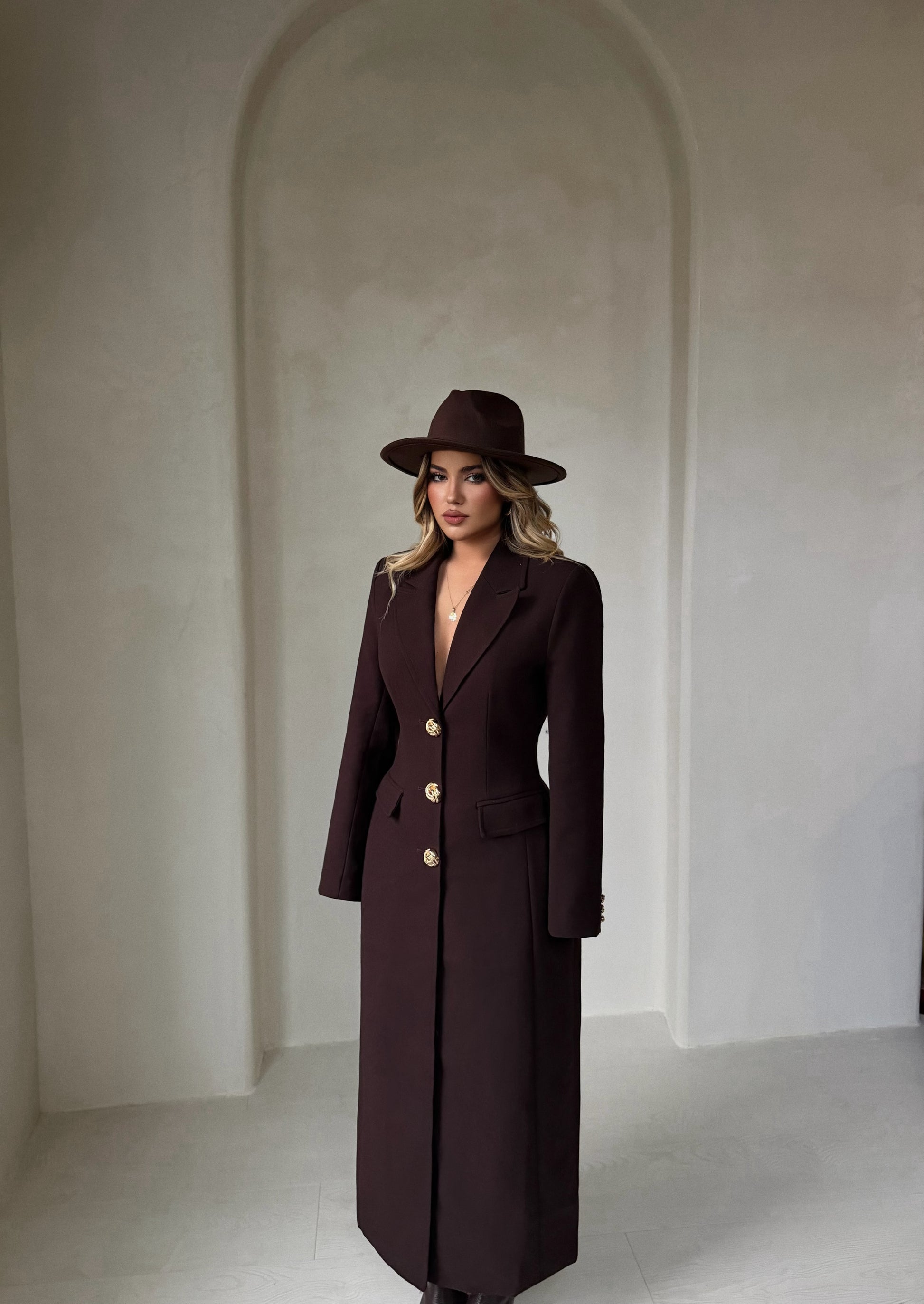 Pallto e gjatë kafe me kopsa përpara, elegante dhe praktike për sezonin e ftohtë.