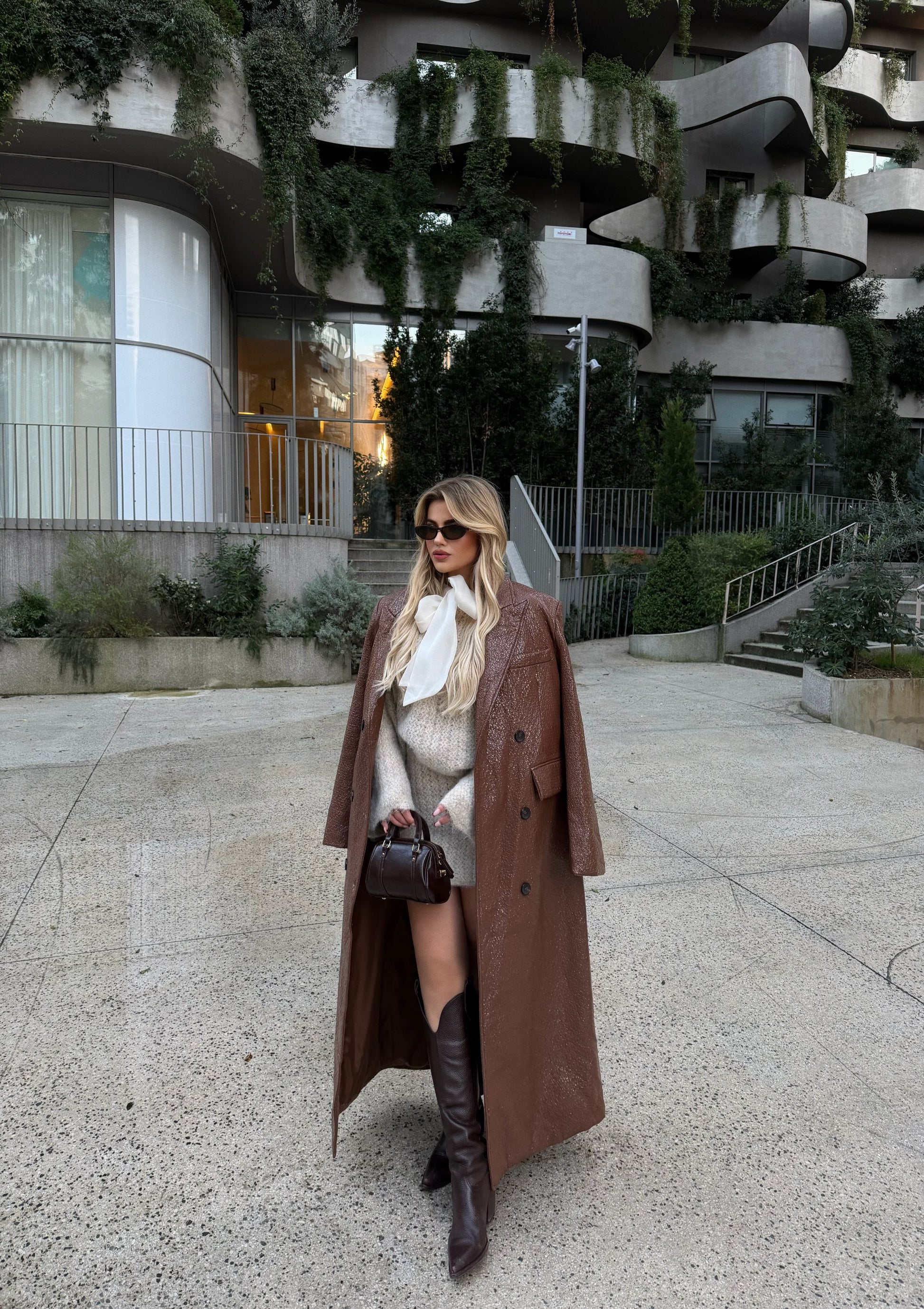 Pardesy lëkure në ngjyrë kafe, me dizajn modern dhe elegant. E ngrohtë, e qëndrueshëm dhe ideal për kombinime stil urbane dhe formale.