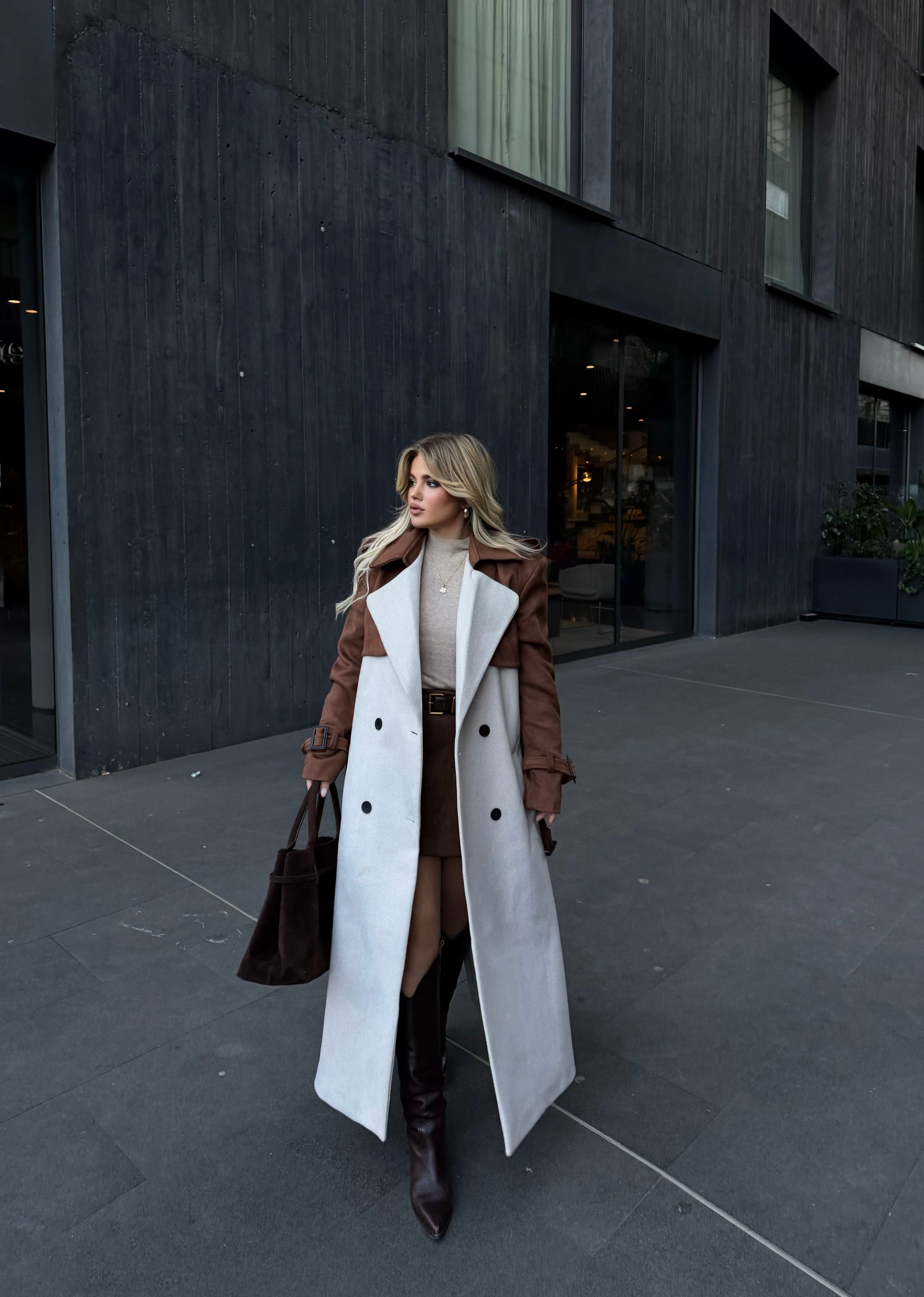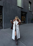 Pallto e gjate. Pallto vjen me nje dizajn te vecant ne dy ngjyra bezhe dhe kafe ne pjesen e krave dhe shpatullave, eshte e shoqeruar me kopsa para dhe rrip. Material i plote dhe i ngrohte. Lehtesishte e kombinueshme.