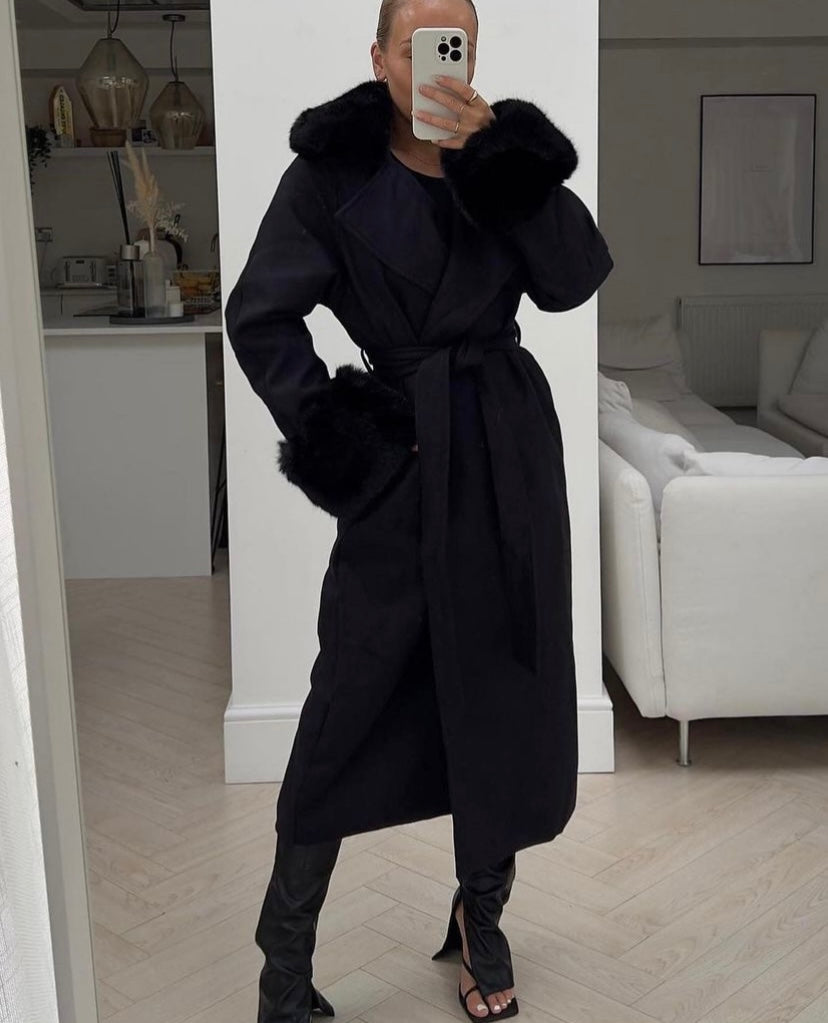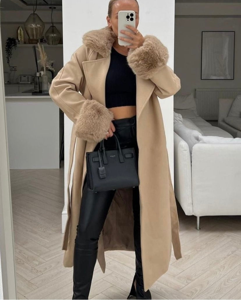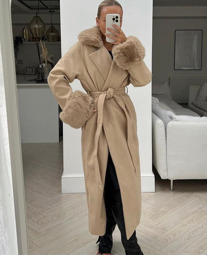 Pallto me pellush tek jaka dhe menget. Palltoja vjen ne prerje te drejte deri ne fund dhe te jep mundesin ta stilosh me rrip ose jo. Gjithashtu menget vijne ne prerje te drejte dhe mbyllen me pellush. Vjen ne dy ngjyra: bezhe dhe te zeze. Palltoja eshte shum stil, teper e kombinueshme ne kete sezon me cdo veshje tuajen.