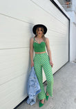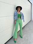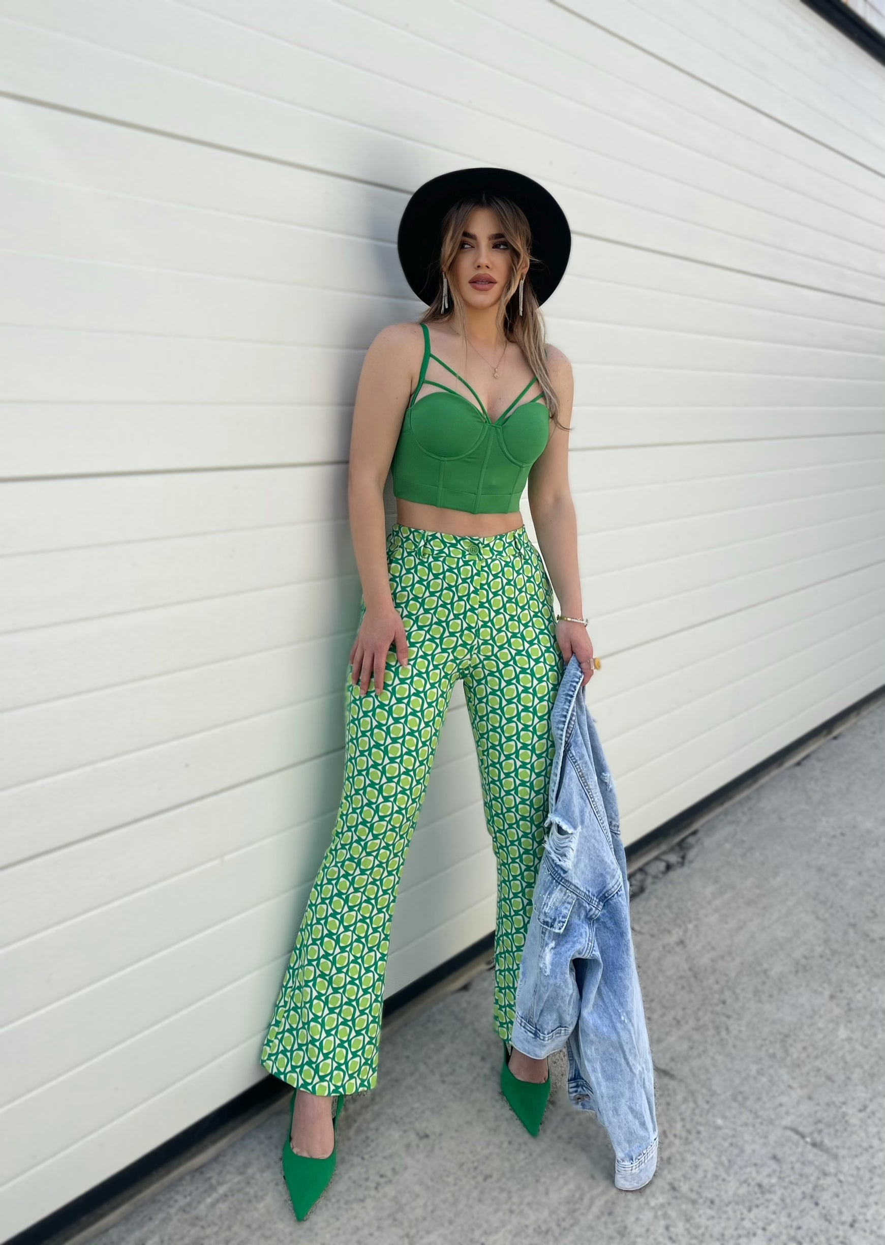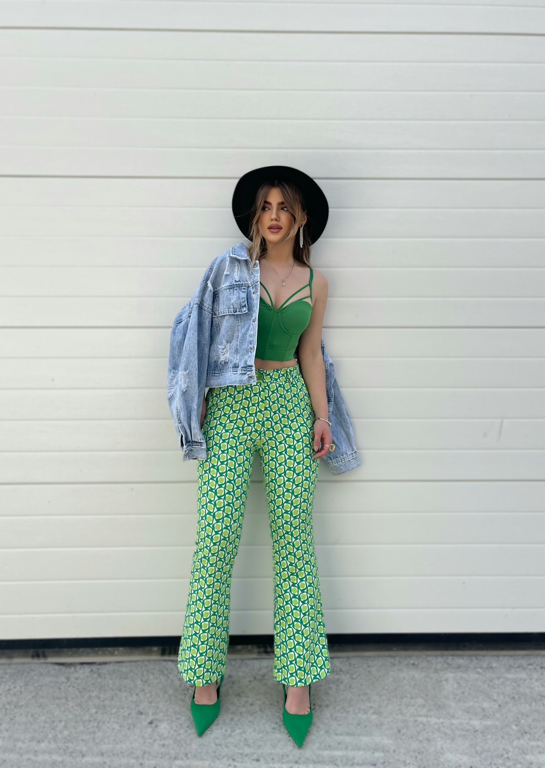 Pantallona me printe jeshile. Me bel te larte. Material qe shkon pas trupit. Rrine perfekt. Poshte vijne me te gjera. Dizenjo fantastike. Stil dhe unike. Te kombinueshme me taka dhe atlete.