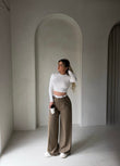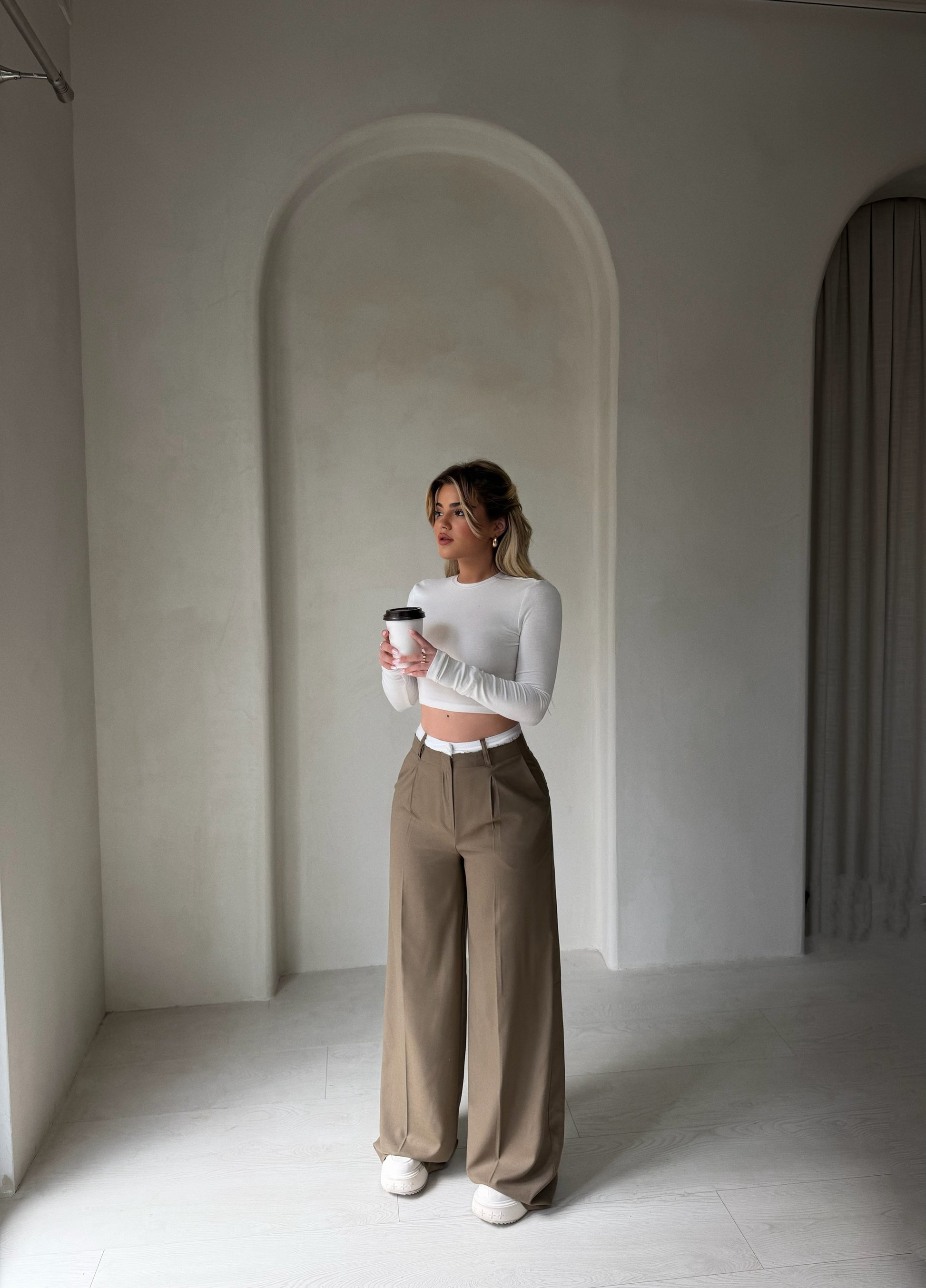 Pantallona ne ngjyren kafe me stil oversize, te shoqeruara me rrip ne bel per nje pamje moderne dhe te rehatsheme. Kombinohen lehte dhe jane ideale per perditshmeri.