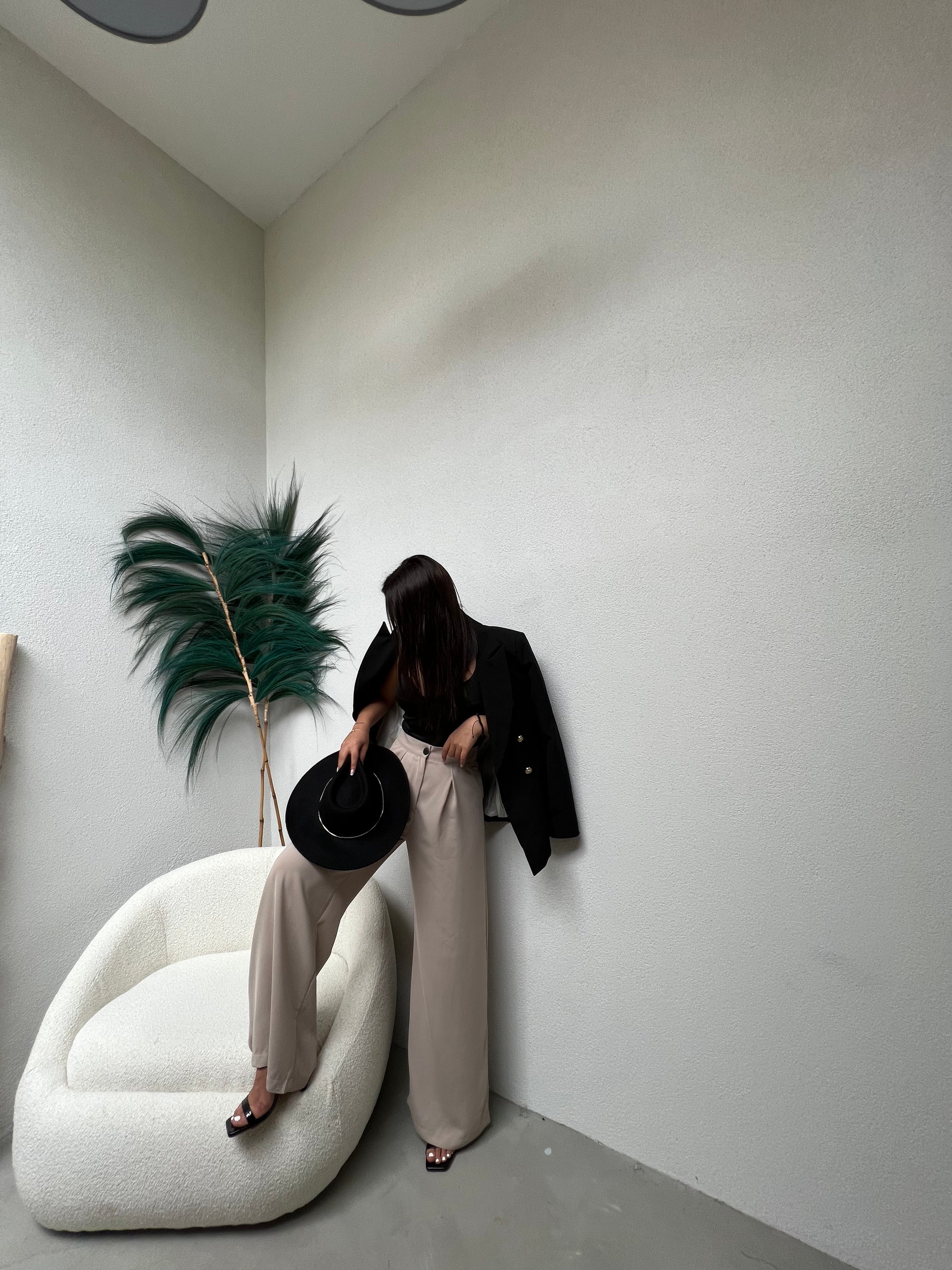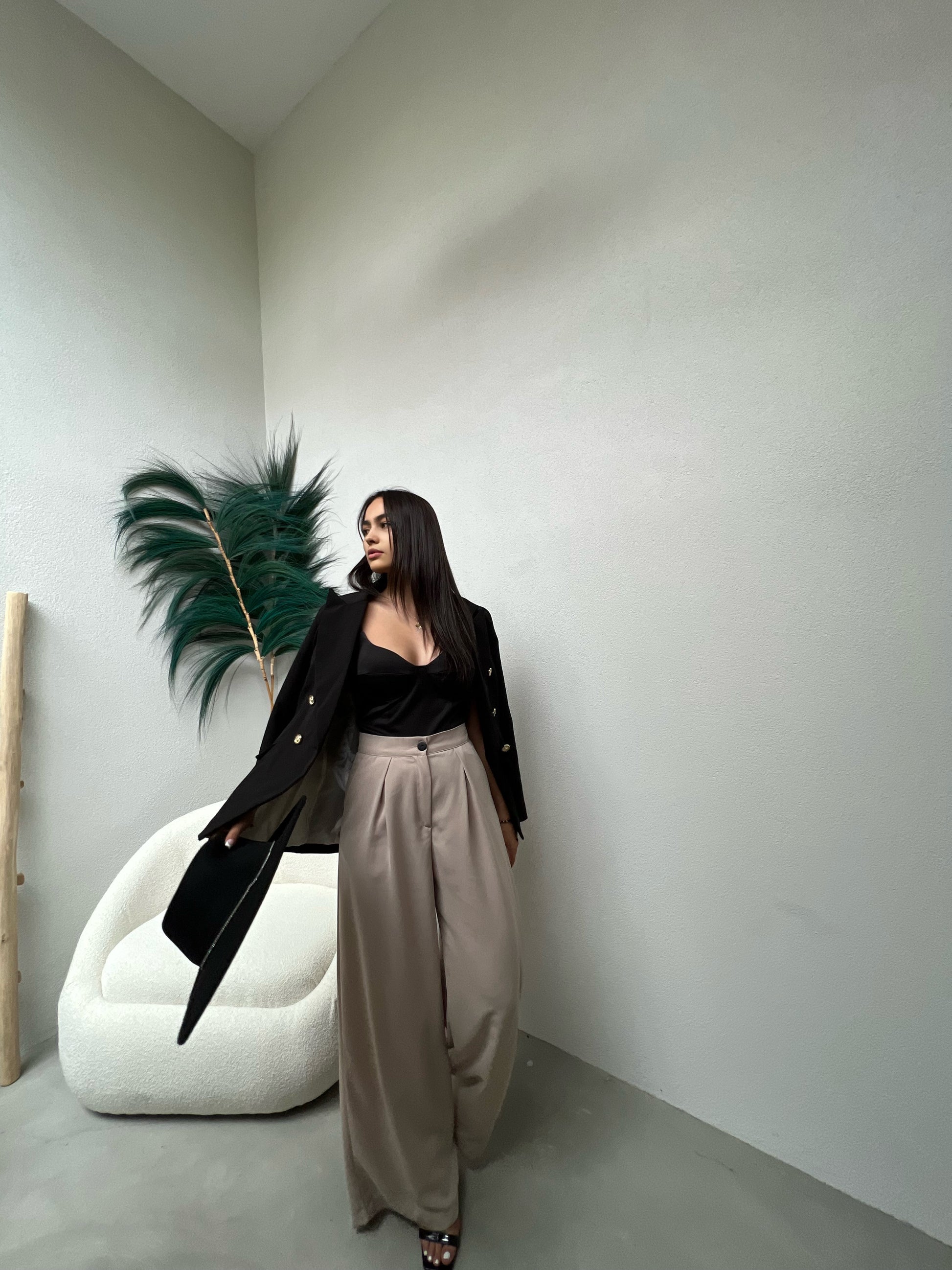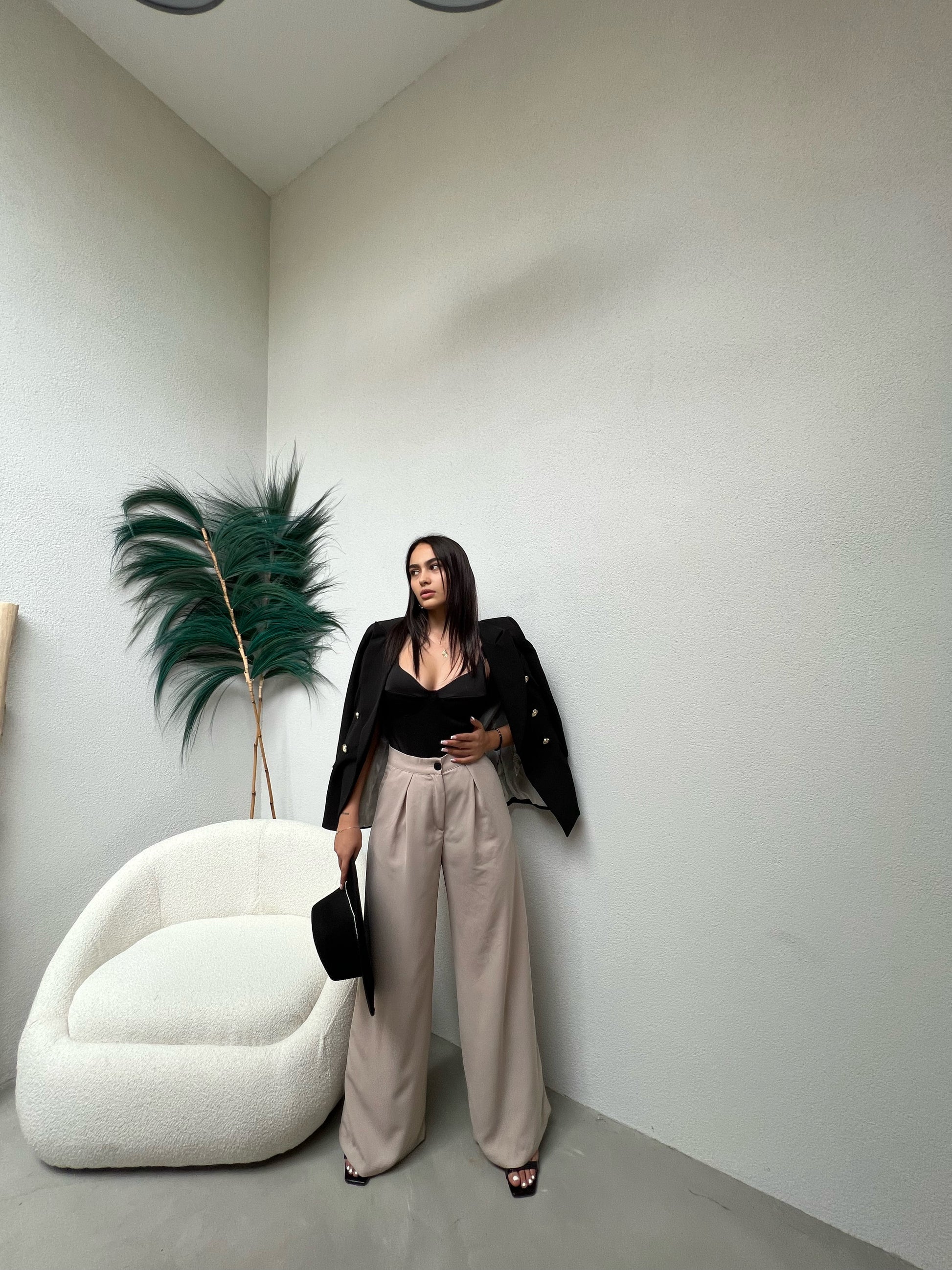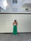 Pantallona te gjata te derdhura. Stil i lirshem, me qemer ne pjesen e belit. Mberthimi behet me zinxhir dhe kops ne pjesen e perparme. Modeli vjene ne tri ngjyra: jeshile bezhe dhe te zeza.