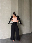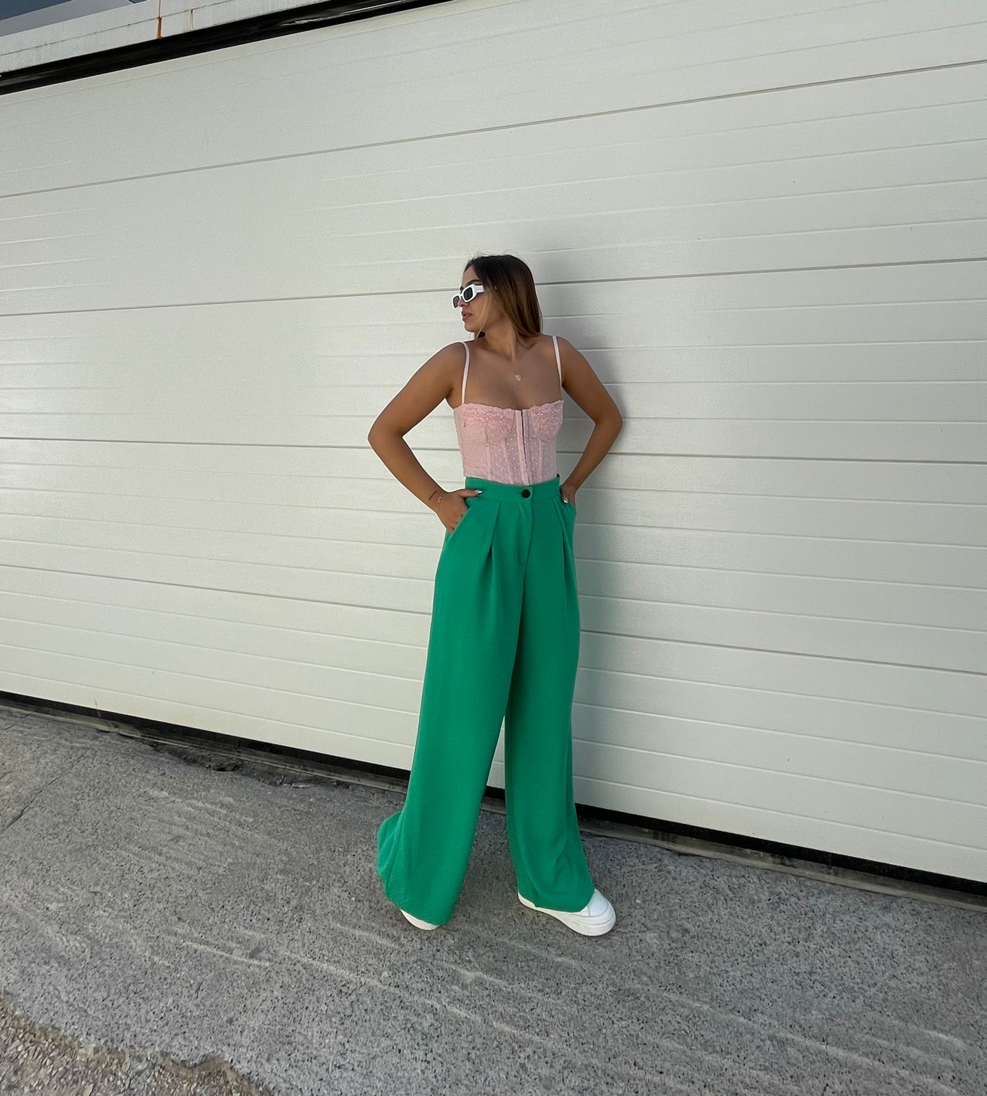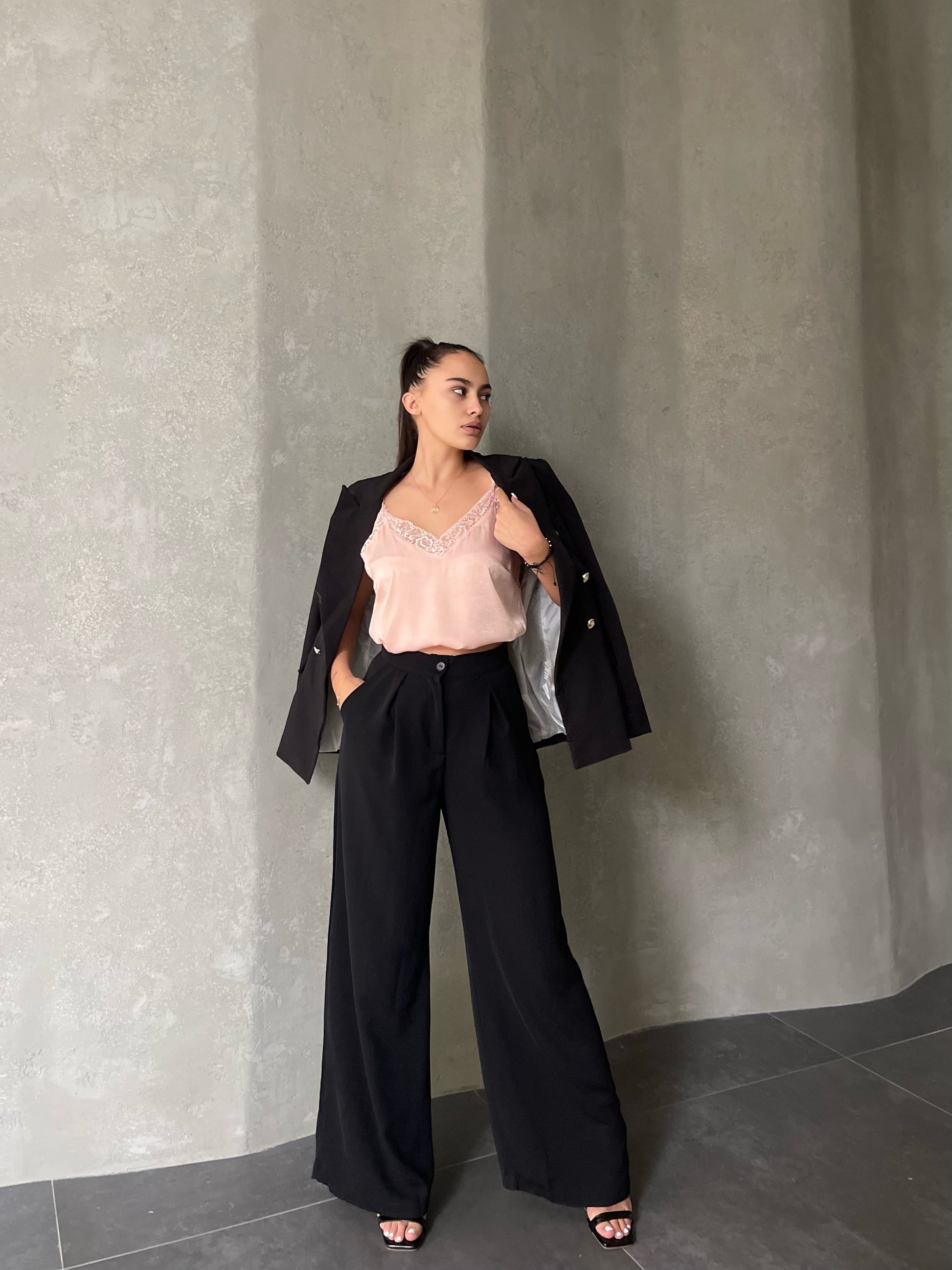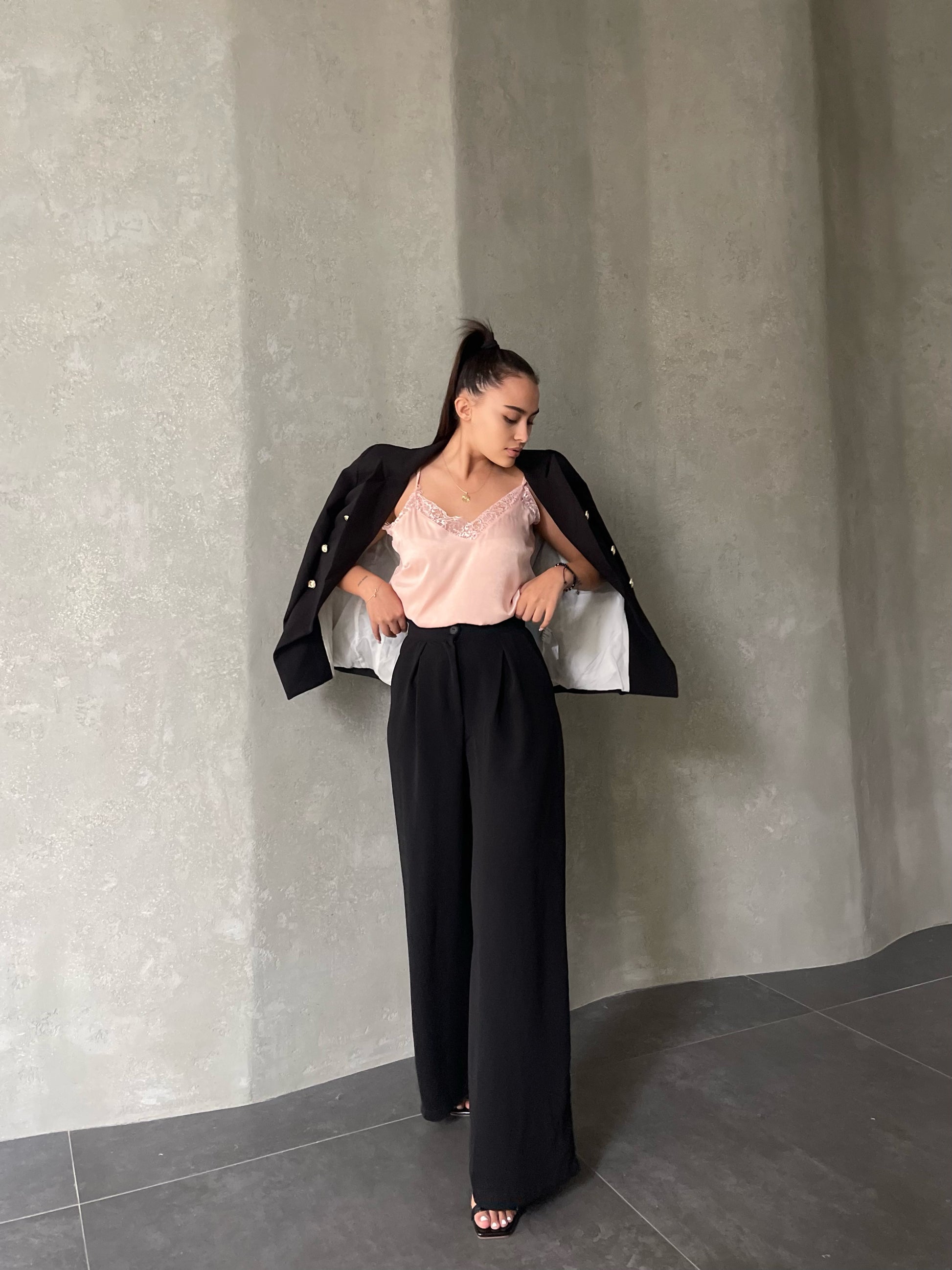 Pantallona te gjata te derdhura. Stil i lirshem, me qemer ne pjesen e belit. Mberthimi behet me zinxhir dhe kops ne pjesen e perparme. Modeli vjene ne tri ngjyra: jeshile bezhe dhe te zeza.