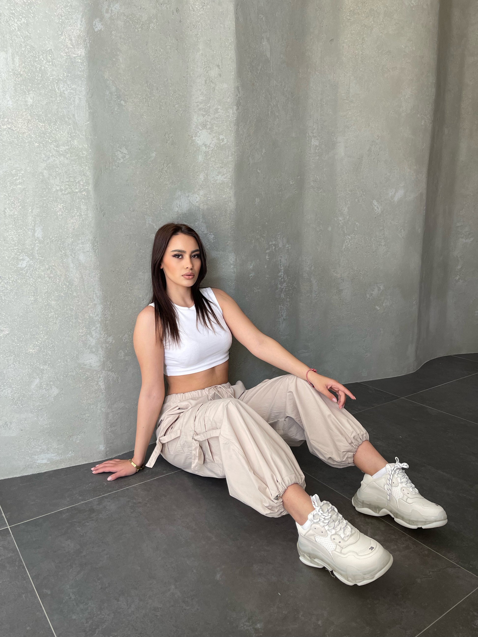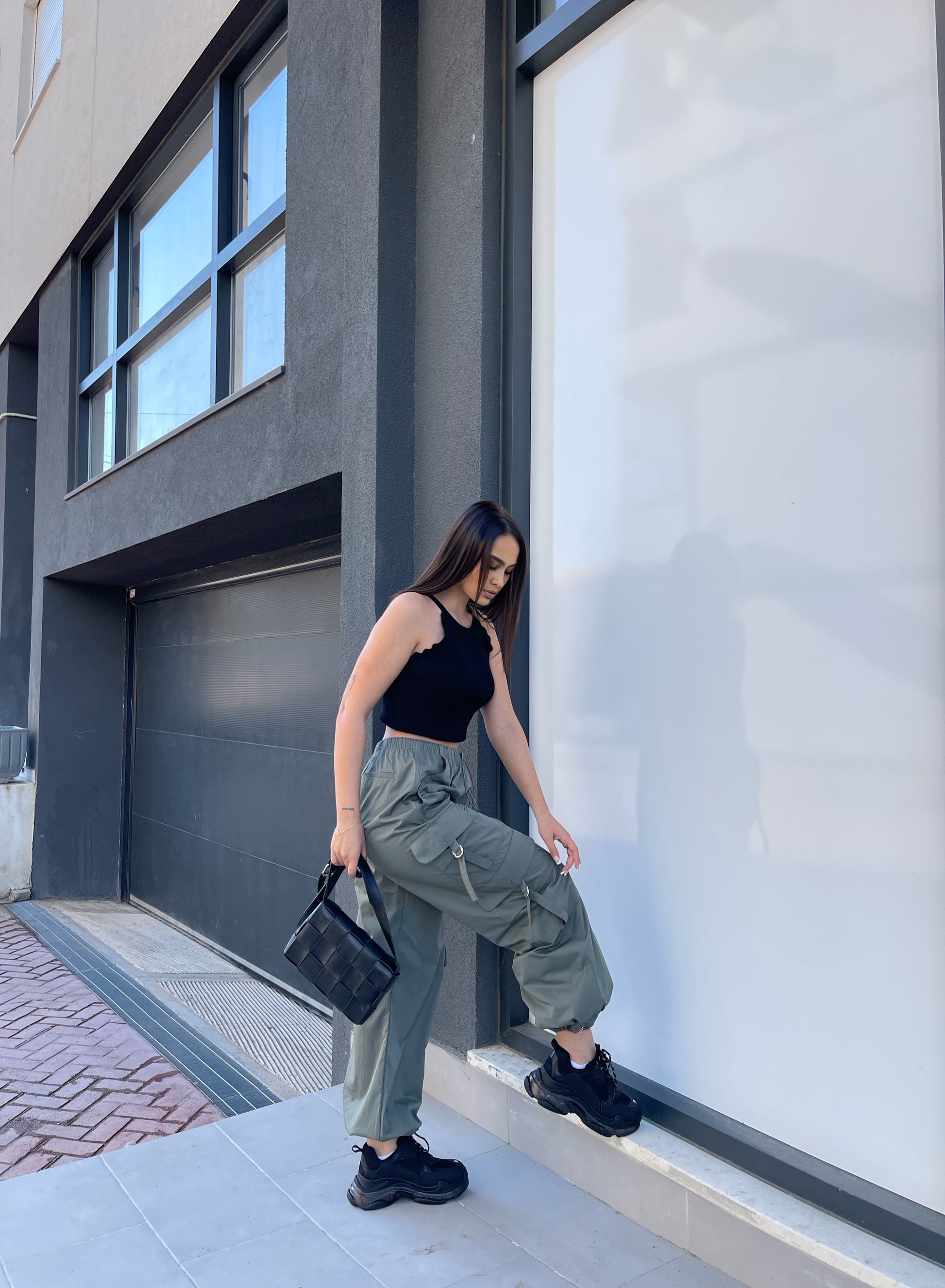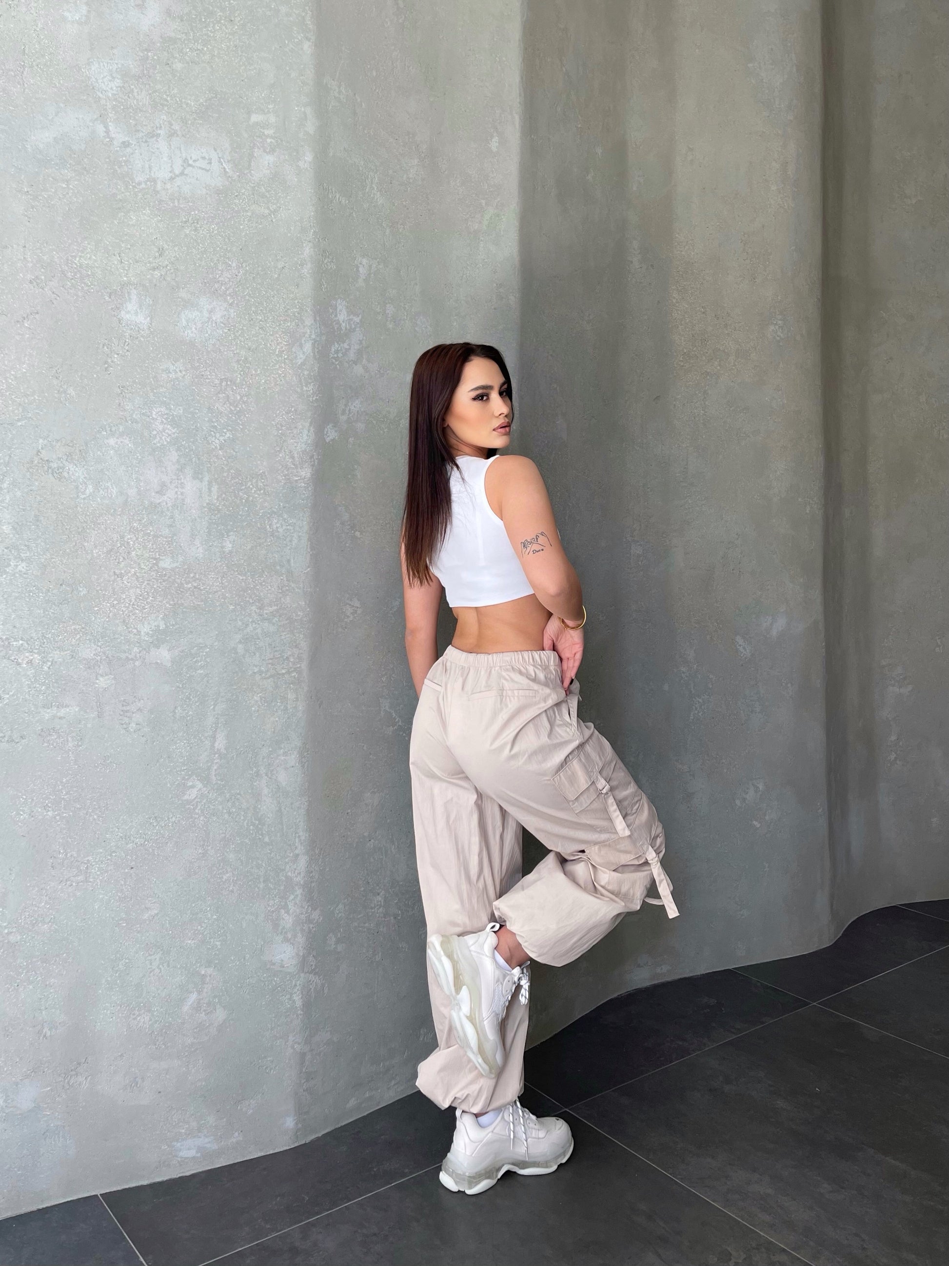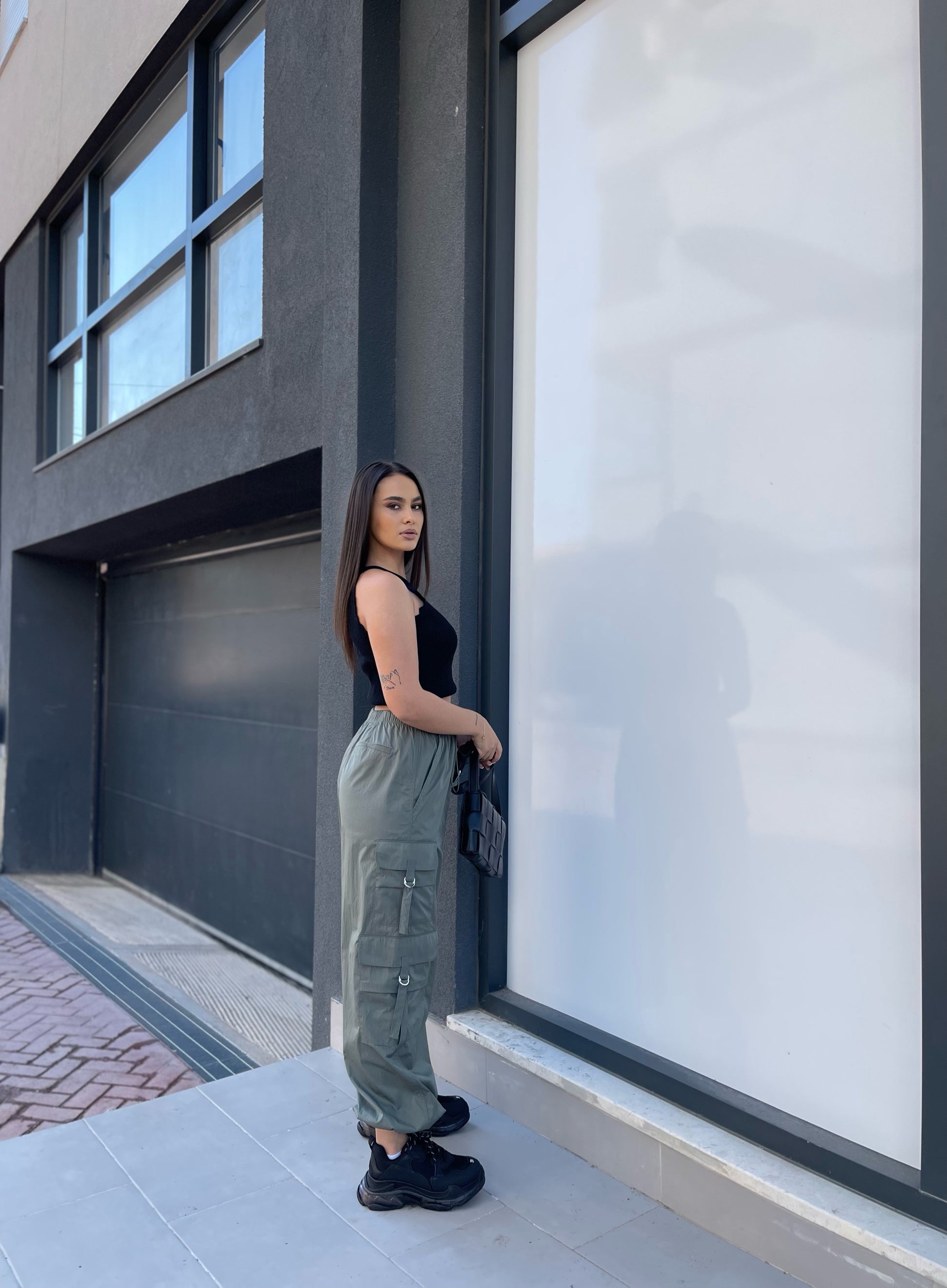 Pantallona te gjera me llastik ne pjesen e belit me xhepa te bollshem ne pjesen anesore. Me llastik ne pjesen fundore. Teper tekombinueshme, shume stil dhe lehtesisht te kobinueshme.
