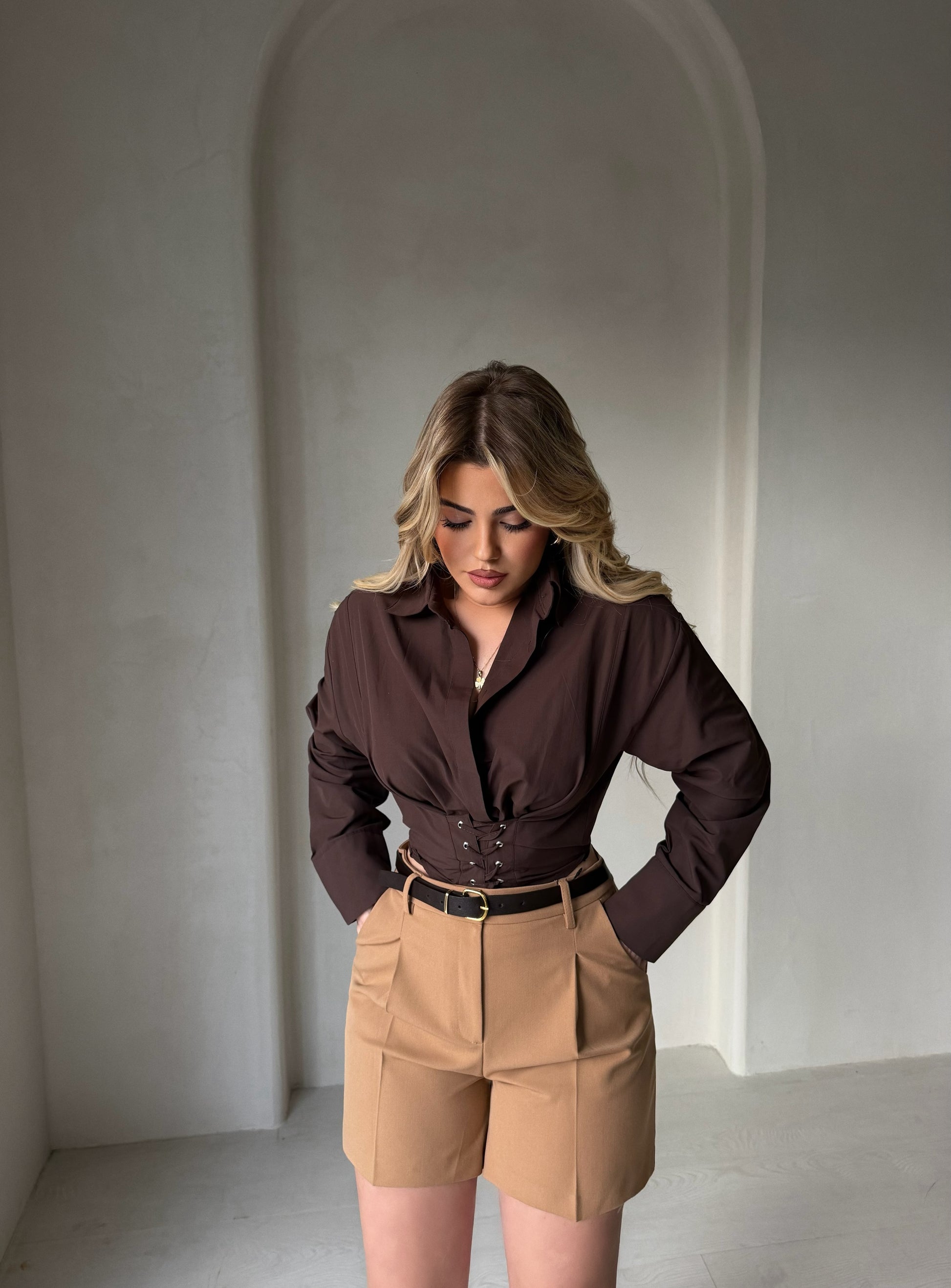 Pantallona te shkurtra ne ngjyren kafe, me prerje elegante dhe rrip ne bel. Te rehatshme dhe shume te lehta per kombinim ne look ditor apo me klasik.