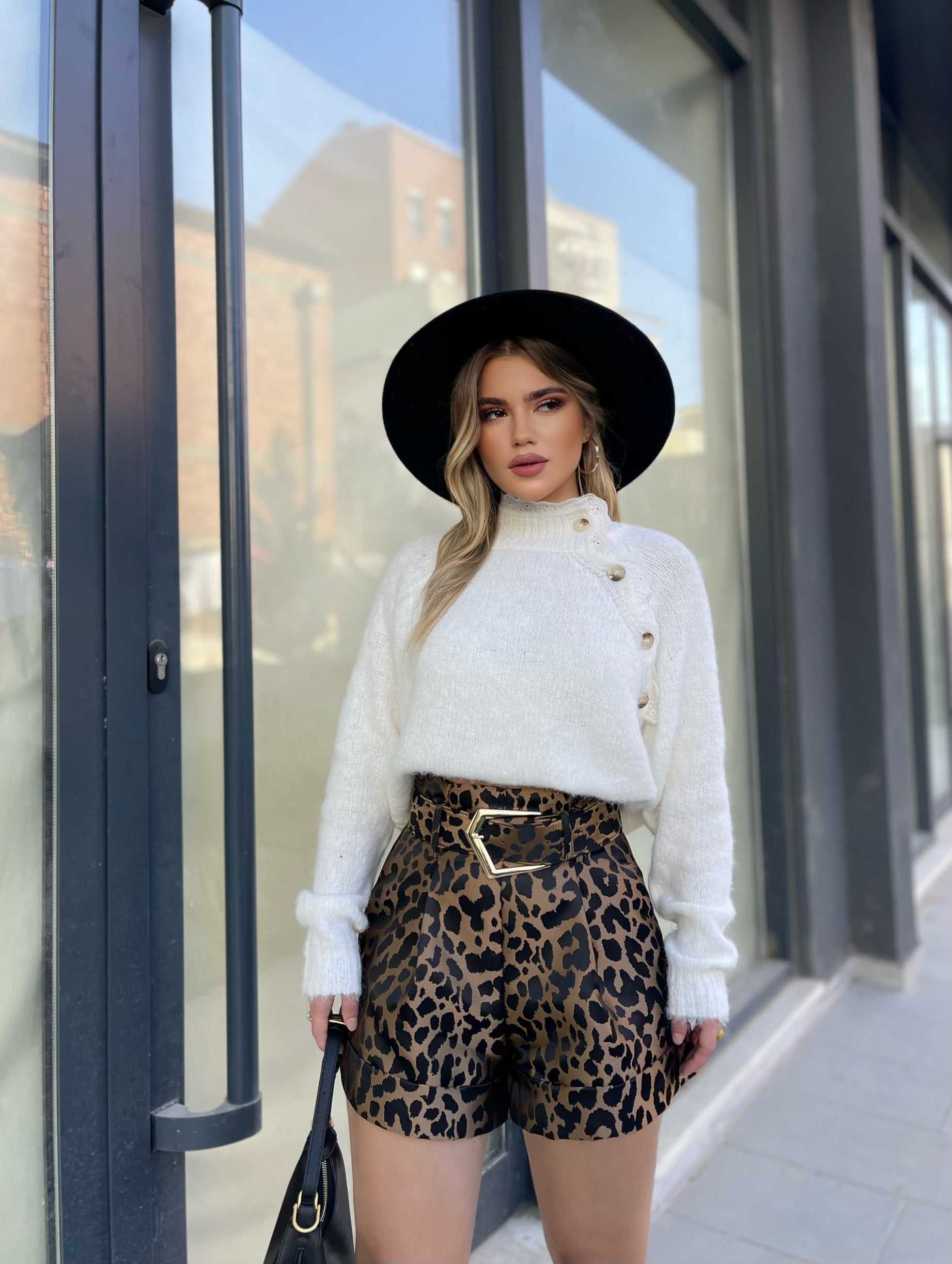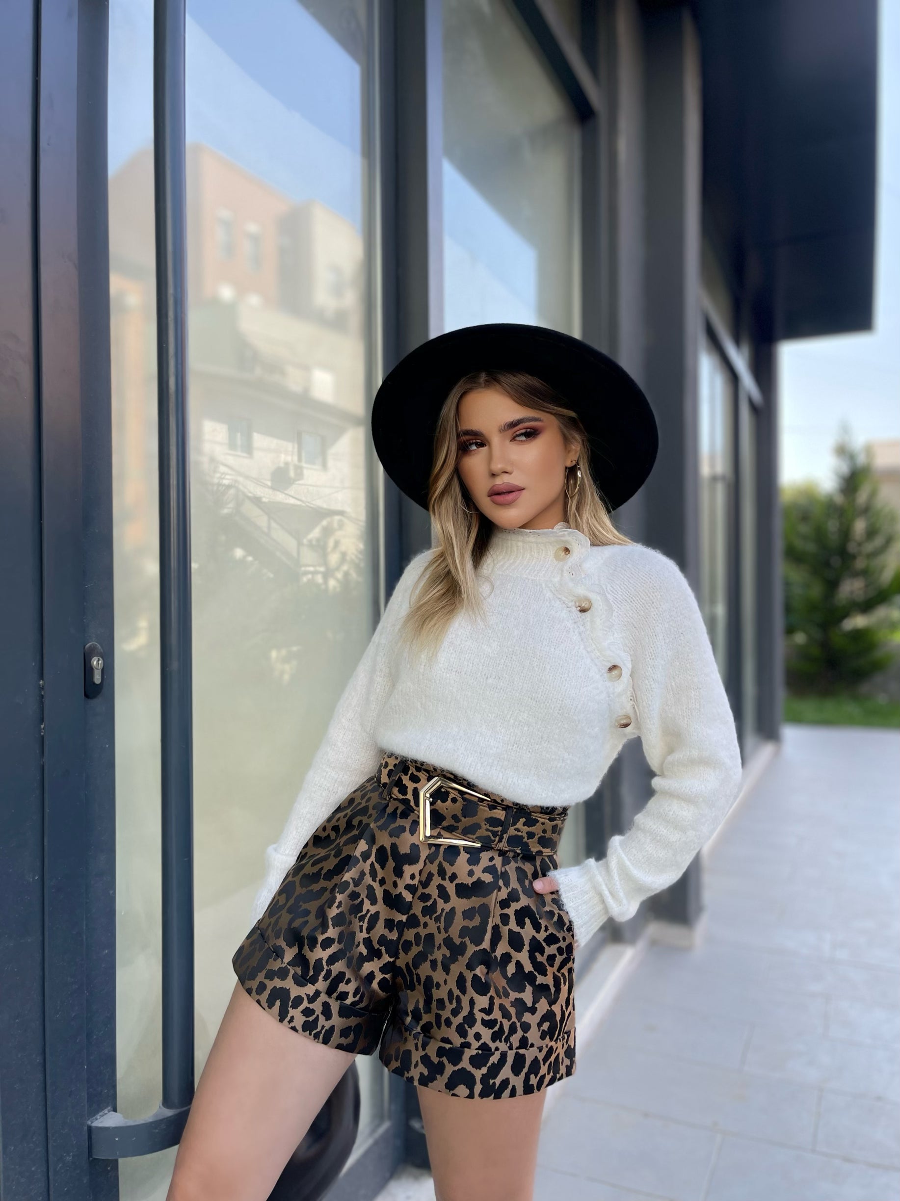 Pantallona te shkurtra me dizenjo leopard. Me penca ne pjesen e perparme dhe xhepa te bollshem. Pantallonat jane me rrip ne pjesen e belit. Pjesa e poshtme eshte me tegel. Teper komode dhe te kombinueshme.
