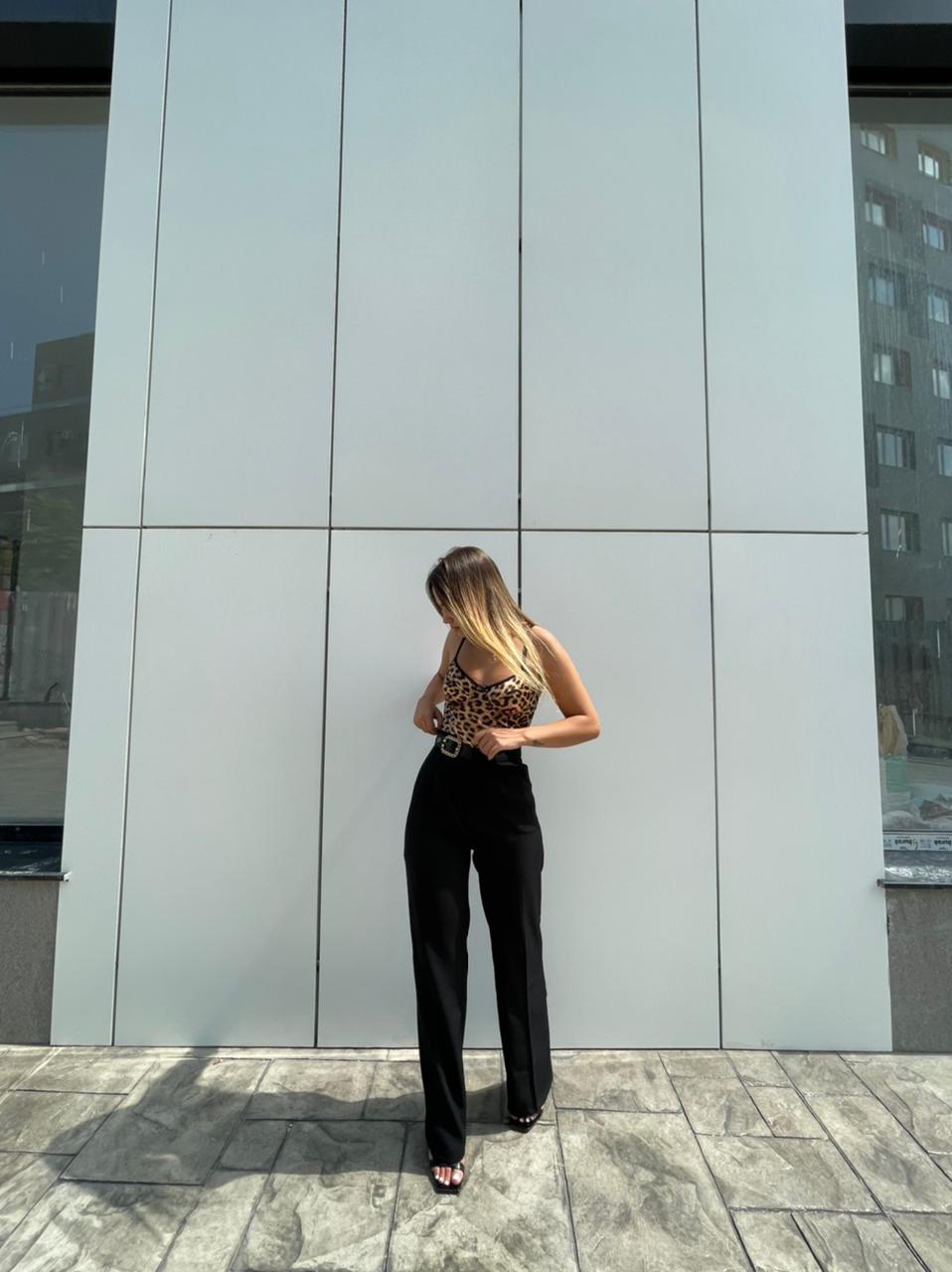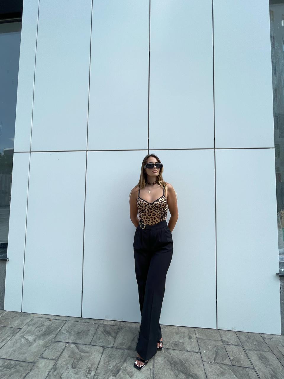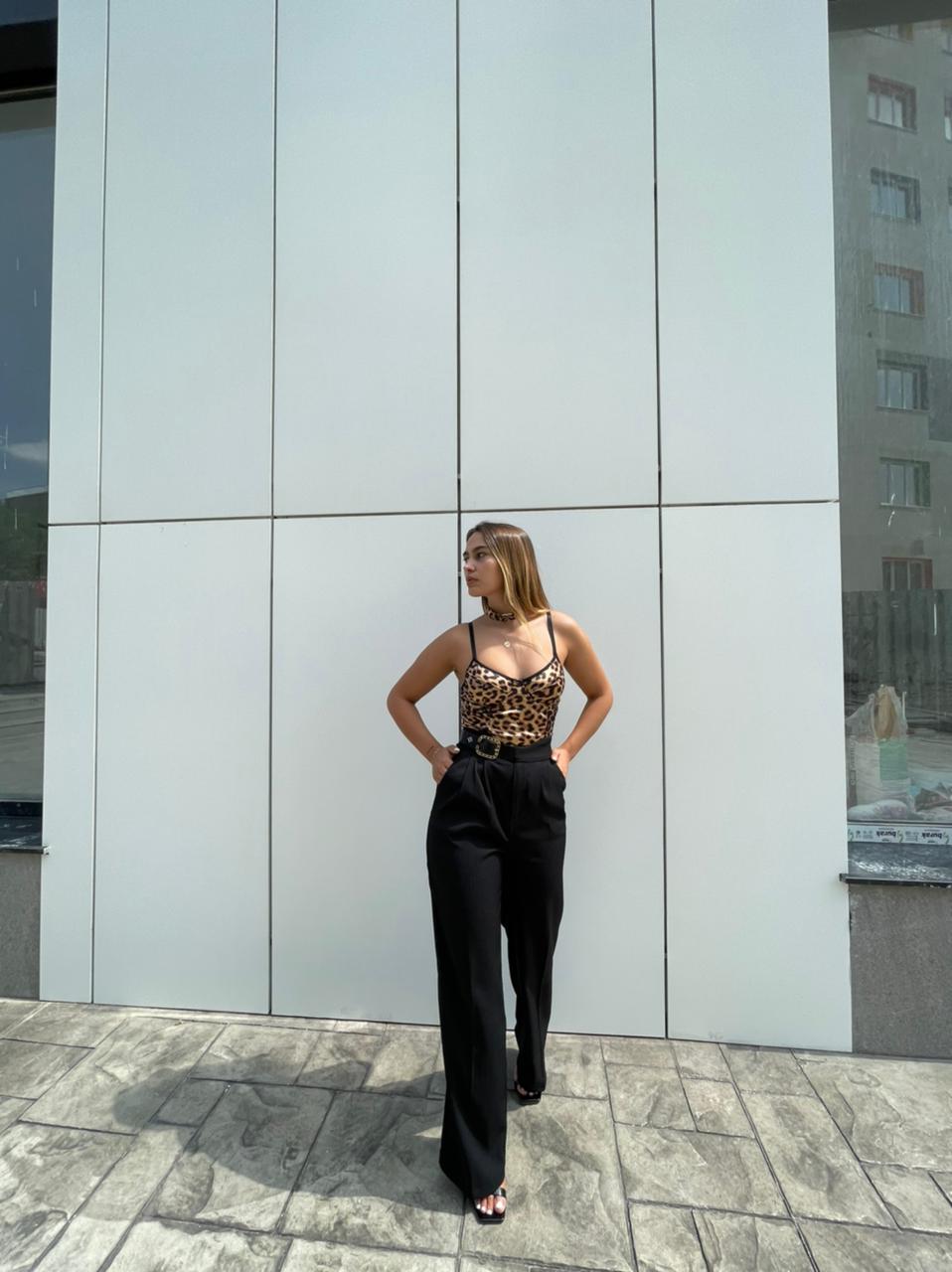 Pantallona te zeza me rrip me togez me gure. Pantallona te gjata me bel te larte. Me xhepa te bollshem. Mberthimi behet me zinxhir dhe kops ne pjesen e perparme.