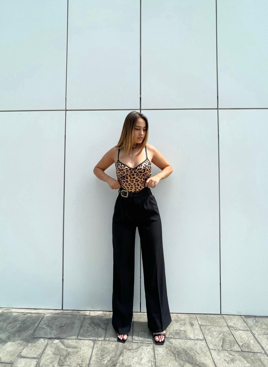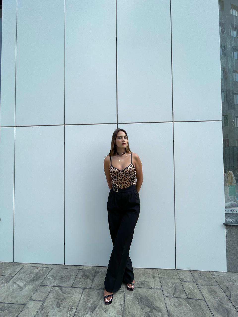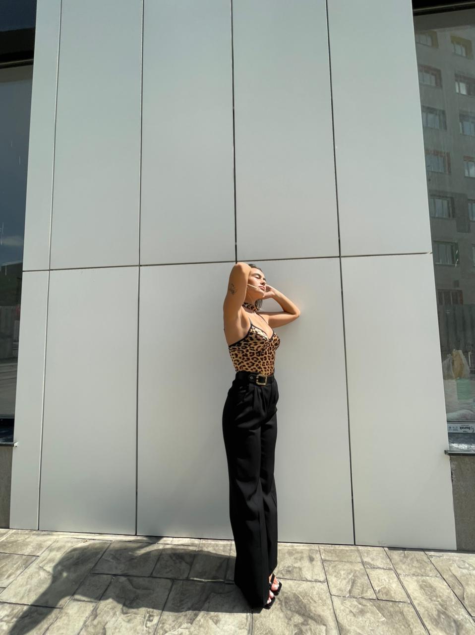 Pantallona te zeza me rrip me togez me gure. Pantallona te gjata me bel te larte. Me xhepa te bollshem. Mberthimi behet me zinxhir dhe kops ne pjesen e perparme.