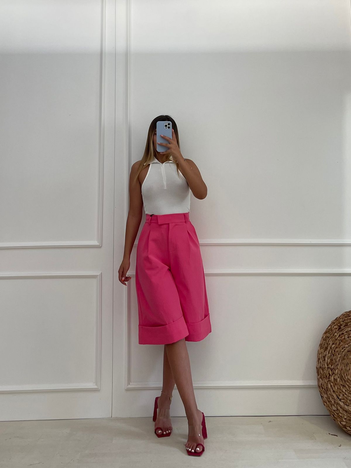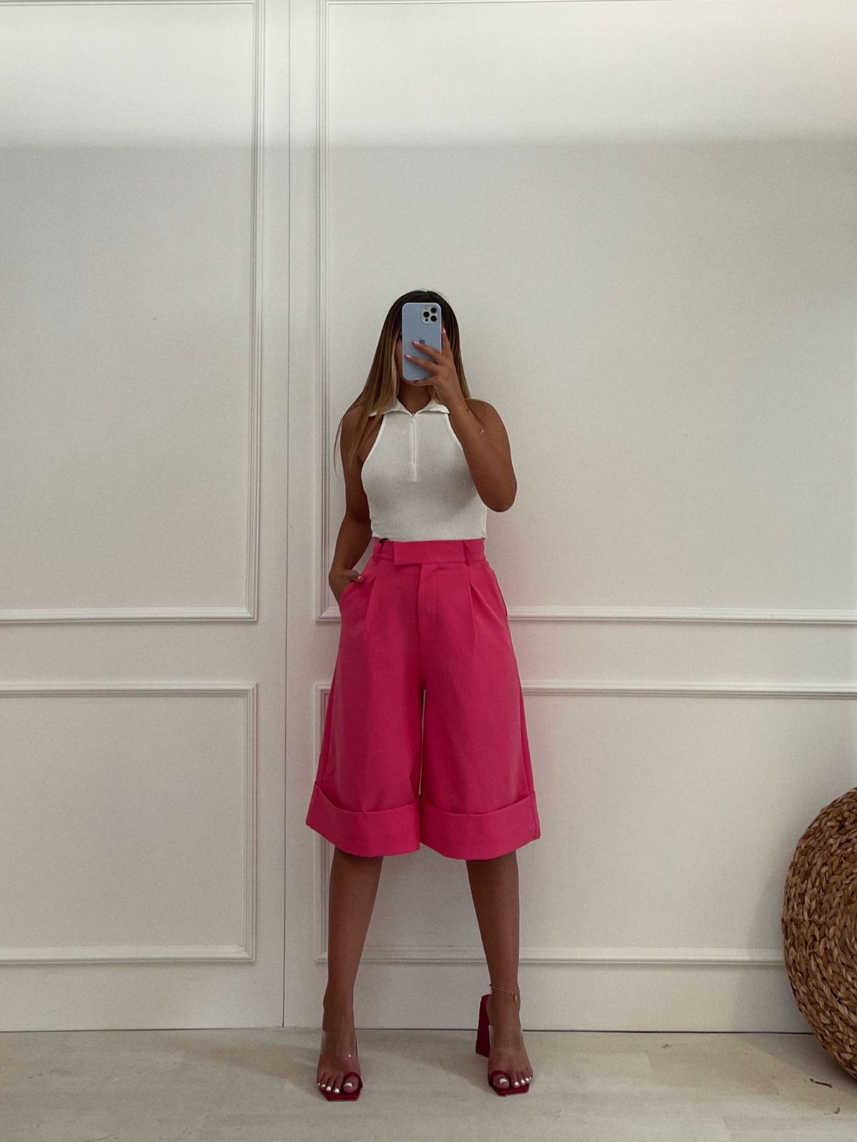 Pantallona trecerekshe roze. Super stil, te kthyera te gjuri. Me xhepa anash, te gjera.