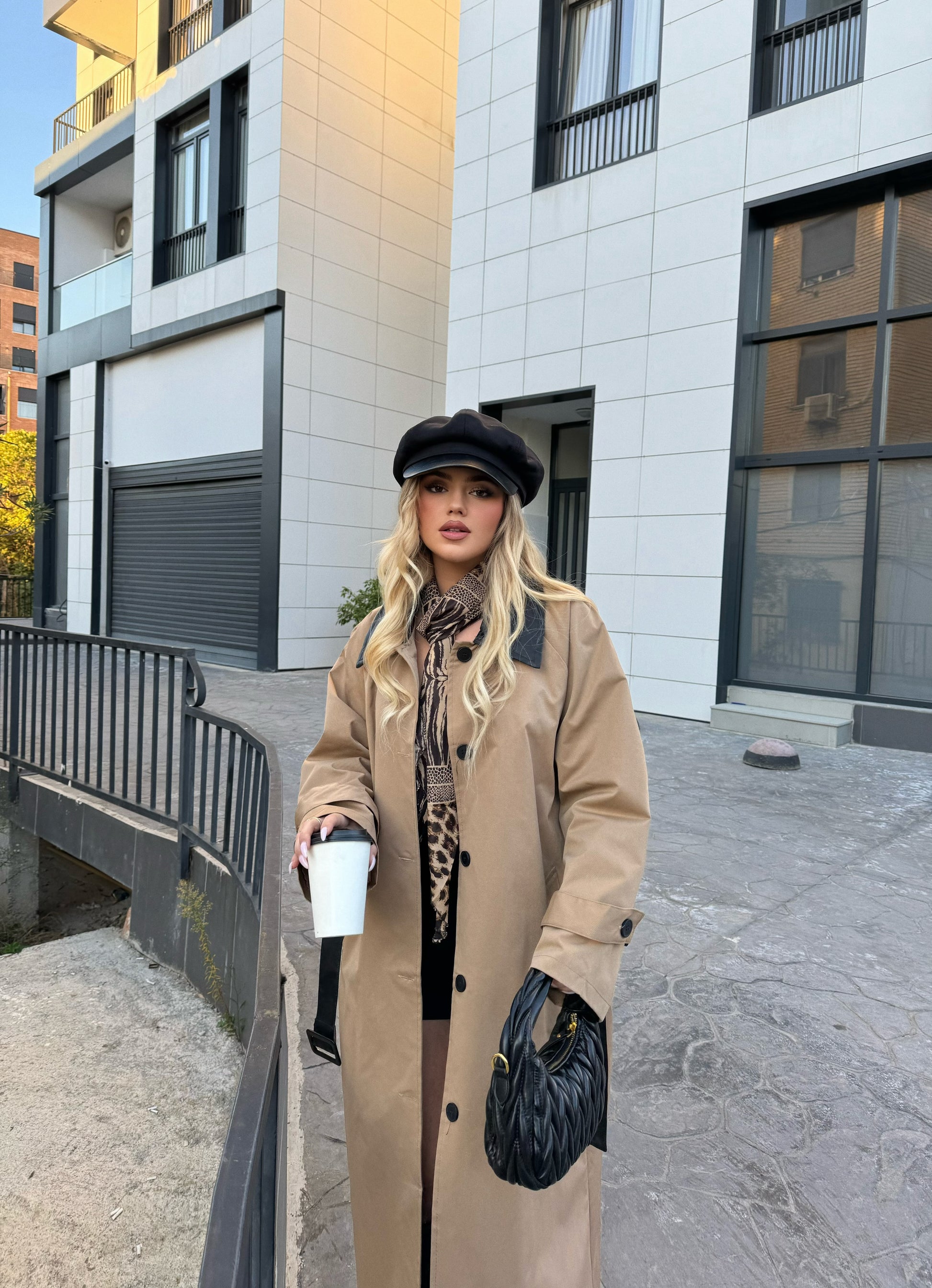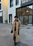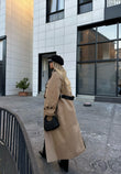Pallto bezhe. Ideale per sezonin vjen ne material te plote dhe praktik per cdo dite. Ka detajet e jakes prej lekure, kopsave ne ngjyre te zeze dhe rripit klasik.