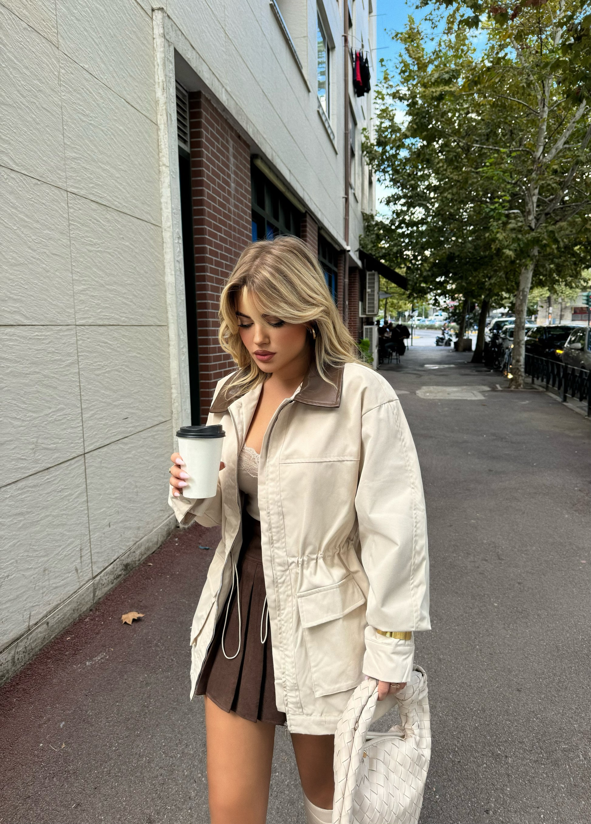 Pardesy e shkurter me jake ne material lekure. Mund te ngushtohet tek pjesa e belit. Mbyllet me zinxhir. Ka xhepa te medhenj perpara. Me astar brenda.